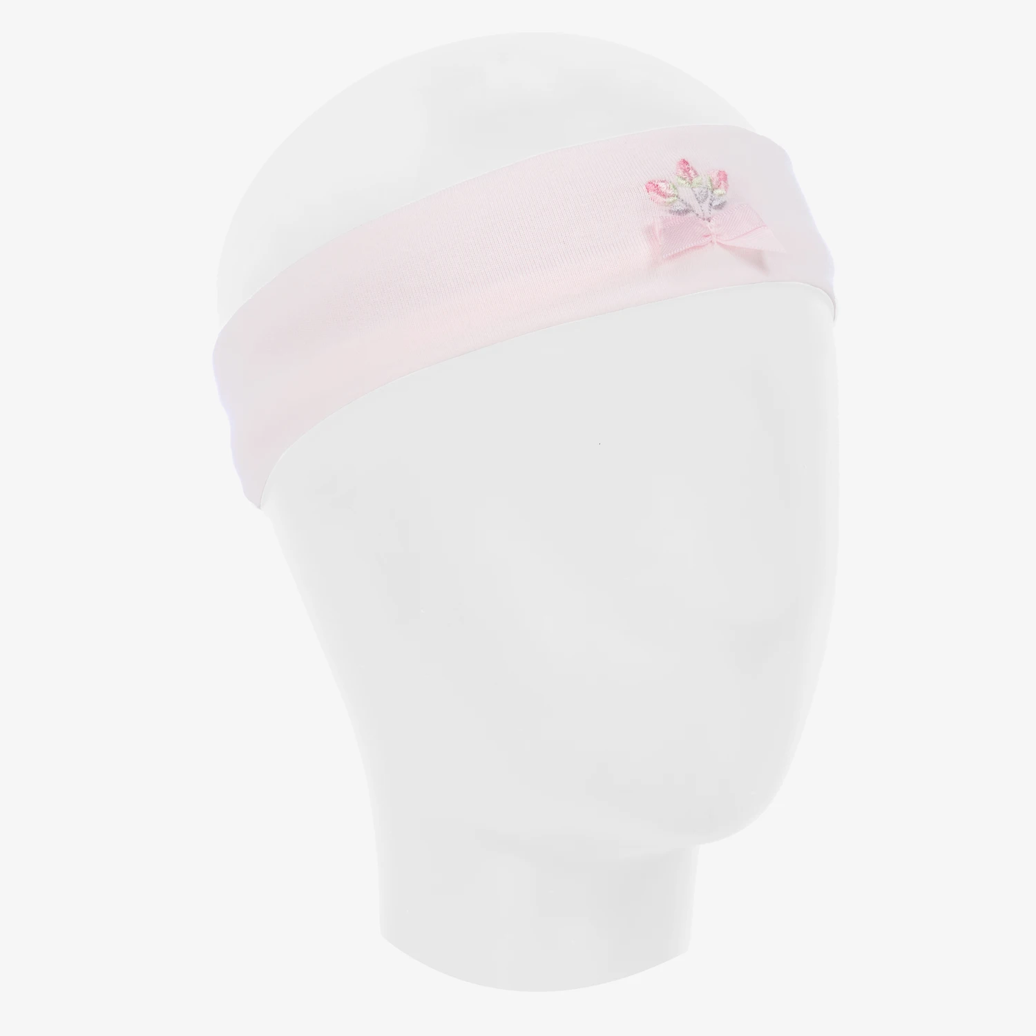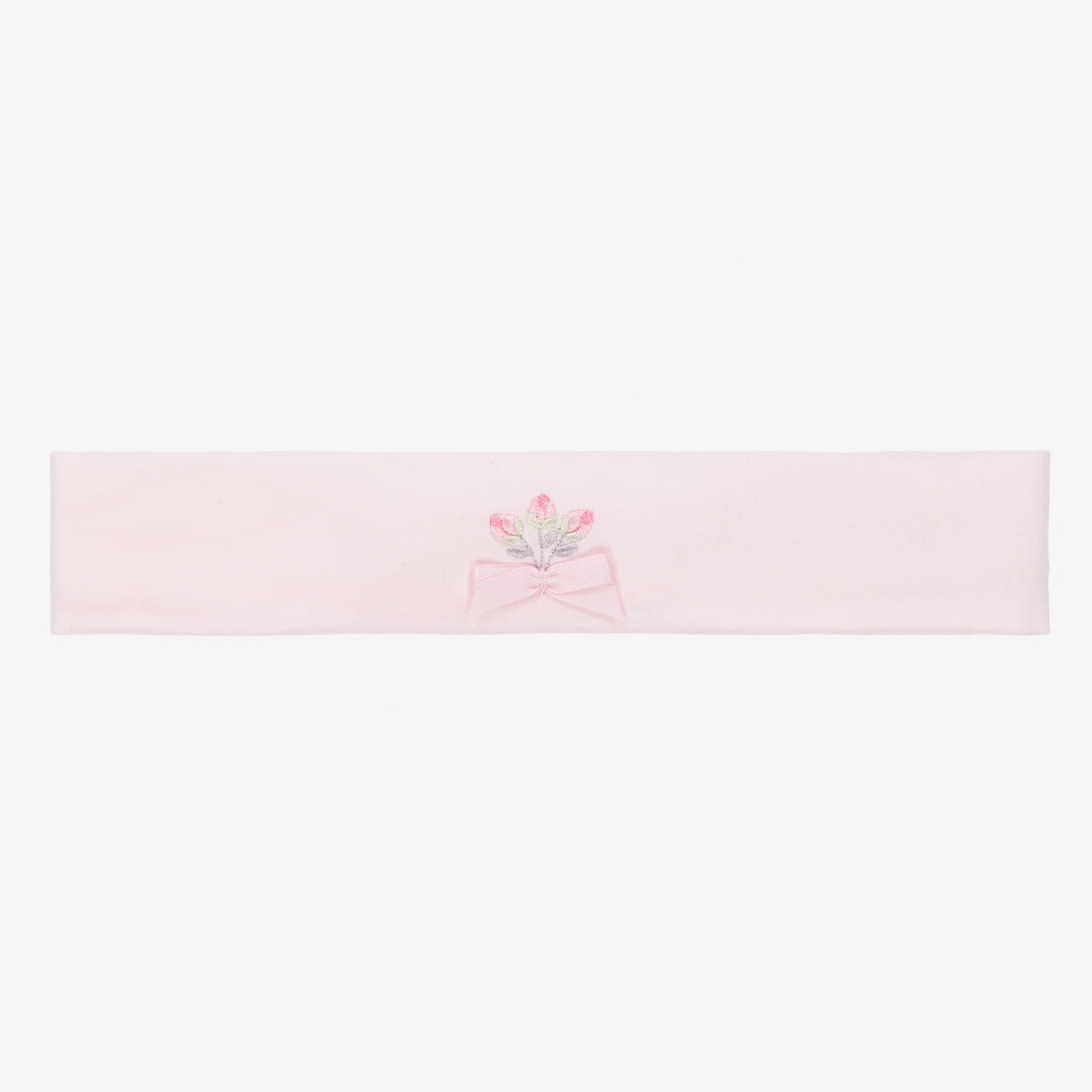 An adorable pale pink headband for baby girls, by Emile et Rose. Made in the softest cotton jersey, this accessory is delicate on little heads, with a comfortably elasticated back. It has a beautiful floral embroidery, with a tiny satin bow above.