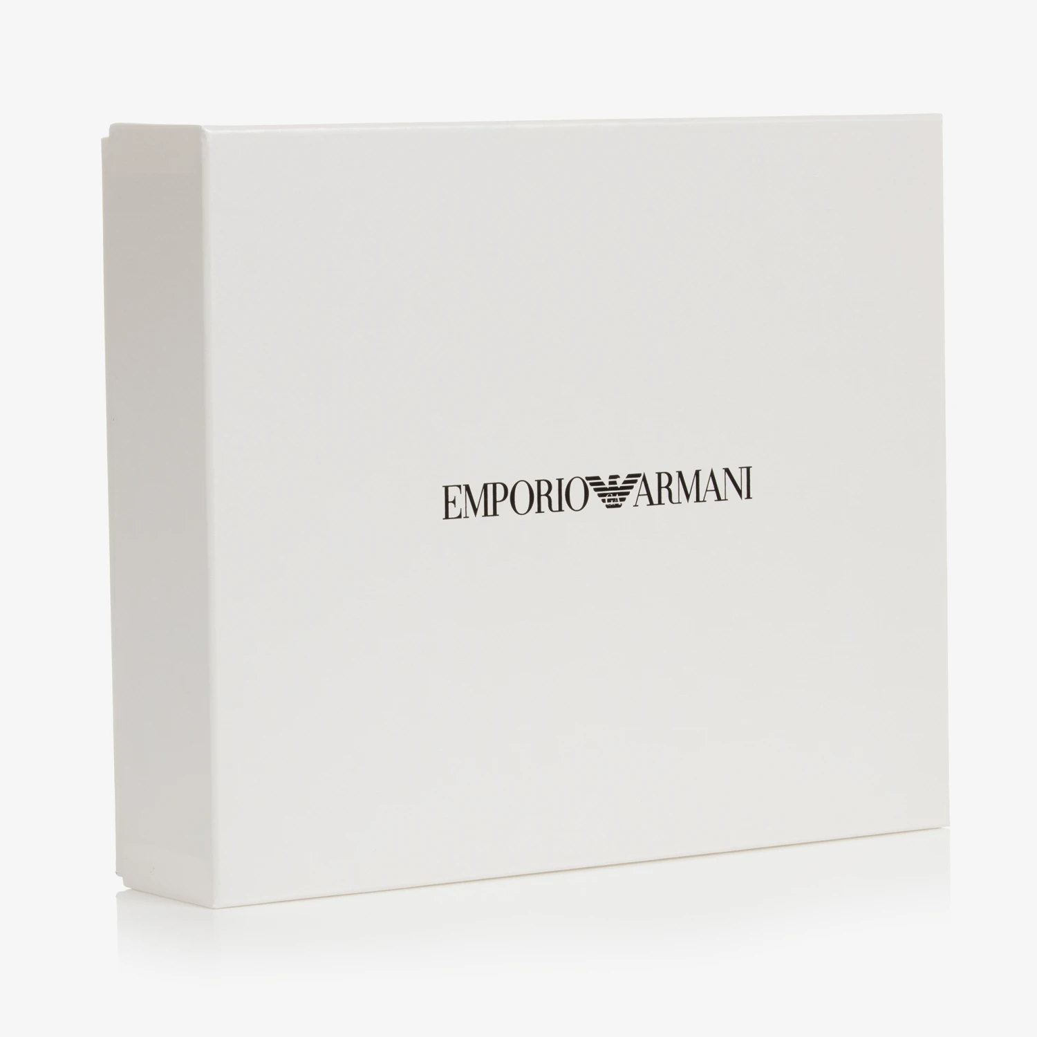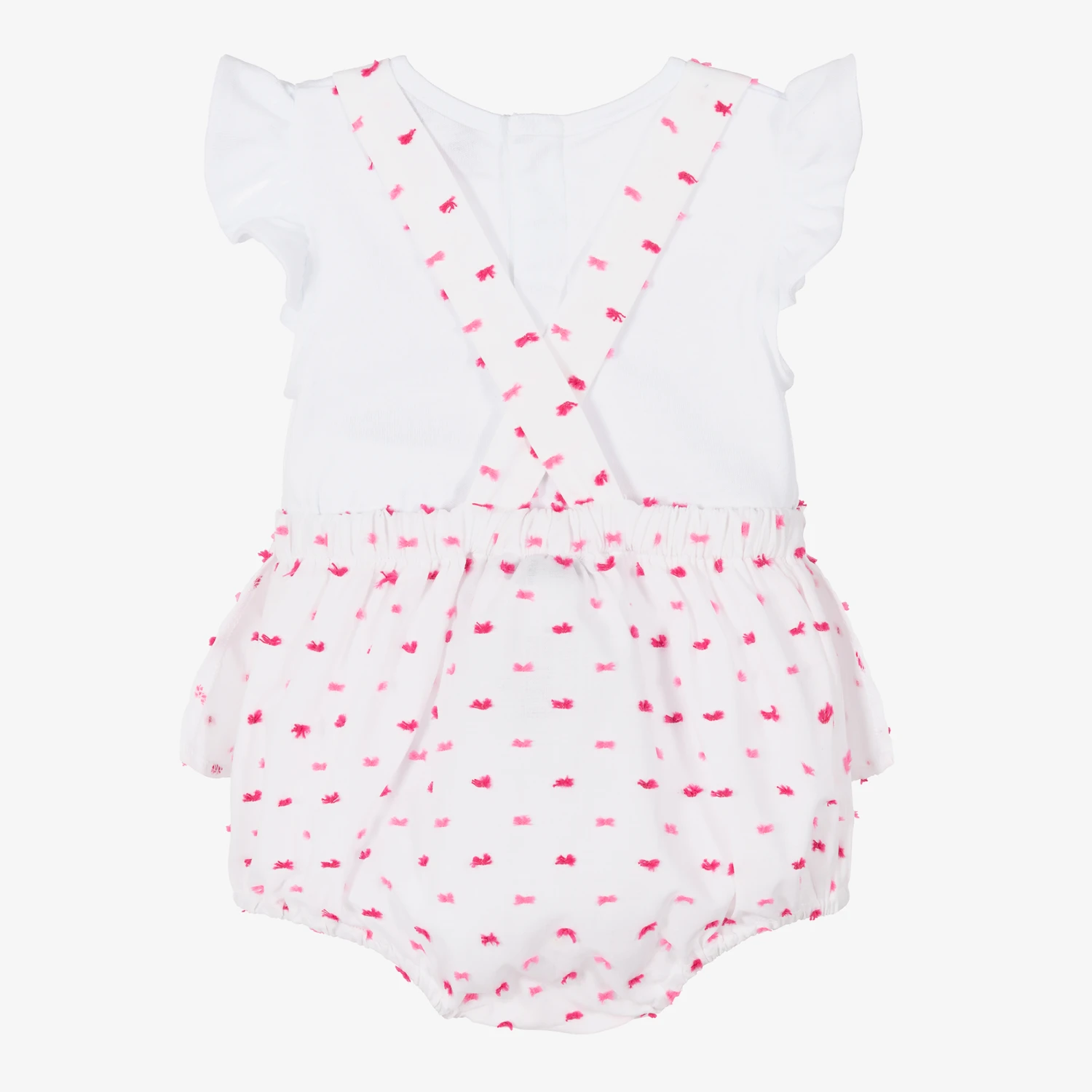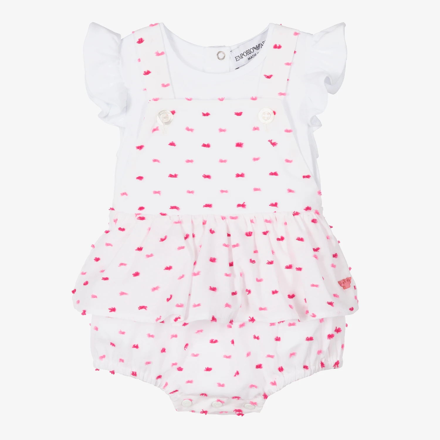 Baby girls white dungarees set by Emporio Armani, woven in lightweight cotton. Embroidered with a tonal pink thread, the shortie has a girly ruffle trim and button fastening straps. The ruffle has a pink Eagle logo charm and there are poppers between the legs for easy dressing. It comes with a plain white bodyvest with ruffle sleeves and popper fastenings to complete the cute set.