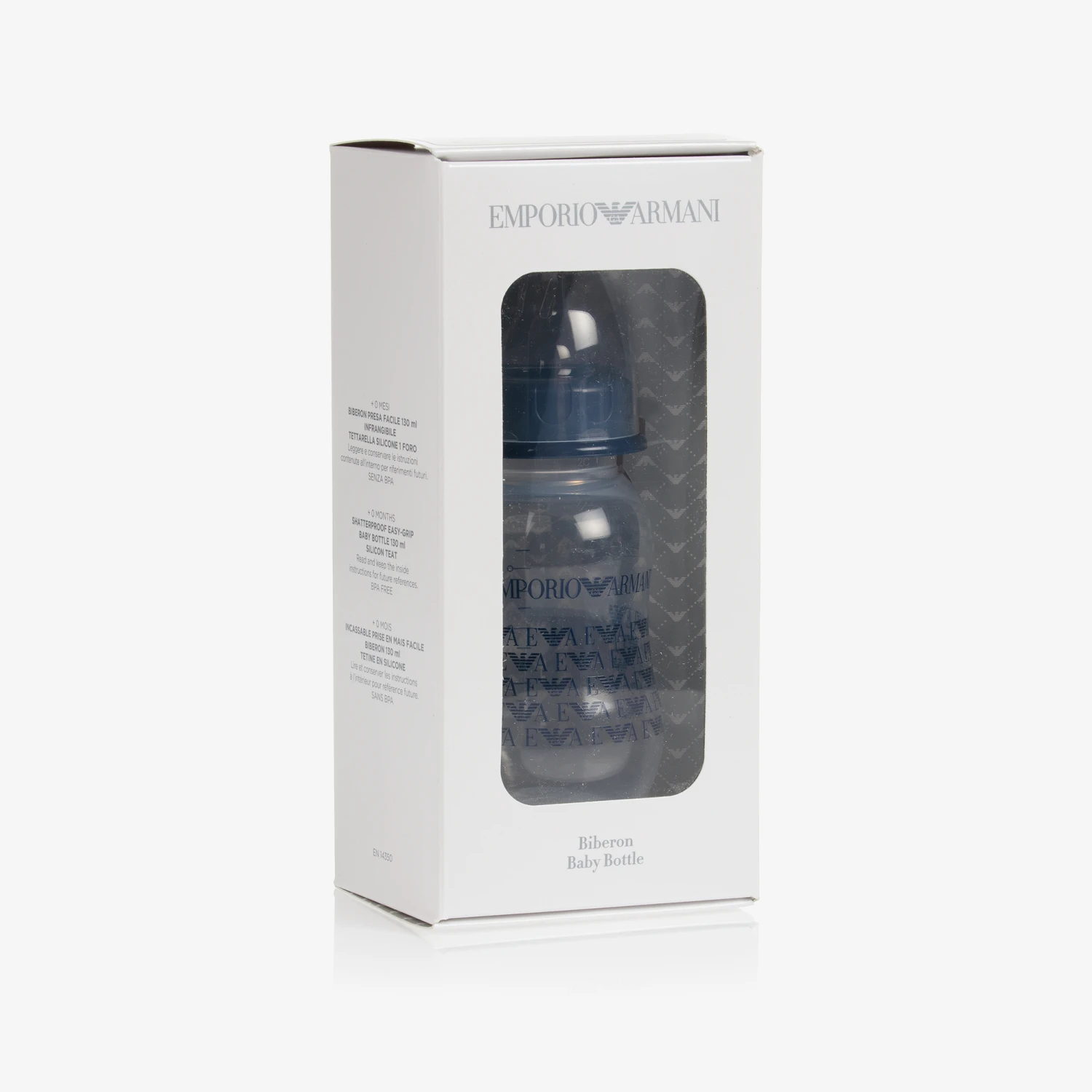 Shatterproof navy blue baby bottle for baby boys by Emporio Armani, with the designer’s signature Eagle print. The BPA-free bottle has a 130ml capacity, comes with a silicone teat, and has an easy-grip design.