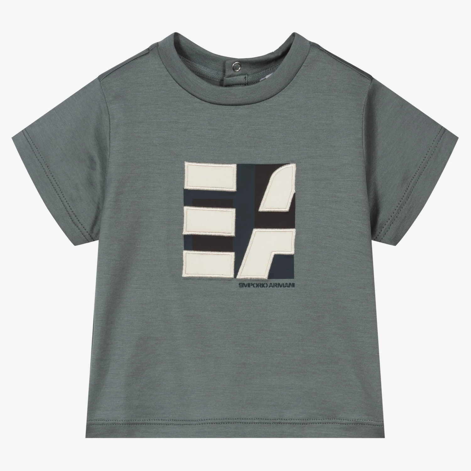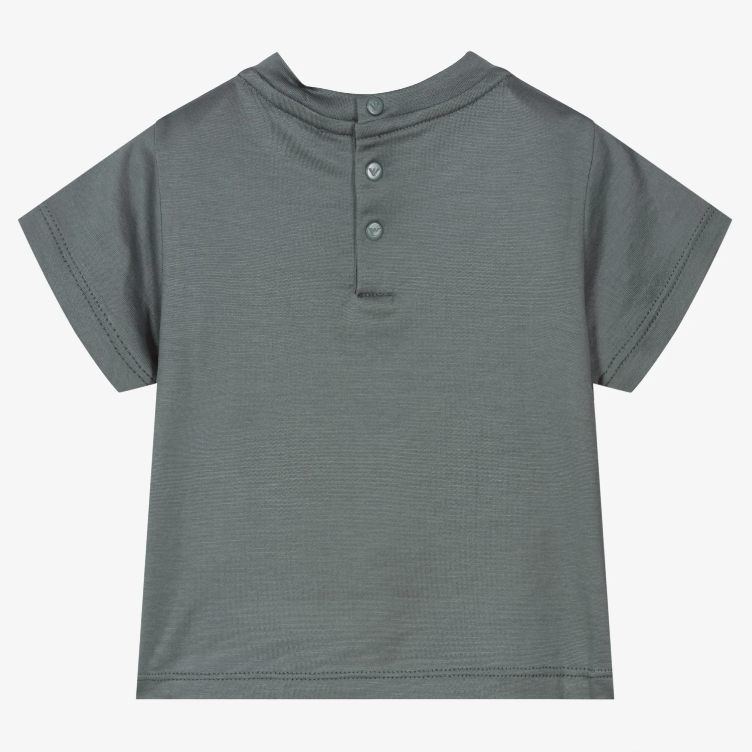 Blue grey T-shirt for baby boys by Emporio Armani, made in super soft and stretchy lyocell jersey. It has an ivory and tonal blue logo on the front, both rubberised and embroidered, as well as popper fastenings on the back.