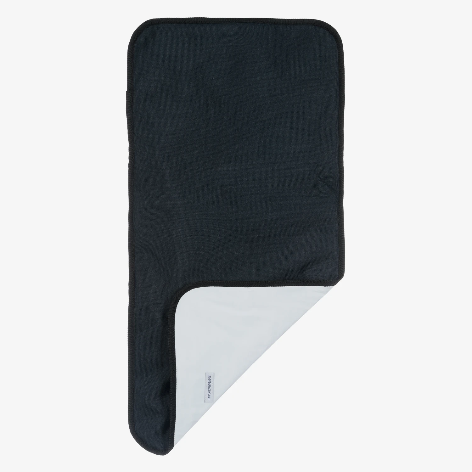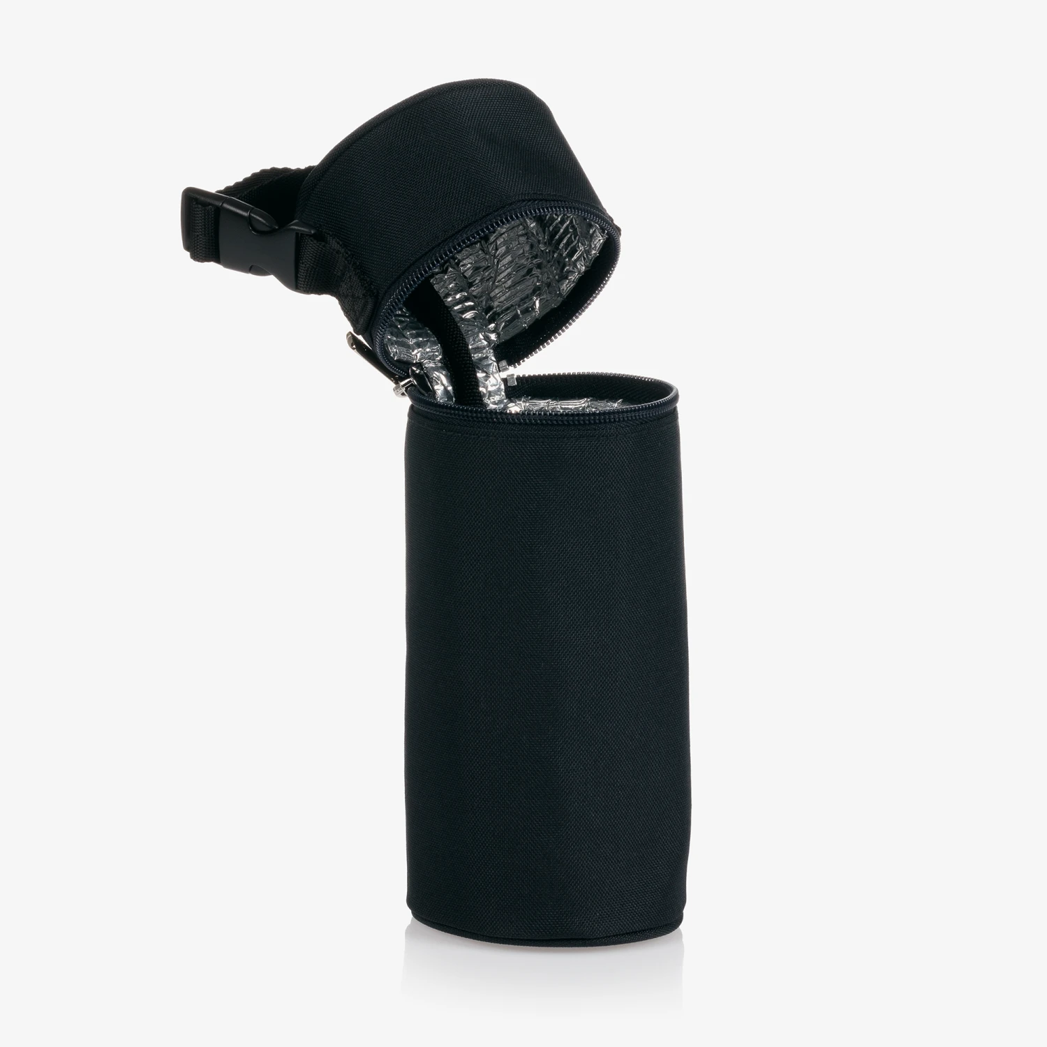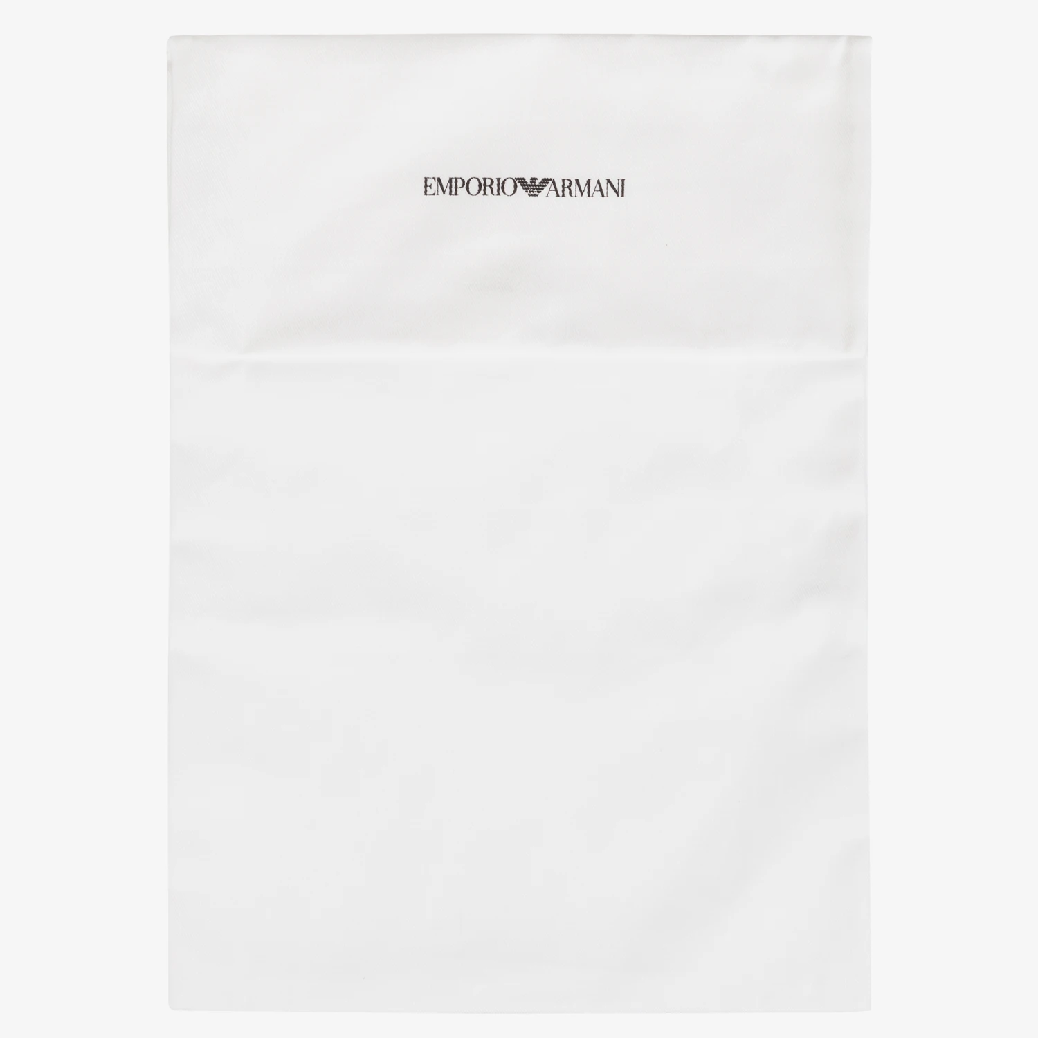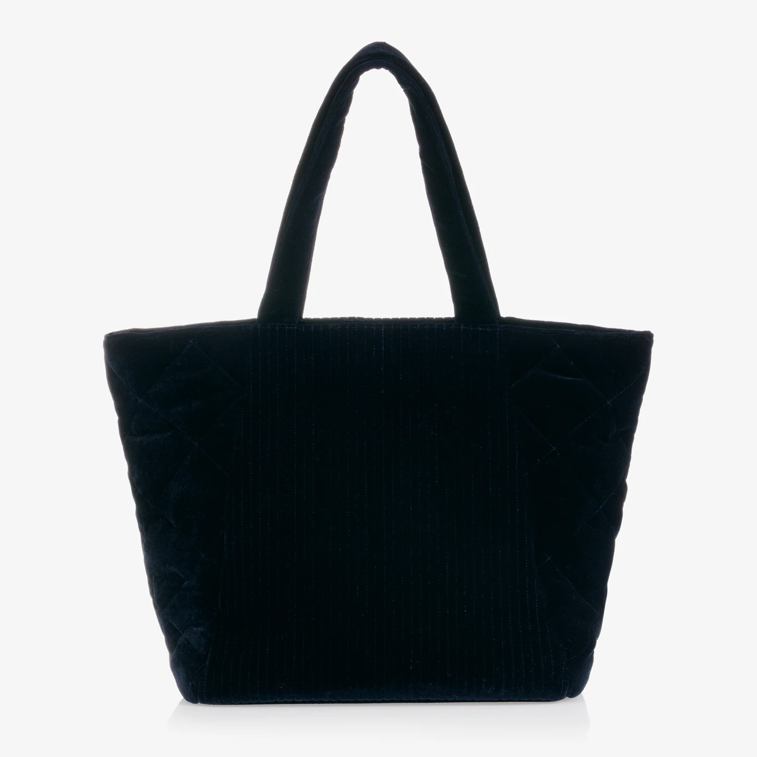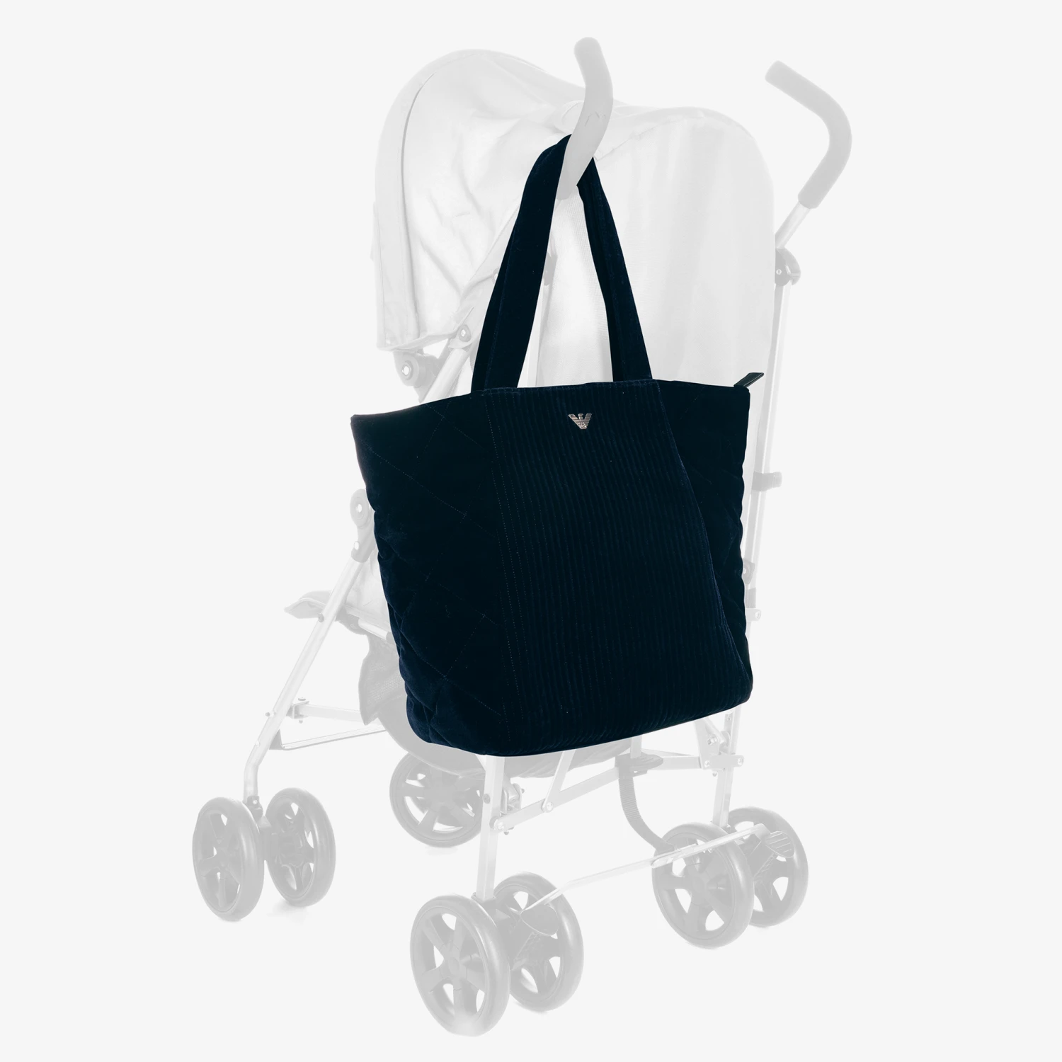 Stylish navy blue velvet changing bag by Emporio Armani, with ribbed trims and diamond shaped quilting. Trimmed with a shiny silver Eagle logo appliqué, it has a large zip-fastened compartment with internal pockets. It comes with a branded changing mat, and a useful, insulated bottle holder.