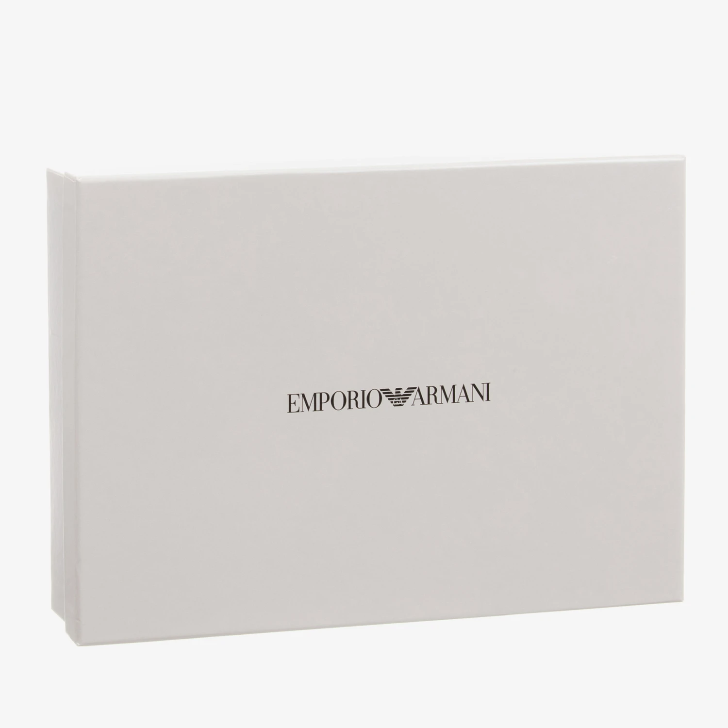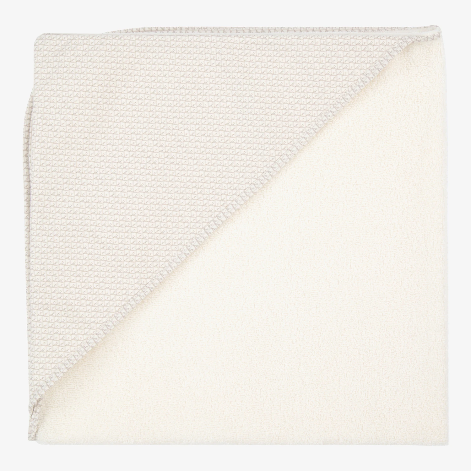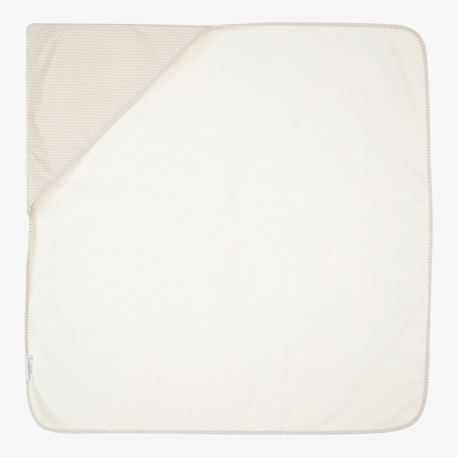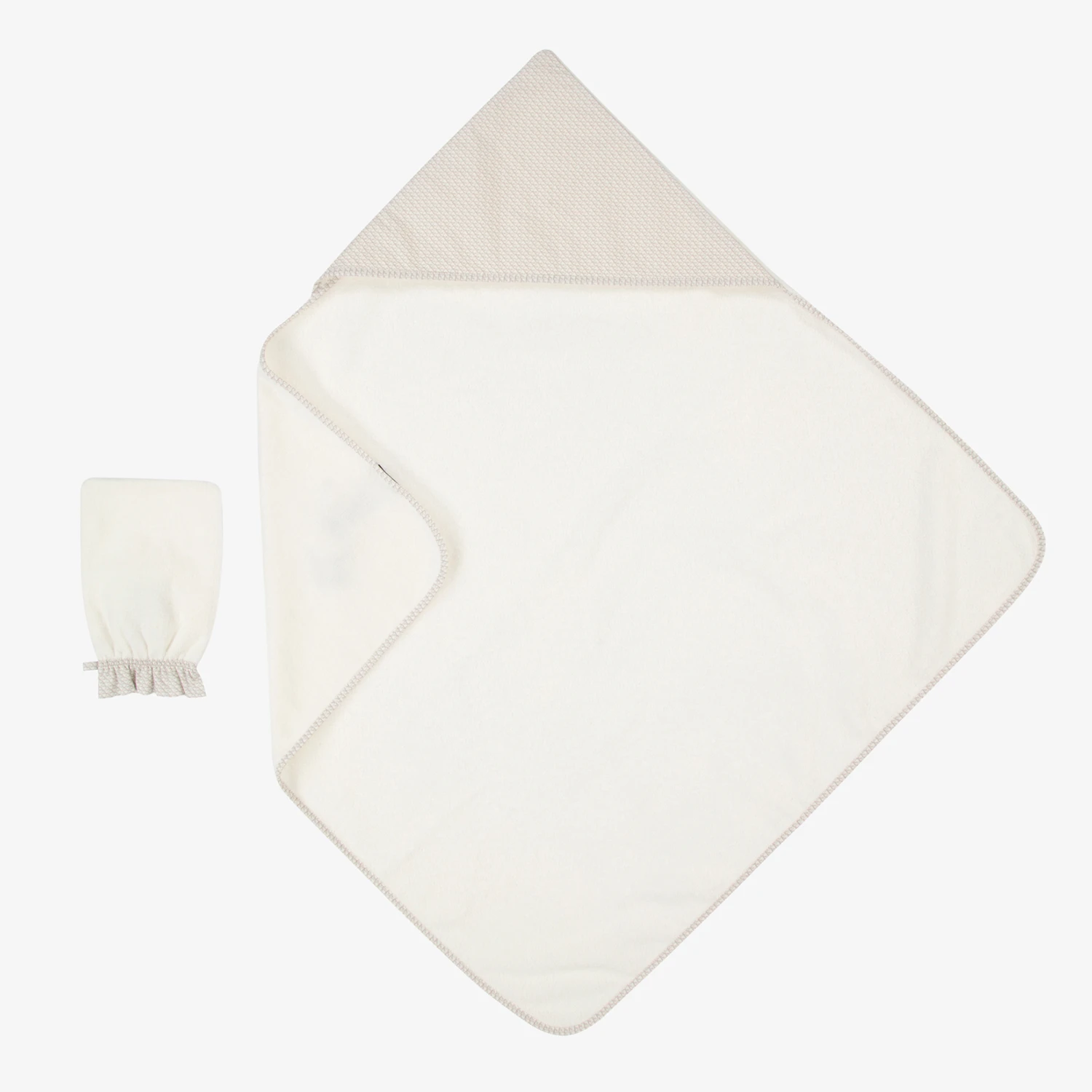 Ivory hooded cotton towel and wash mitt set for baby boys and girls by Emporio Armani, made in soft cotton velour on one side and absorbent cotton towelling on the reverse. Both pieces have an ivory and beige logo print trim, with a matching trim on the hood.