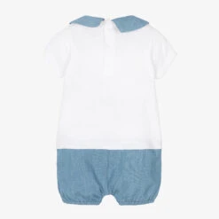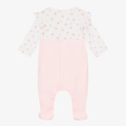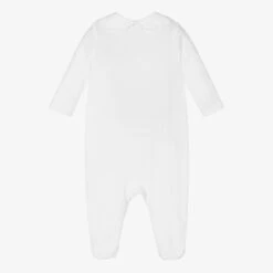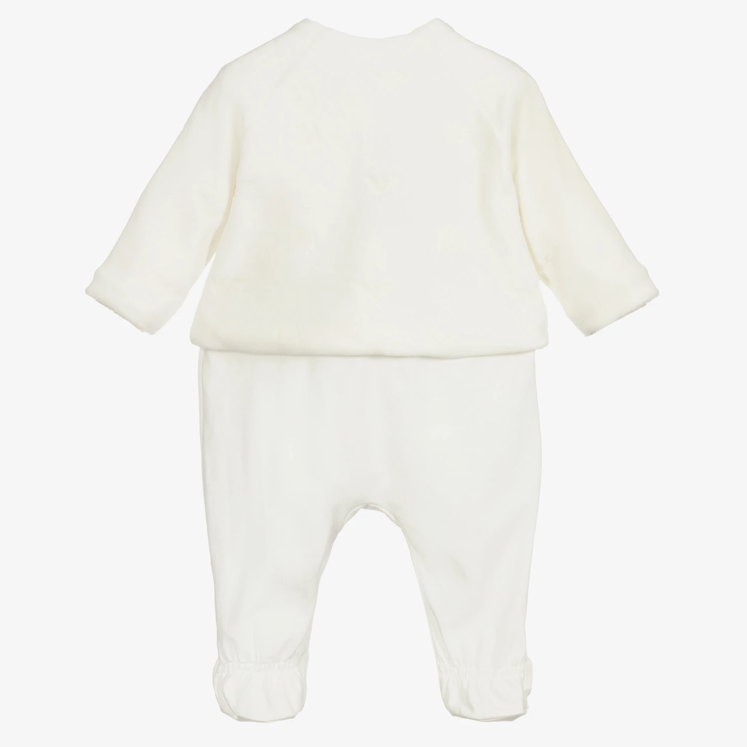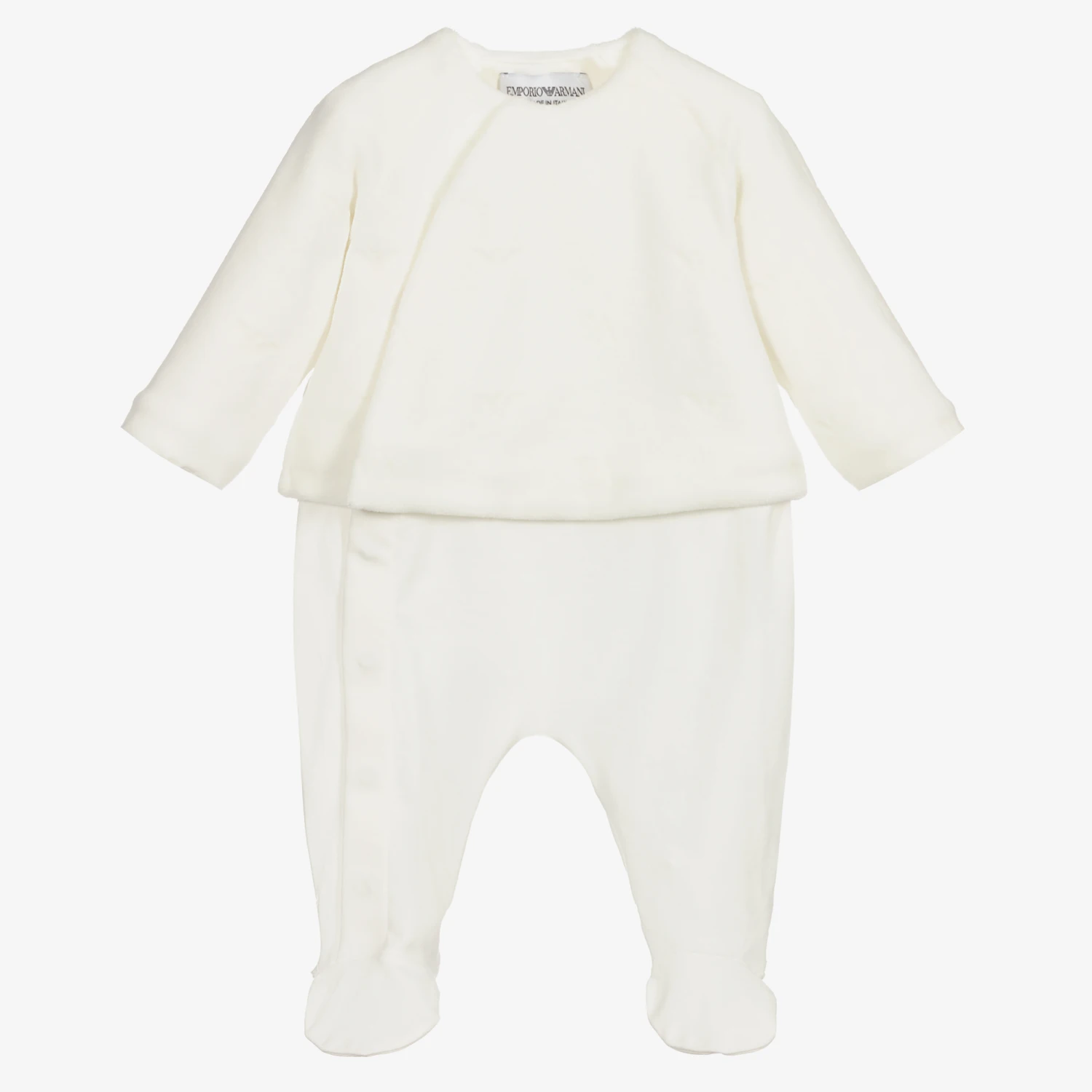 Suitable for both boys and girls, an ivory cotton babygrow by Emporio Armani. The top is made in soft velour with an embossed logo pattern and the bottoms are made in comfortable jersey. There are popper fastenings down the front.