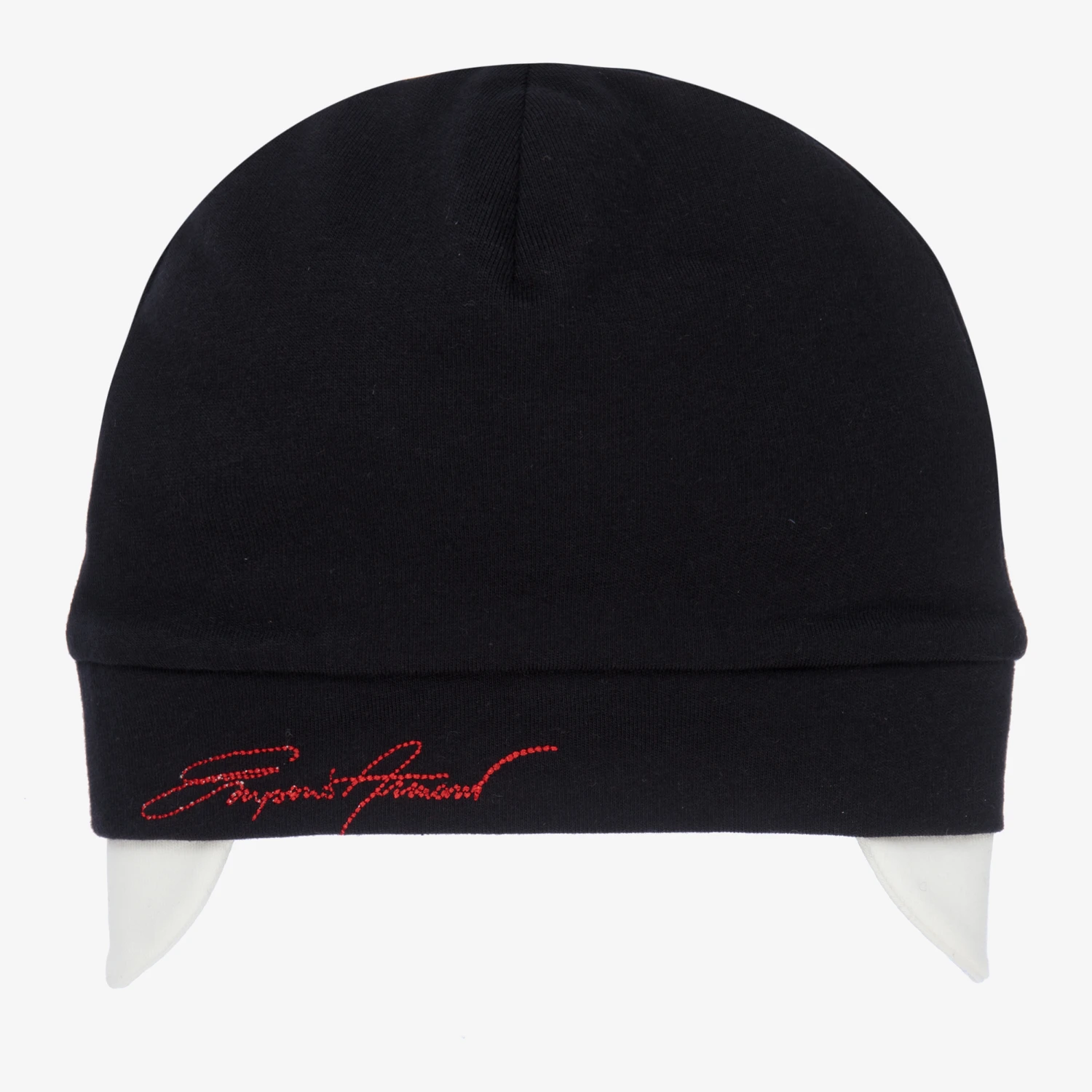 Adorable navy blue hat for baby boys and girls by Emporio Armani. Made in soft cotton jersey, it has a cute character design on the front in white embroidery with little ear flaps. The designer’s logo is embroidered in red on the back.