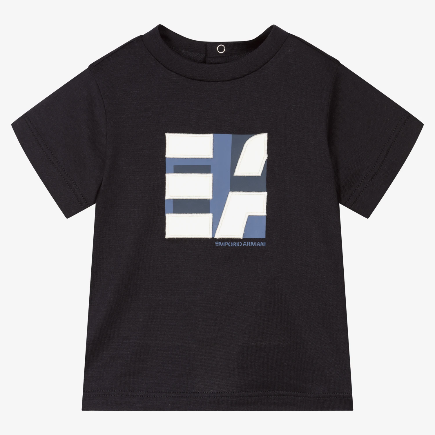Navy blue T-shirt for baby boys by Emporio Armani, made in super soft and stretchy lyocell jersey. It has an ivory and tonal blue logo on the front, both rubberised and embroidered, as well as popper fastenings on the back.