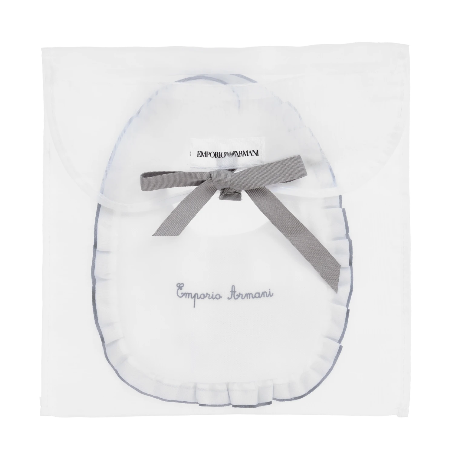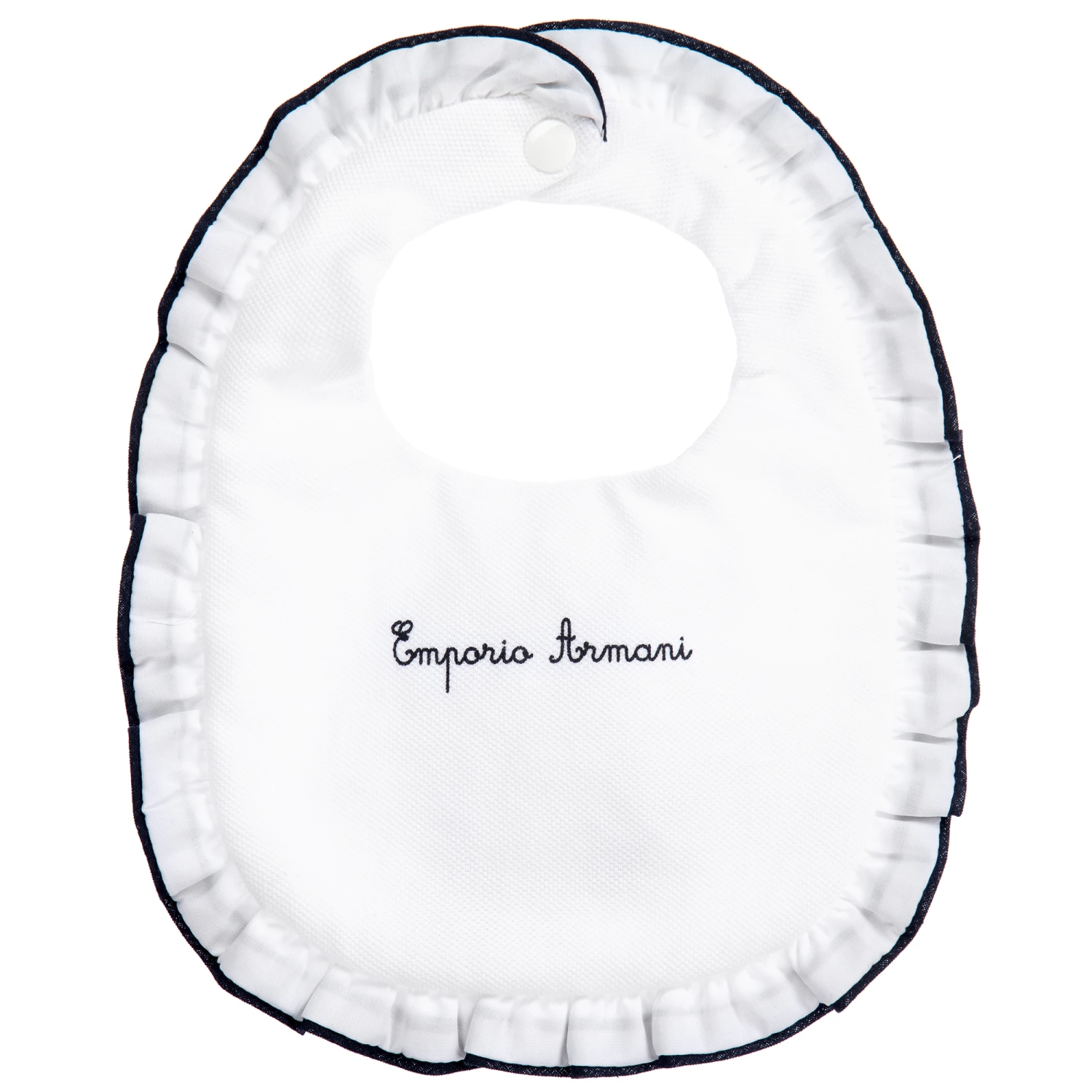 Baby girls bib in off-white cotton piqué by Emporio Armani. It has sweet cotton ruffles with a navy blue trim and logo print on the front. It fastens with an adjustable popper and has a soft cotton lining.