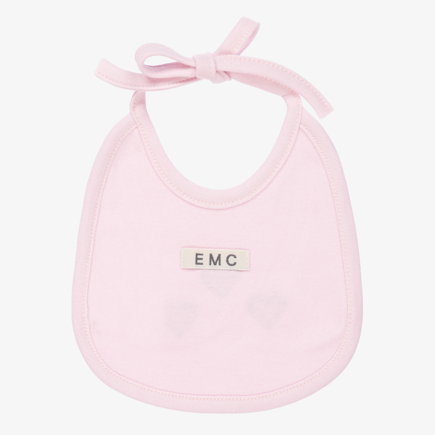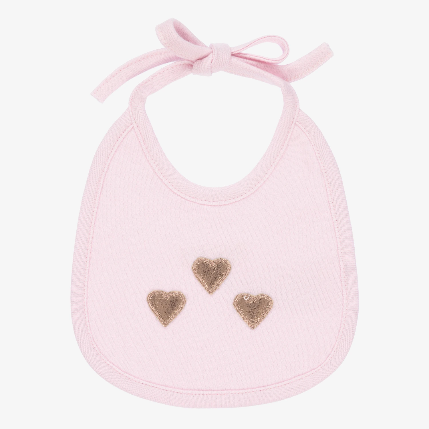 From Everything Must Change, a sweet pink bib for baby girls. Made in a double layer of soft cotton jersey, it has gold heart appliqués and fastens with a tie.