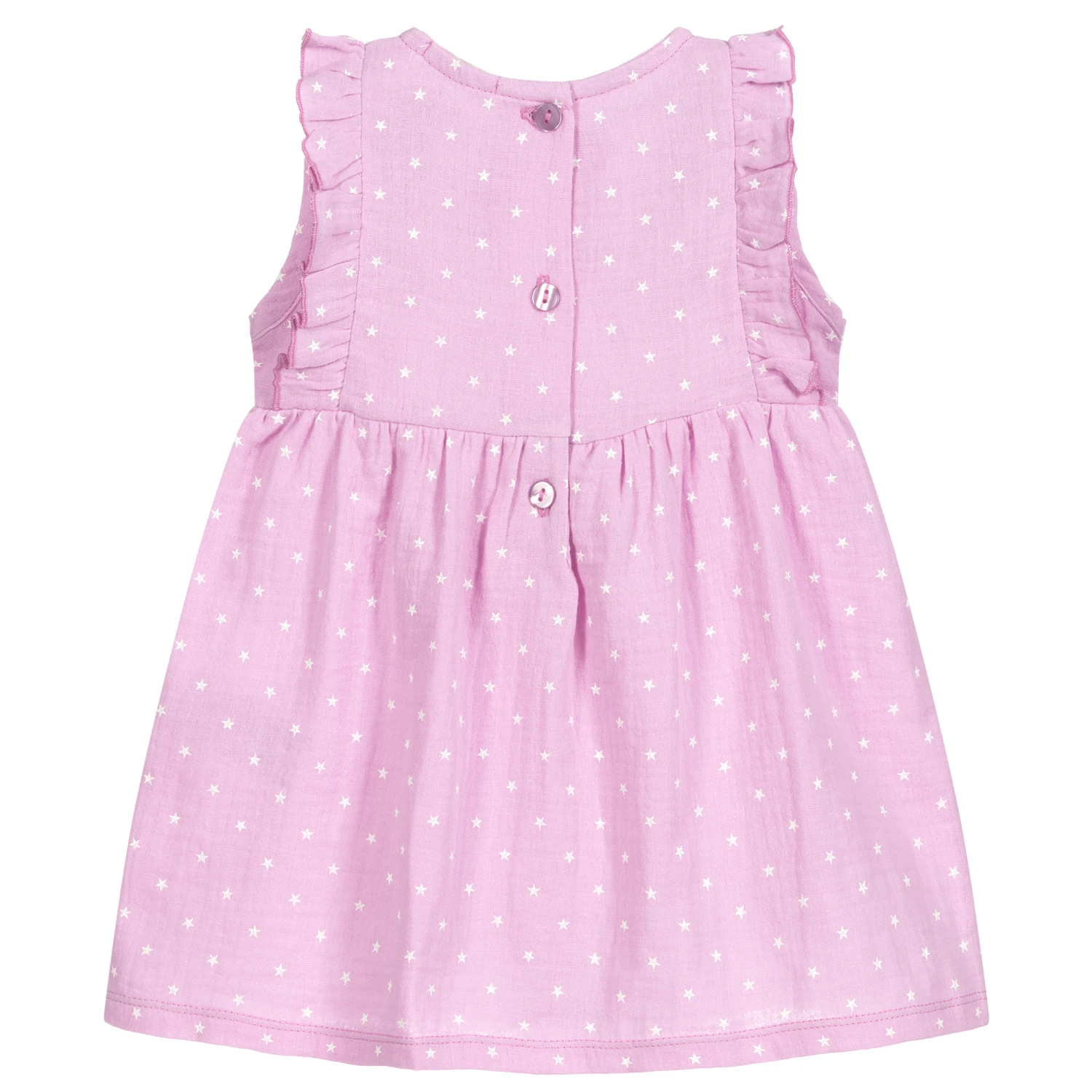 Purple-pink dress for baby girls by Everything Must Change. It is made in lightweight cotton, with ruffles and a white star pattern.