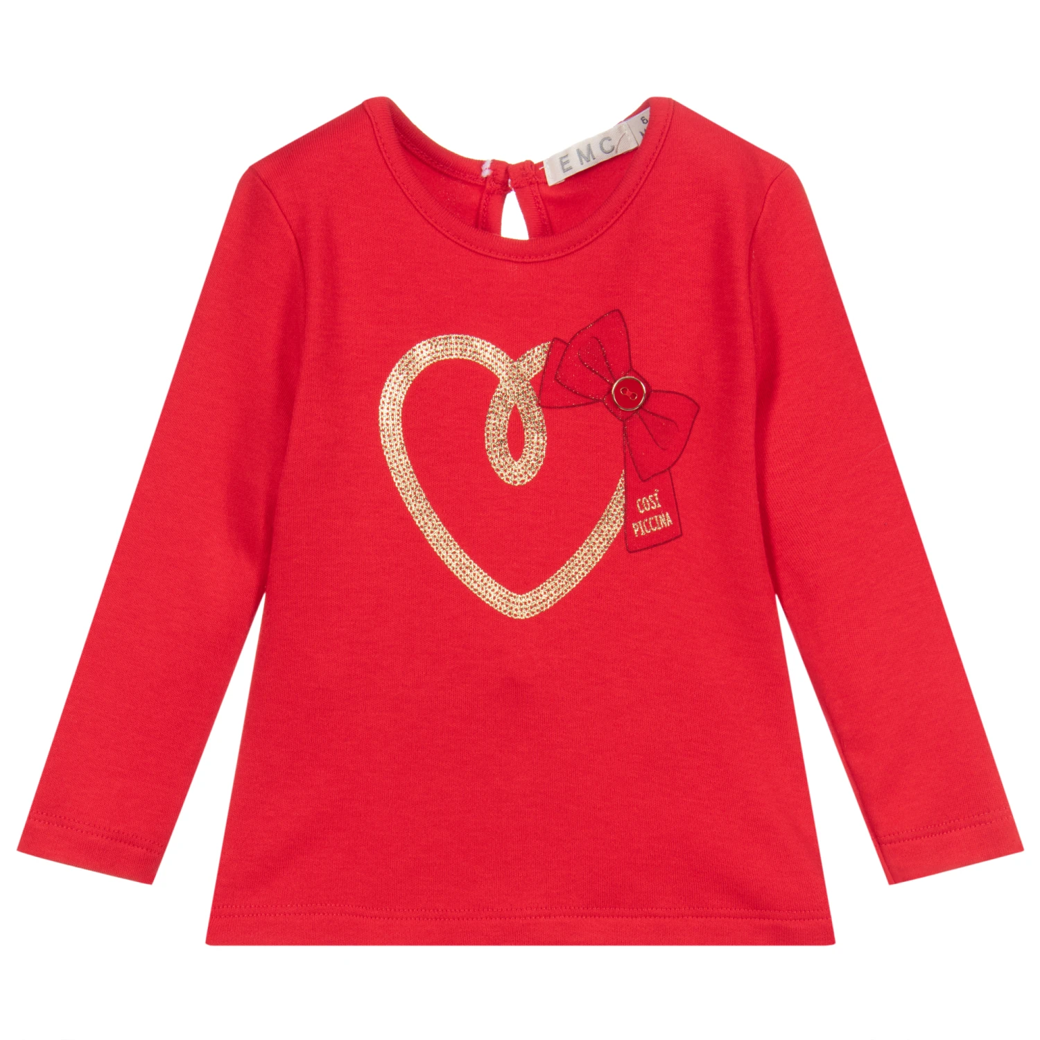Red top for baby girls by Everything Must Change, made in soft cotton jersey. It has a gold heart and red bow print on the front, with a red button trim.