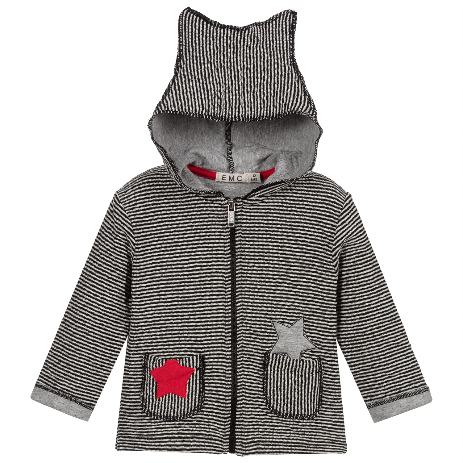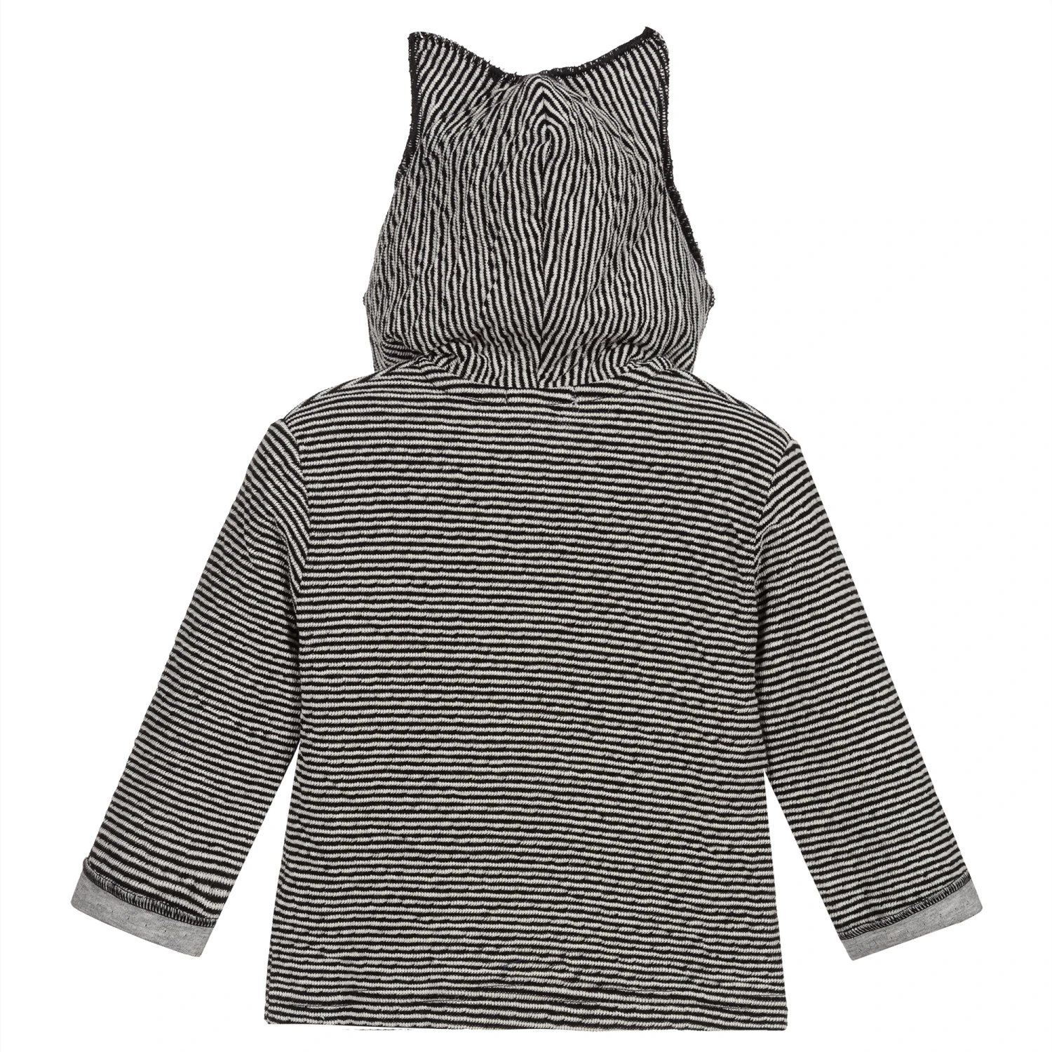Black and white striped, hooded zip-up top for baby boys and girls by Everything Must Change. Made in soft knitted jersey, with a smooth jersey lining, it has patch pockets on the front with red and grey star appliqués.