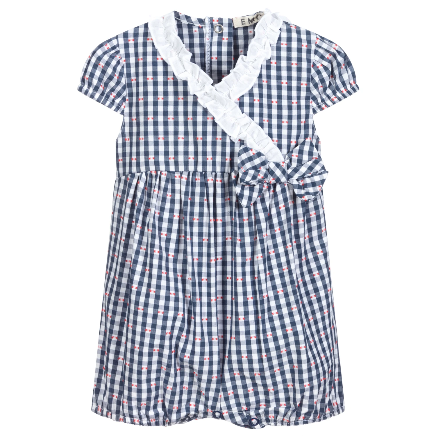 Navy blue and white check shortie for baby girls by Everything Must Change. It has a white ruffle trim, with a fixed bow in matching blue and white check.