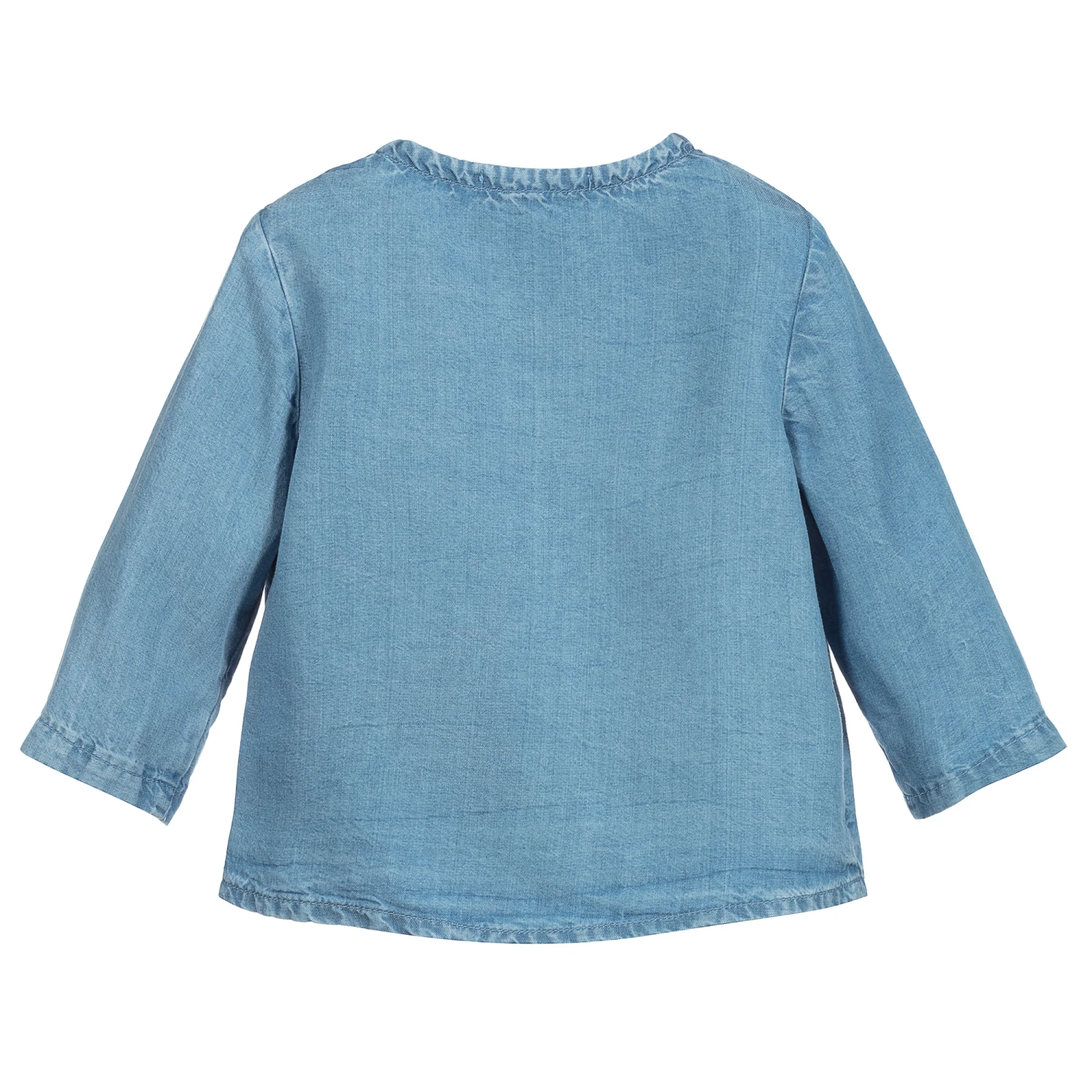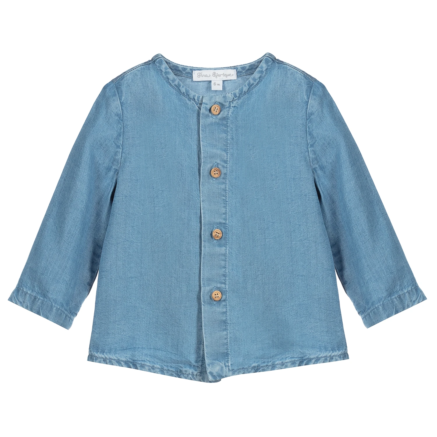 Collarless cotton chambray shirt for baby boys and girls, by Fina Ejerique. Soft and lightweight, it fastens with wooden buttons and has a washed and worn look.