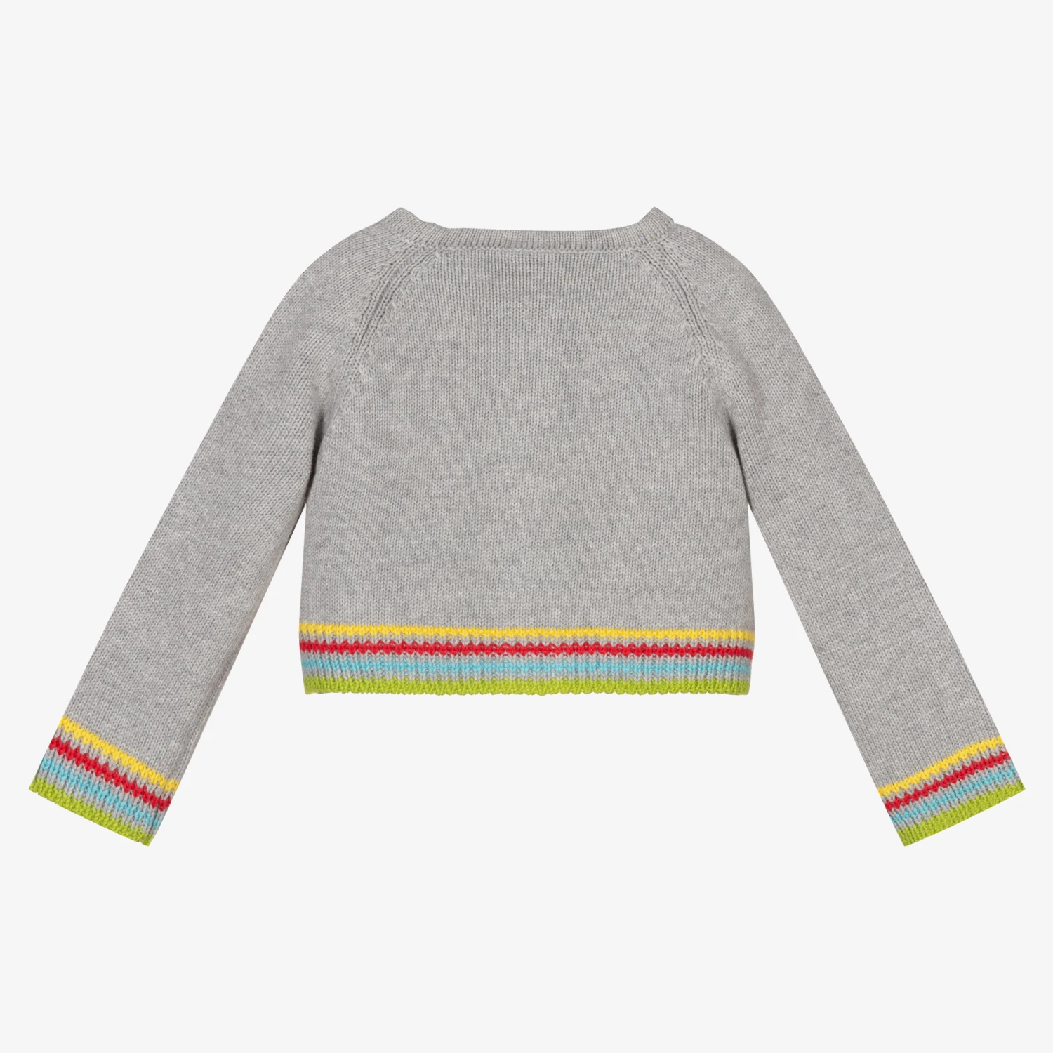 A lovely grey cardigan for baby boys and girls by British brand Frugi, knitted in soft organic cotton. It has cute puffin appliqués and branded button fastenings on the front, with colourful striped ribbed trims.