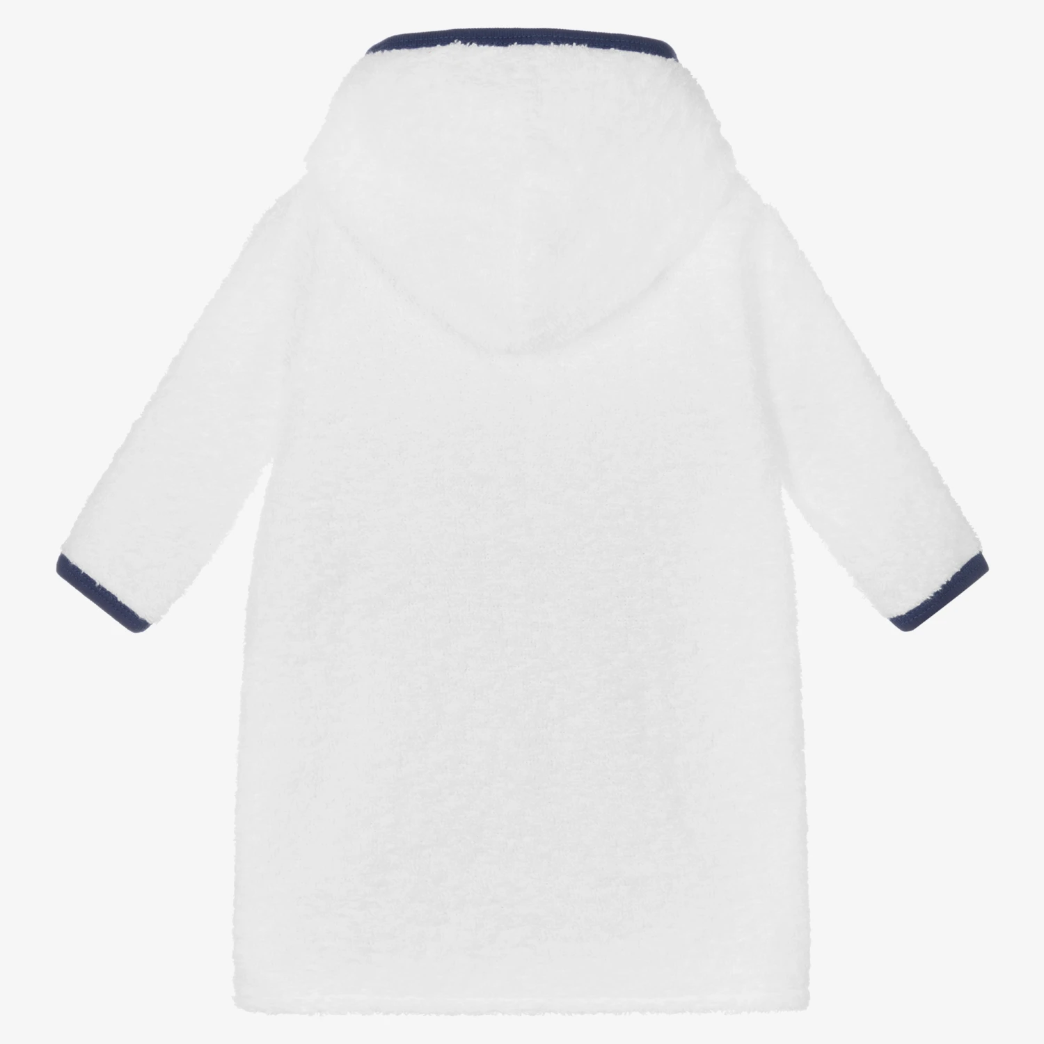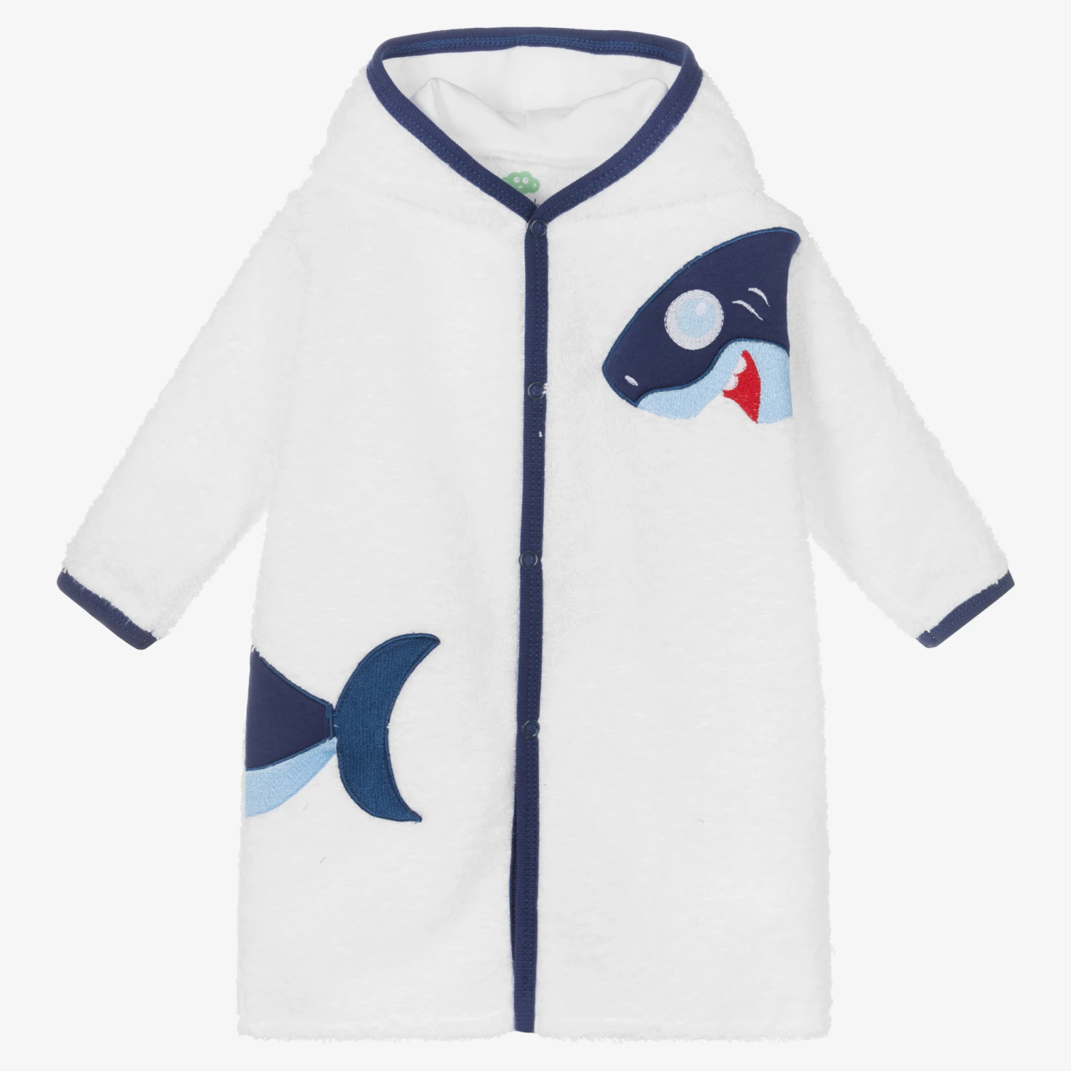 Baby boys white hooded bathrobe by FS Baby, made in soft cotton towelling. This cute bathrobe has a smiling shark appliqué on the front, blue trims and easy-to-use popper fastenings. Soft and absorbent, it is ideal for use after swimming or at bath time.