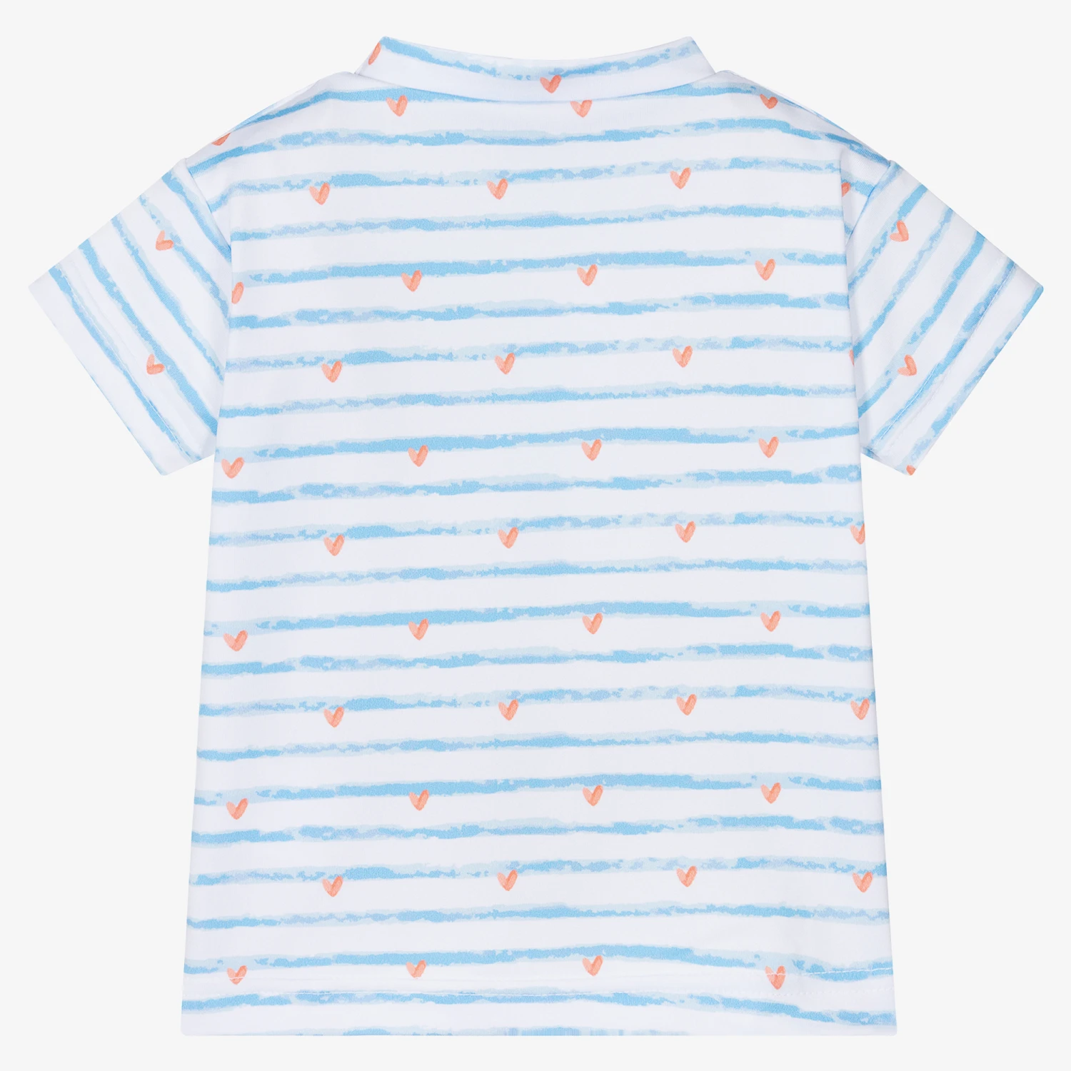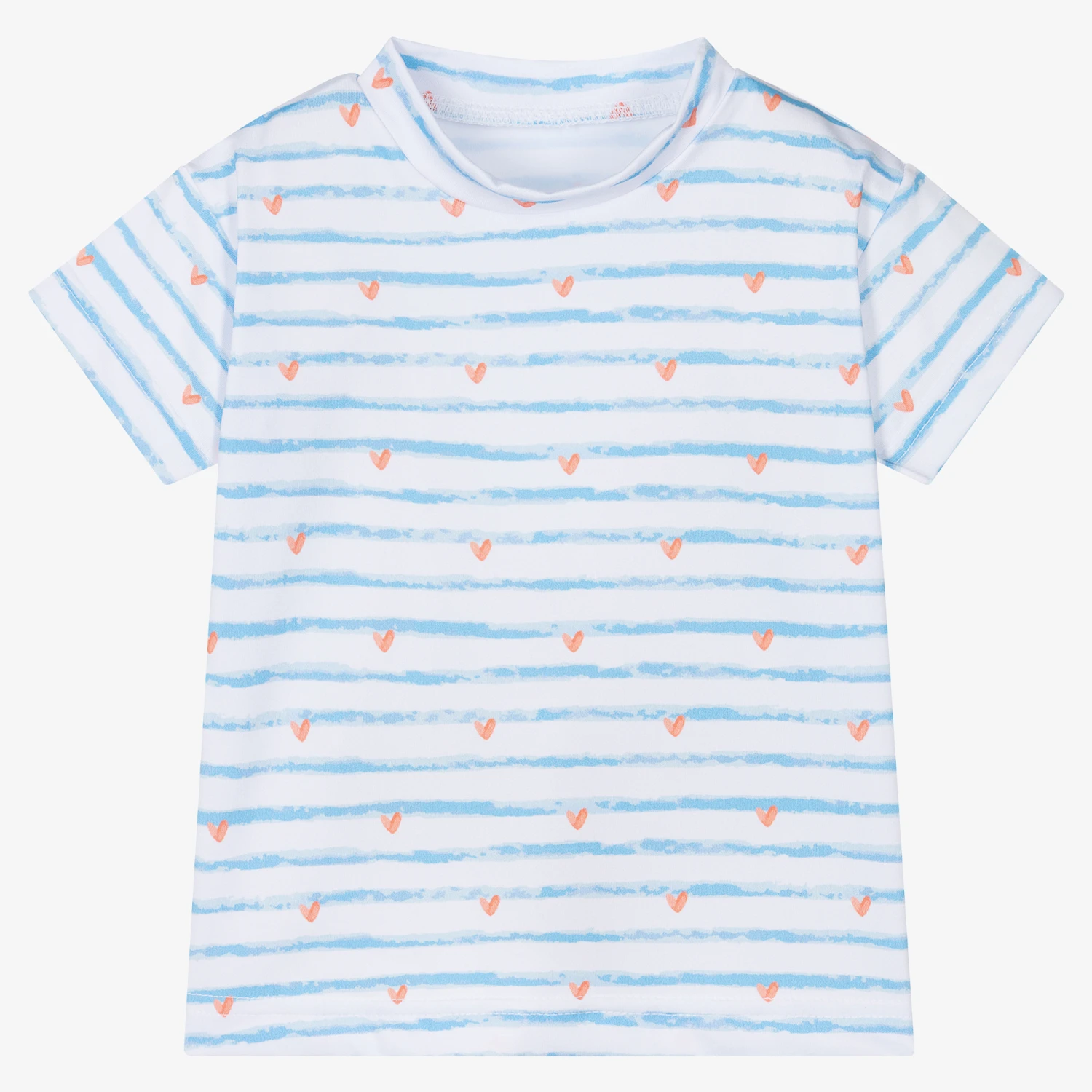 White swim top for baby boys by FS Baby, made in a silky and stretchy lightweight fabric. Ideal for use at the beach or poolside, it simply pulls on over the head and has a lovely blue stripe print, with orange hearts scattered throughout.
