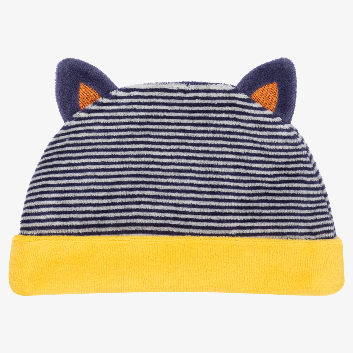 A cosy blue, yellow and grey hat for baby boys and girls from FS Baby, made in a soft cotton blend. With a striped design, this velour hat has a turn-up brim and a soft cotton jersey lining for added comfort on baby’s delicate skin. Adorable 3D animal ears with embroidered centres are stitched to the top for a cute look.