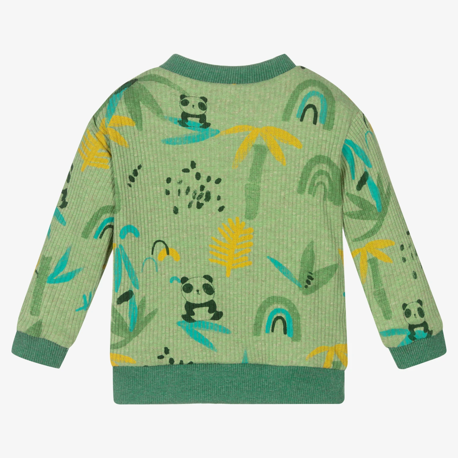 Green top for baby boys and girls by FS Baby, with a cute panda and bamboo print in shades of green and yellow. Made from ribbed cotton blend jersey, it has contrasting darker green ribbed trims and popper fastenings on one shoulder.