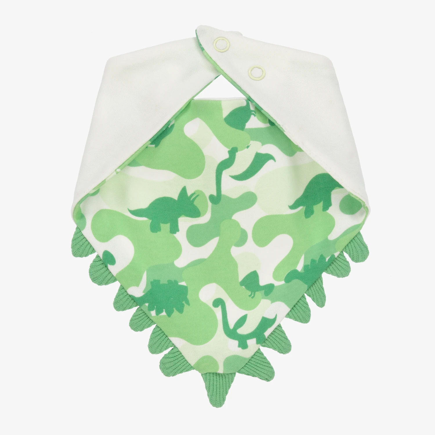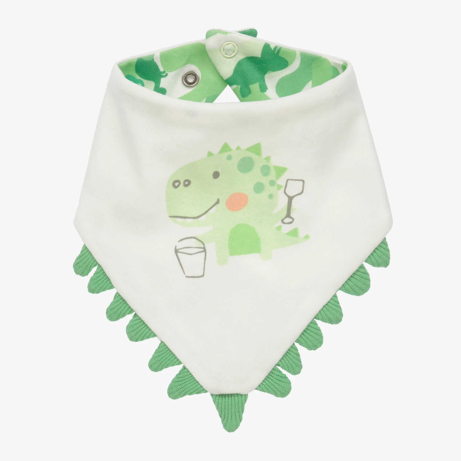 White and green bib for baby boys by FS Baby, made in a double layer of soft organic cotton jersey. There is a sweet dinosaur motif printed on the front, with a matching dinosaur pattern on the lining. It is trimmed with cute 3D spines and has an adjustable popper fastening on the back.