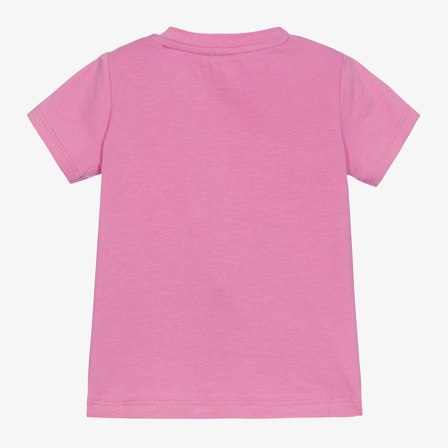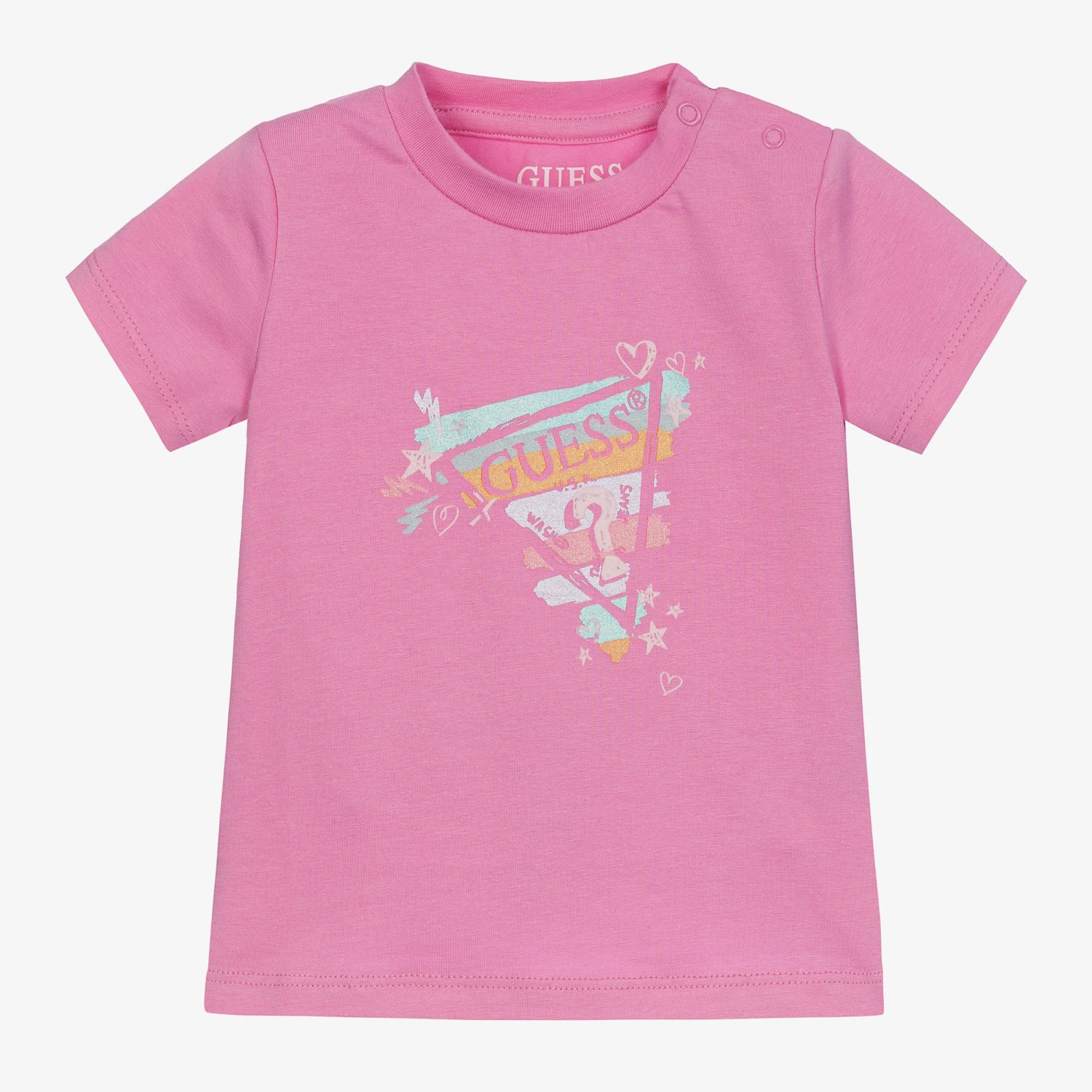 A pink cotton T-shirt for baby girls by Guess. Printed with the designer’s logo in glittery colours of green and silver in the brand’s signature triangular shape. There are popper fastenings on one shoulder for easy dressing and changing. Contains in conversion organic cotton fibres.