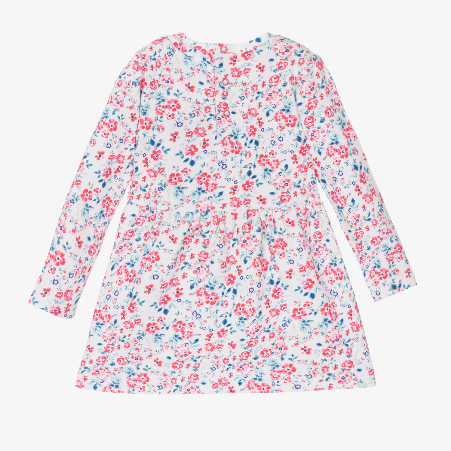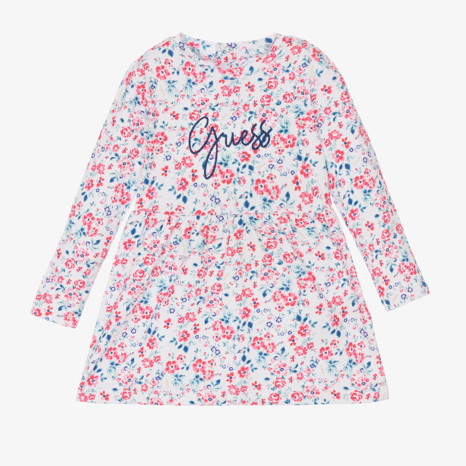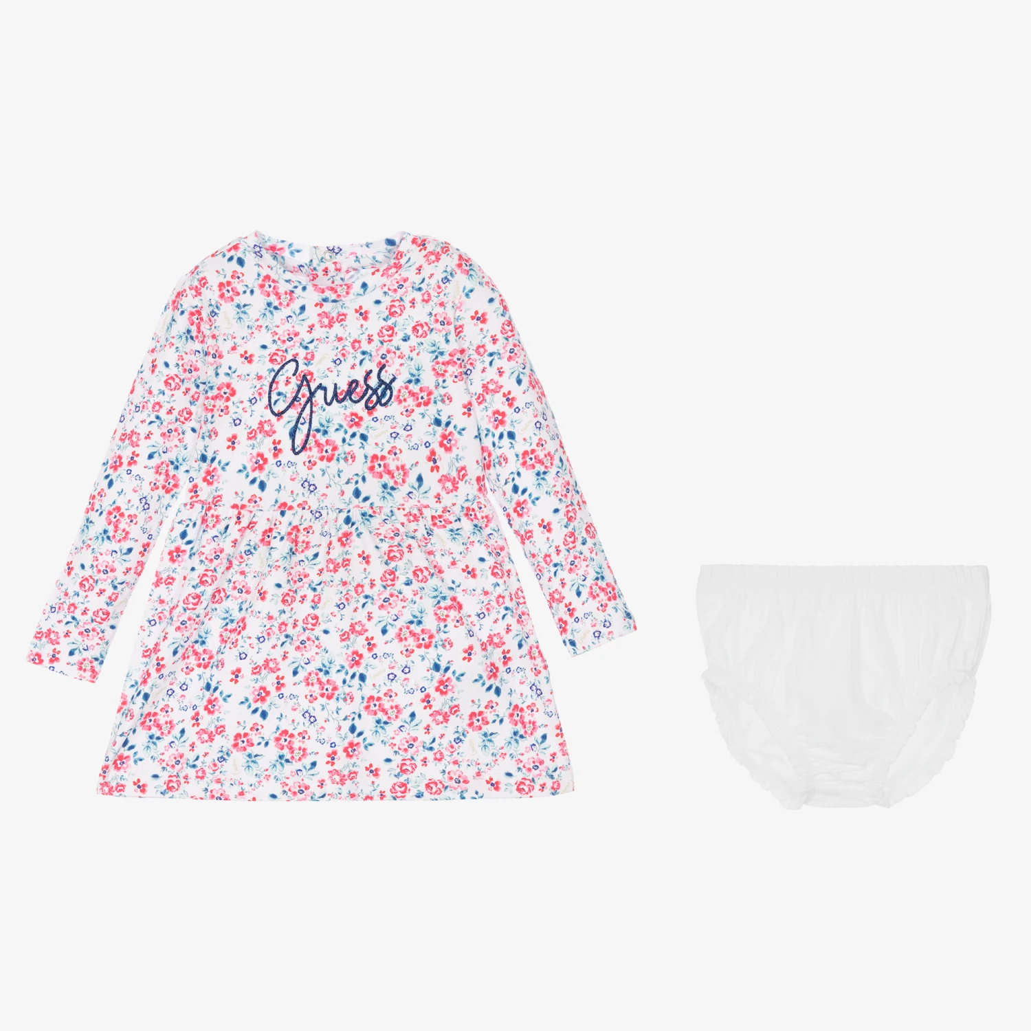 Pink, blue and white cotton dress for little girls by Guess, with a pair of white knickers. With a sweet floral print, this cute dress is embroidered with the brand’s logo in metallic blue thread. It is made in super soft cotton jersey and has popper fastenings on the back. The dress and knickers contain in conversion cotton fibre.