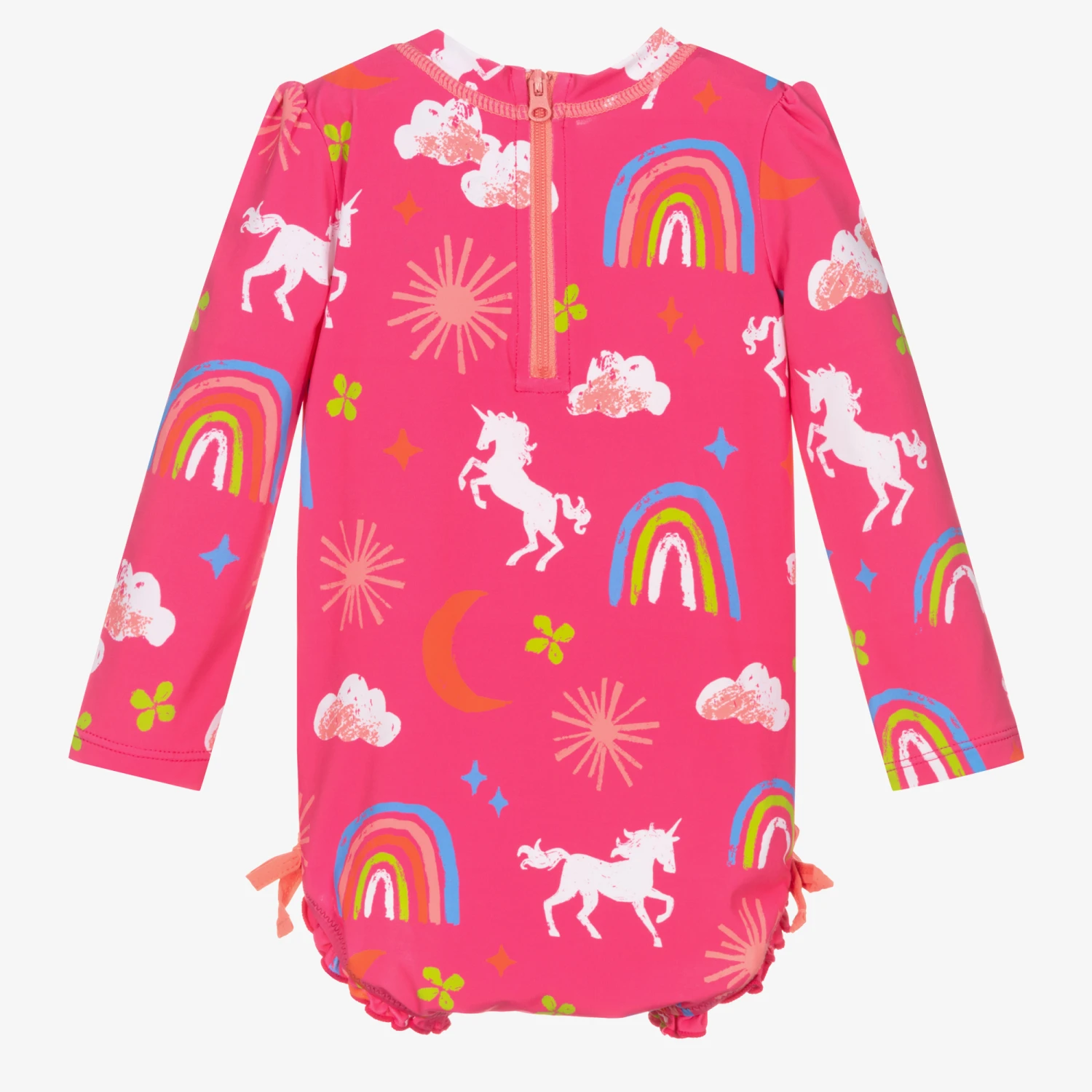 Pink sun protective suit for baby girls by Hatley, with UPF50+. Silky soft and stretchy, it has a fun and colourful print of rainbows and unicorns. The leg openings have pretty ruffle and bow trims, with popper fastening in the middle.
