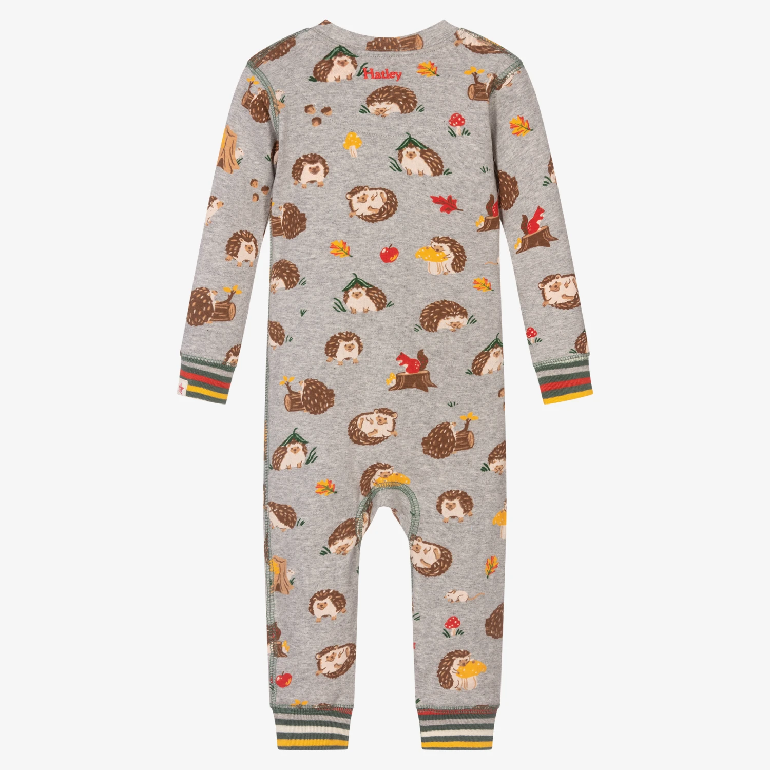 Cute grey marl romper for baby boys and girls by Hatley, with a brown hedgehog print and green overstitching detail. Made in soft and comfortable, organic cotton jersey, it has striped ribbed trims and a front zip fastening with a popper chin guard. When worn as pyjamas, the babysuit should fit snugly.