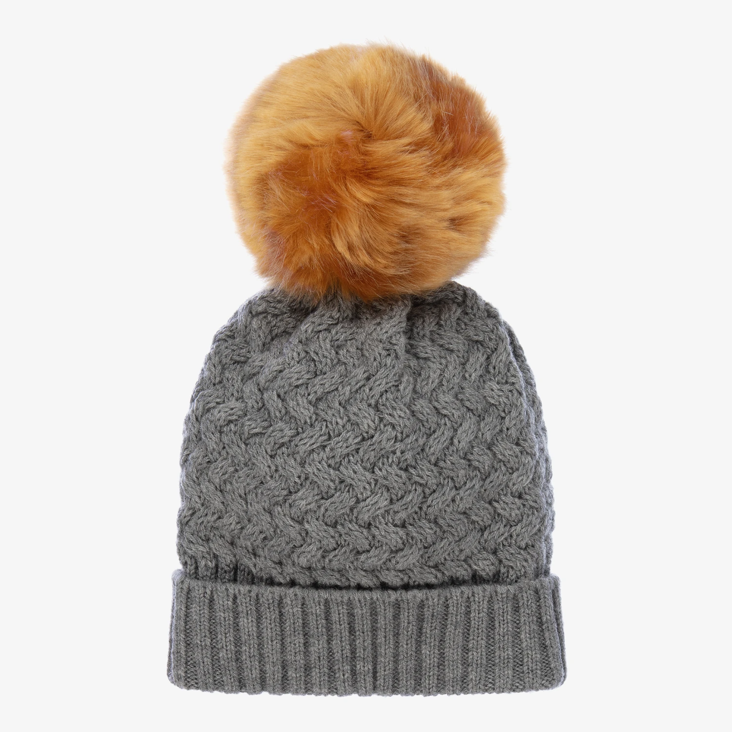 Made from soft Merino wool, a grey knitted hat for baby girls by Hucklebones London. It has a ribbed, turn-up brim with a pearlised bow logo charm, and a large brown faux fur pom-pom on the top.
