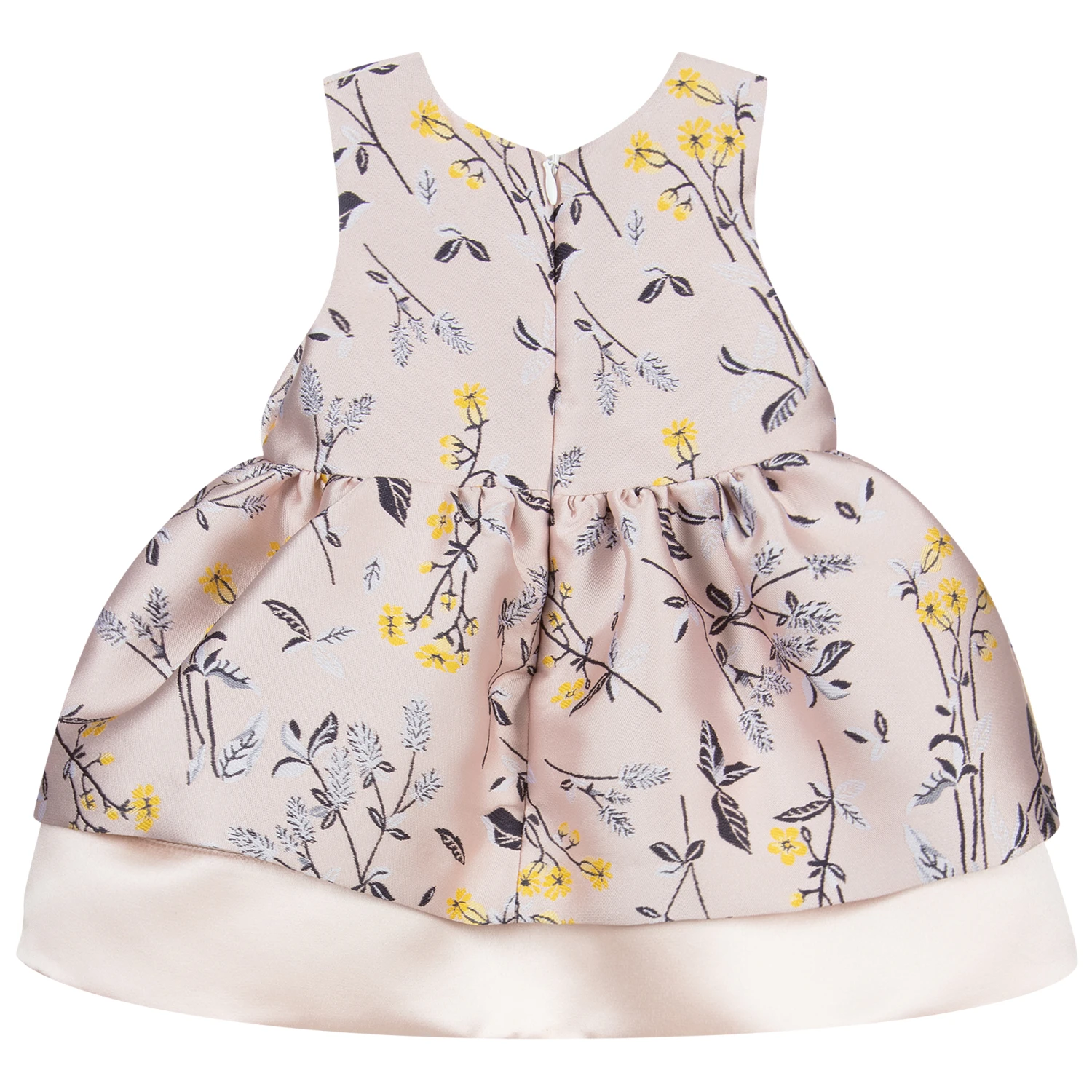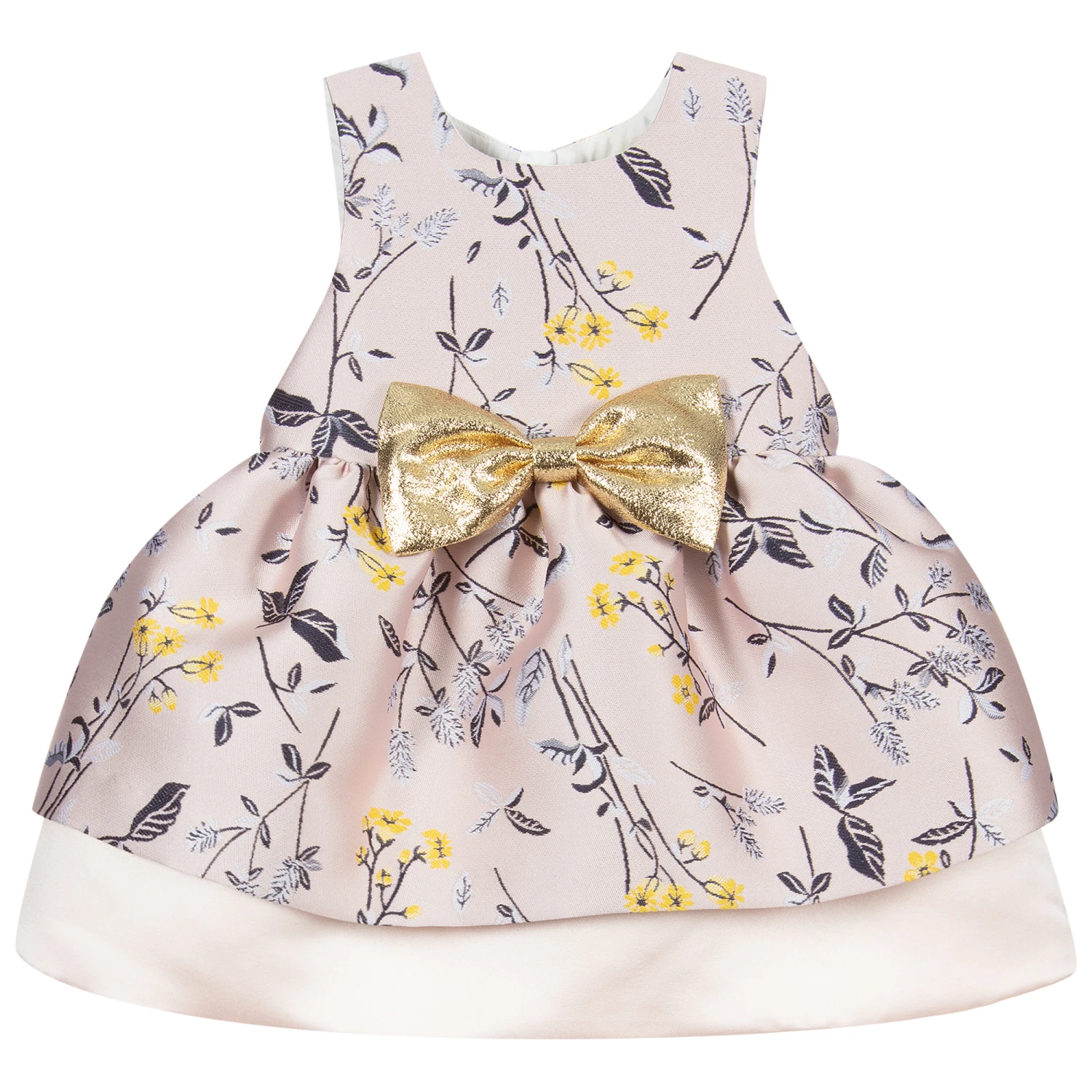 Pink satin jacquard dress set for baby girls by Hucklebones London, with a pair of pink satin knickers. The dress has a navy blue, yellow and white floral pattern, with a large glittery gold fixed bow on the front. Lined in satin and cotton with a pink satin trim, it has an additional tulle lining for extra volume.