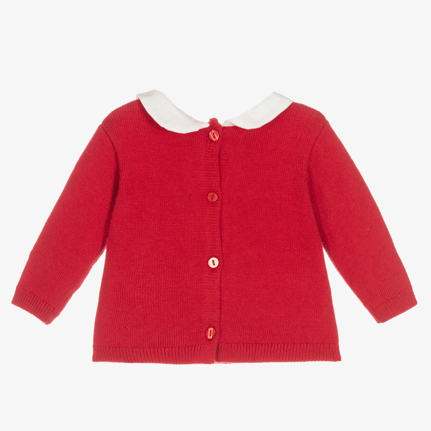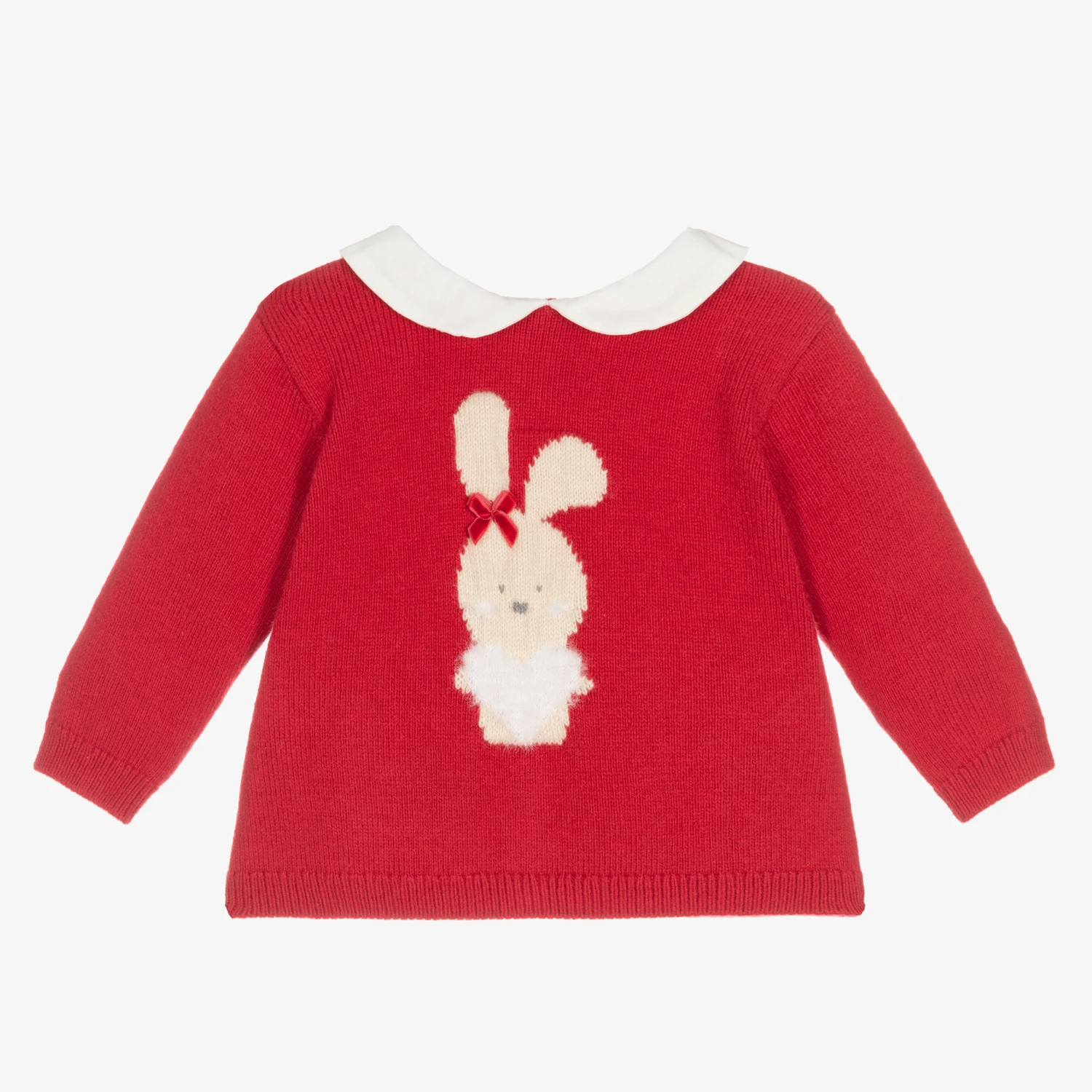 Sweet red sweater for baby girls by iDO Mini, knitted in a soft cotton and wool blend. It has a white cotton Peter Pan collar and a cute beige and white bunny motif on the front with a red bow trim. There are button fastenings on the back.