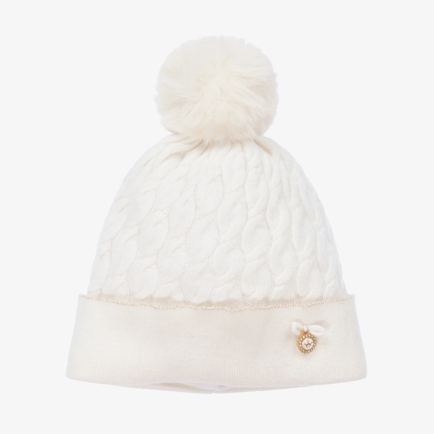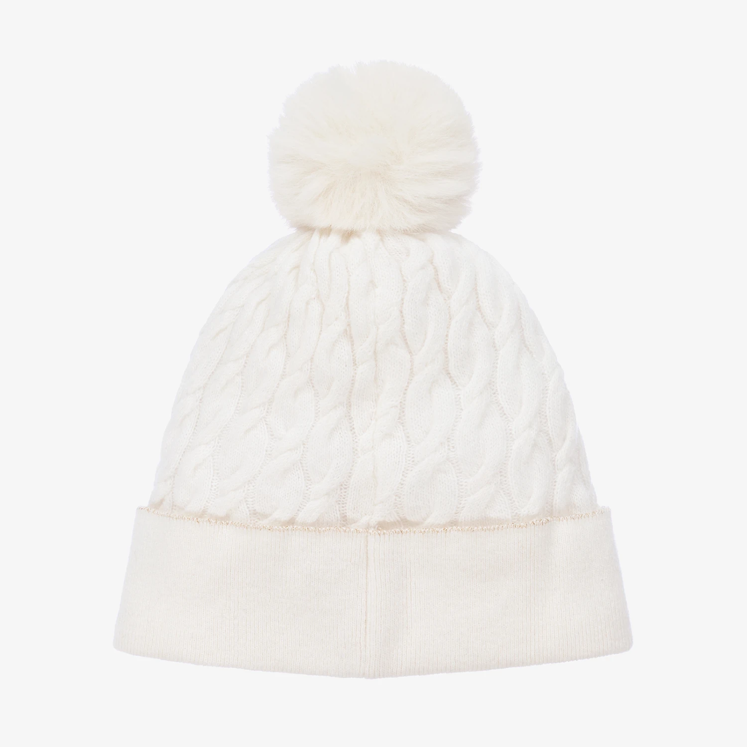 White hat for baby girls by Jamiks, knitted in soft acrylic and lined with smooth cotton jersey for added comfort. It has a tonal faux fur pom-pom on the top and a small logo charm on the turned-up brim.