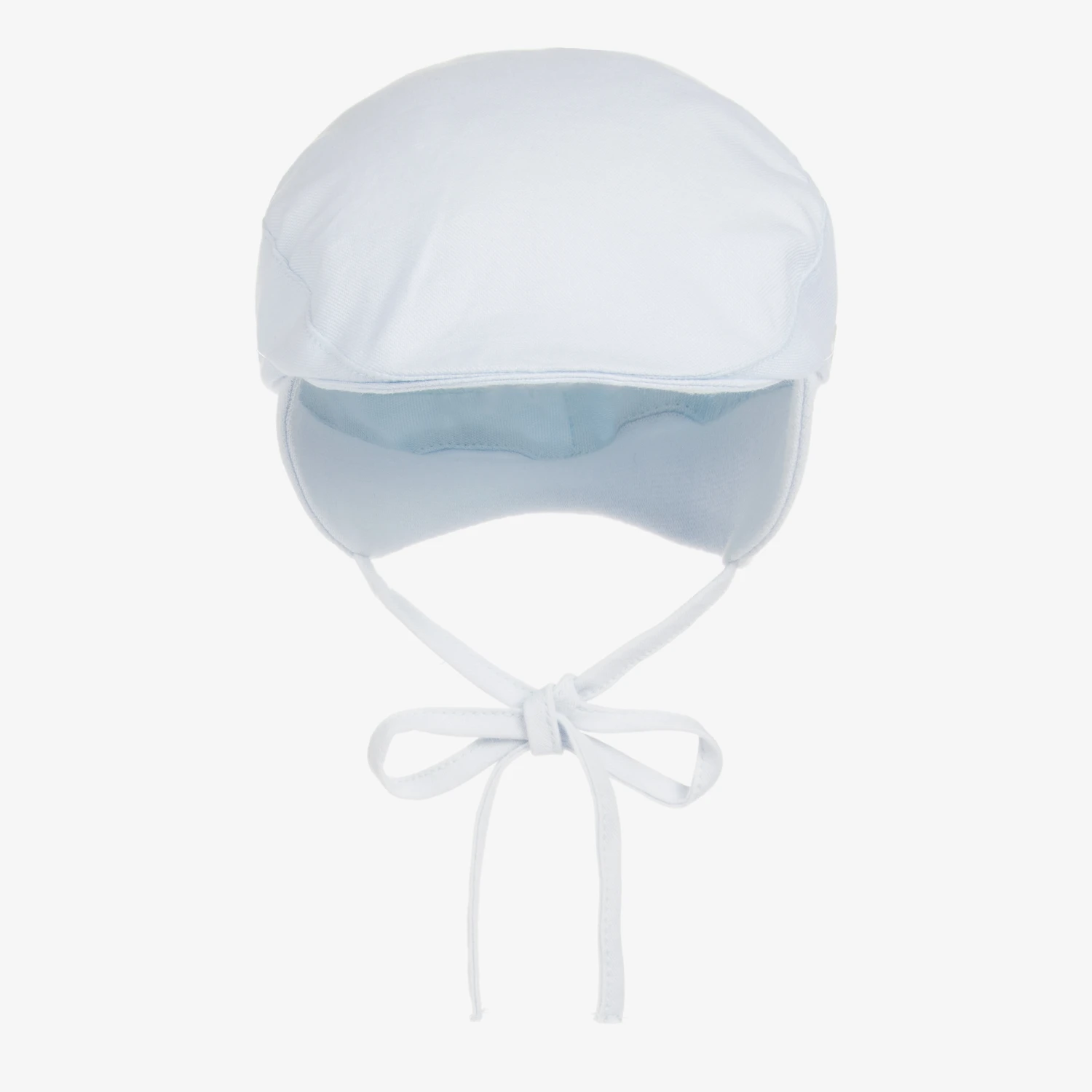Sweet pale blue flat cap for baby boys and girls by Jamiks, made in lightweight organic cotton twill. To help keep sun out of precious eyes it has a small peak on the front. The back is lightly elasticated and it ties under the chin for a secure, yet comfortable fit.