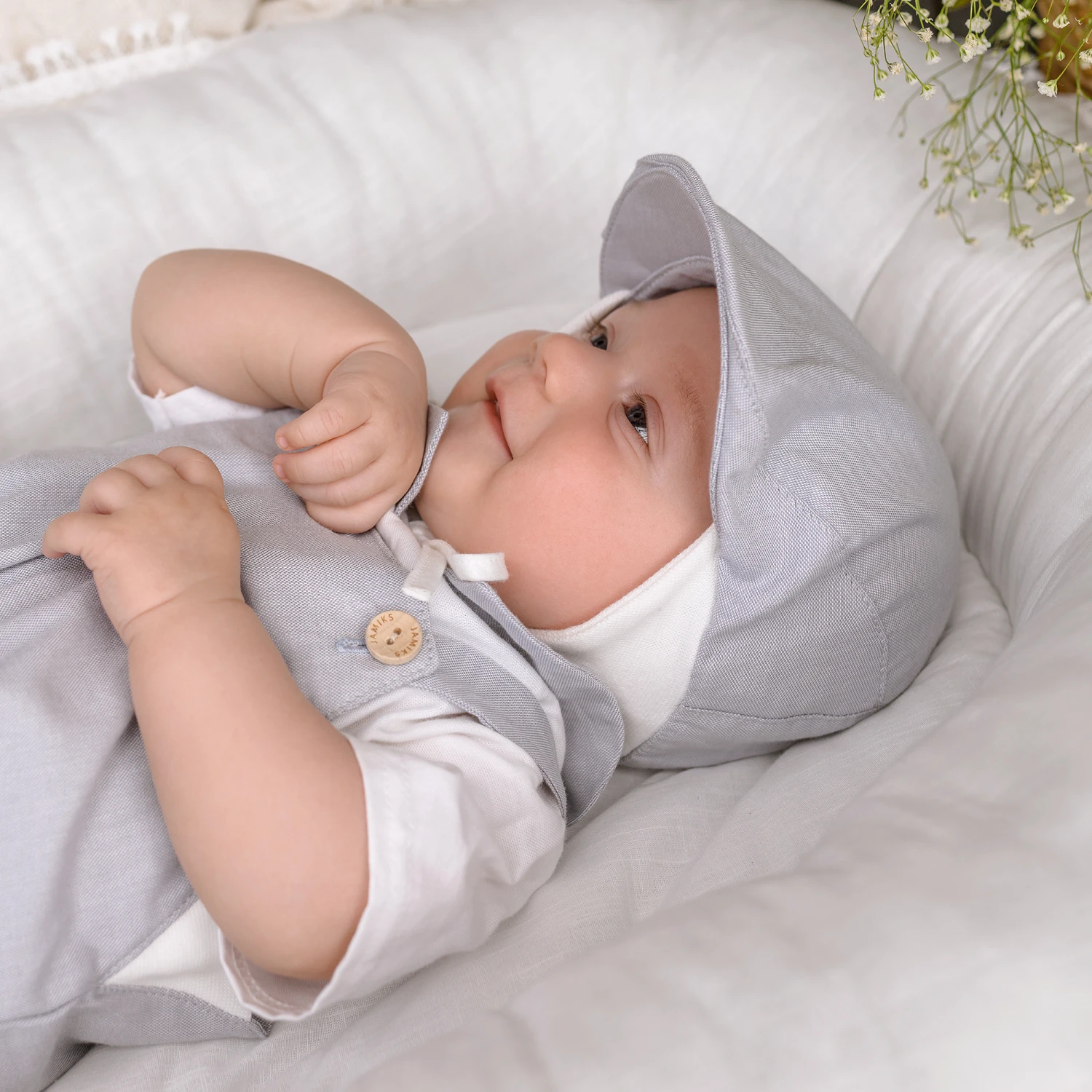 Sweet pale grey flat cap for baby boys and girls by Jamiks, made in lightweight organic cotton twill. To help keep sun out of precious eyes it has a small peak on the front. The back is lightly elasticated and it ties under the chin for a secure, yet comfortable fit.