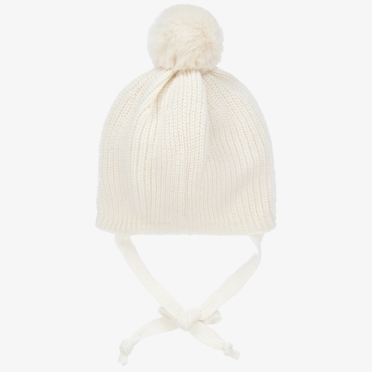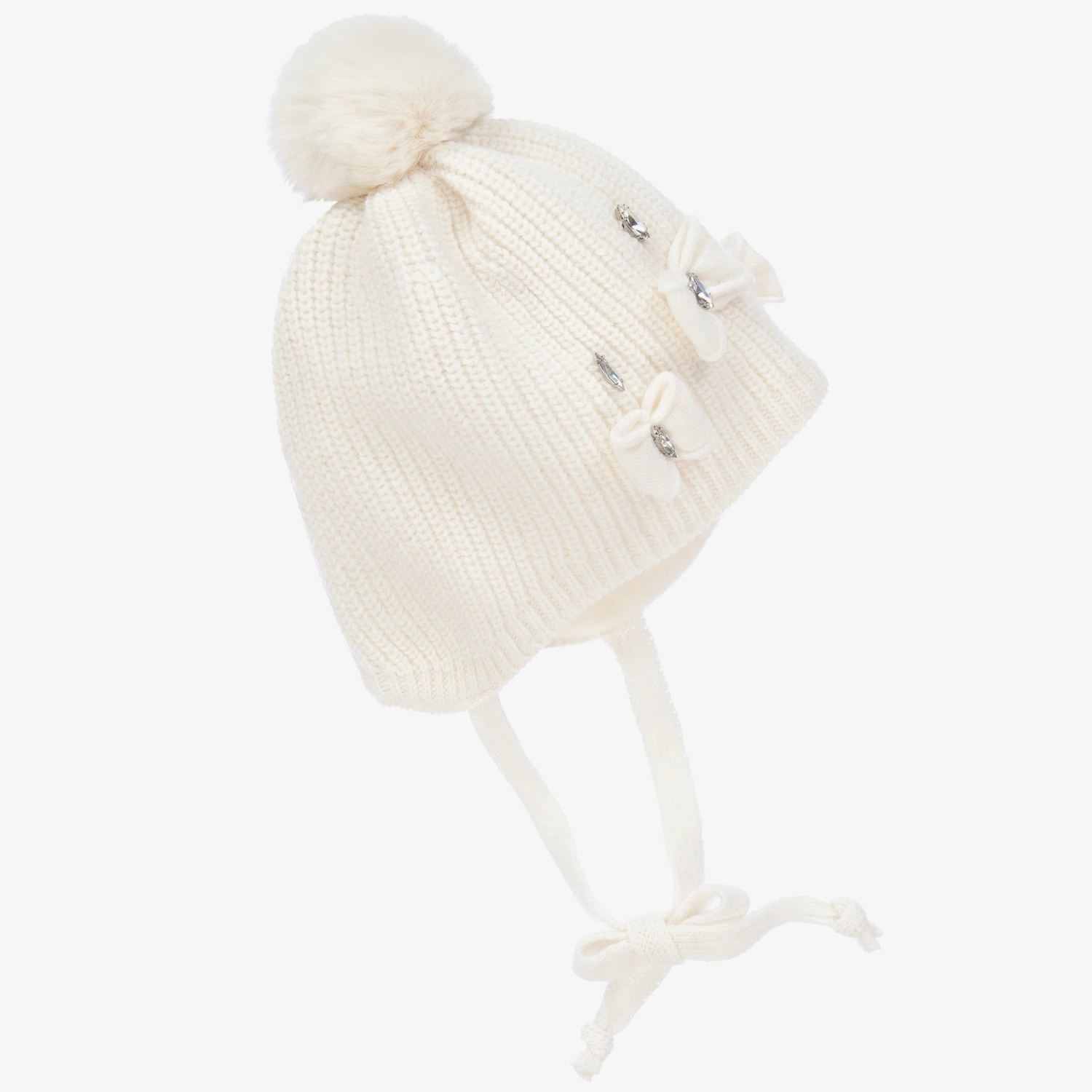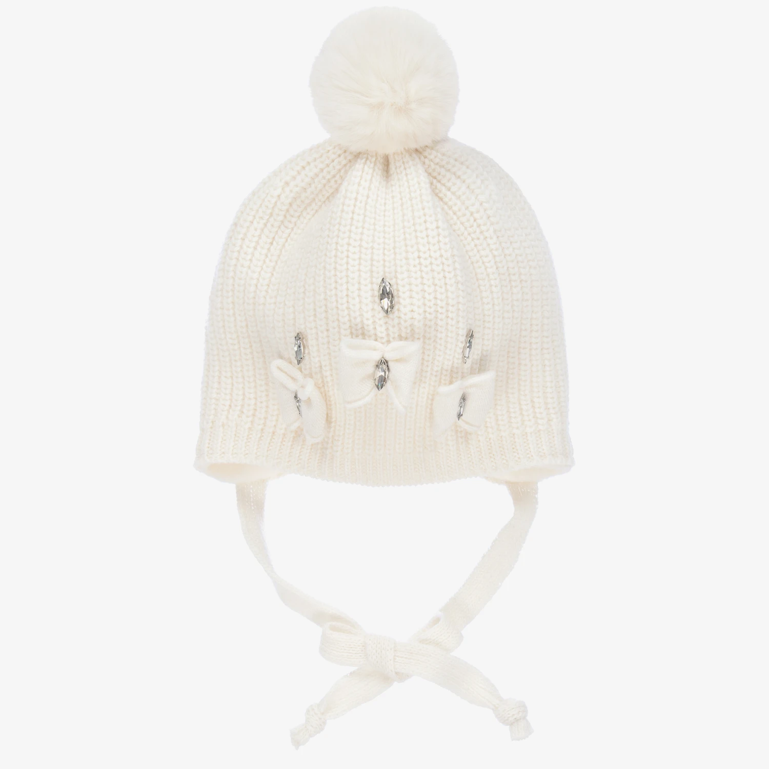 Softy knitted ivory cashmere-blend pom-pom hat for little girls by Jamiks, with cute diamanté embellished bows on the front. It has a super soft cotton fleece lining and two cords that fasten under the chin.