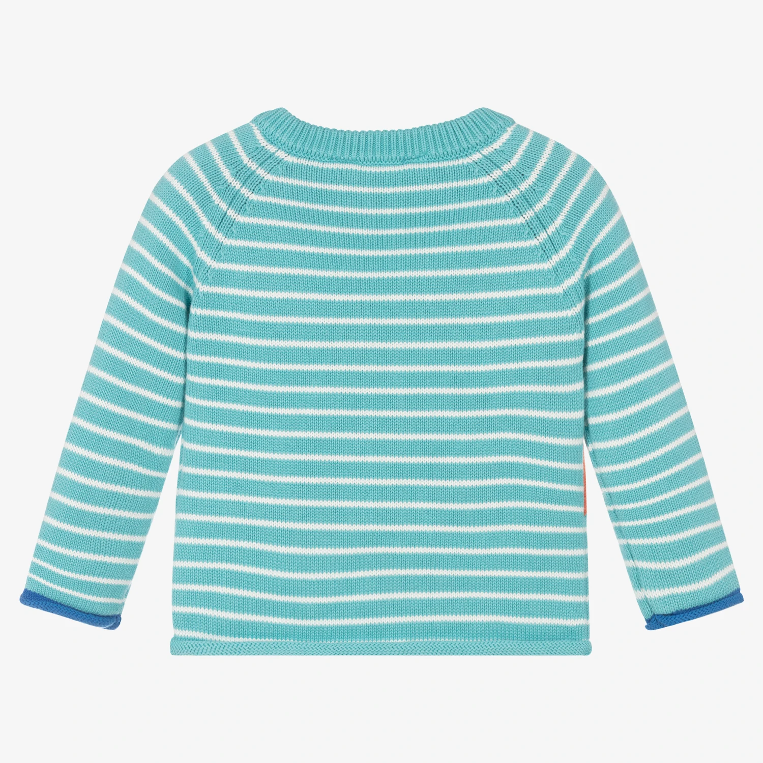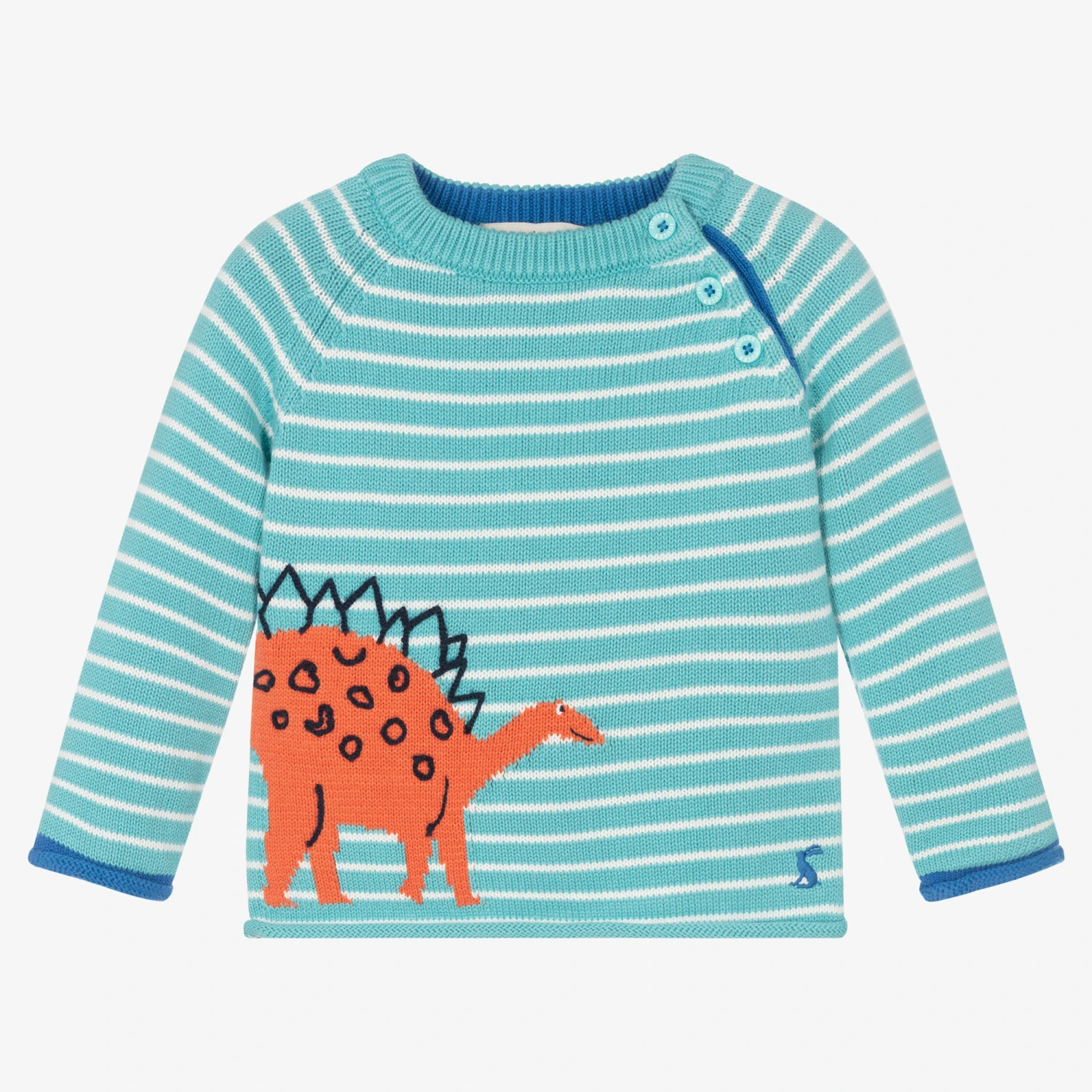 Aqua blue and white striped jumper for baby boys from Joules, patterned with a fun orange dinosaur on the front. This adorable jumper is knitted in soft cotton with branded button fastenings on the raglan seam and rolled cuffs and hem. The brand’s signature hare logo is embroidered on the front.