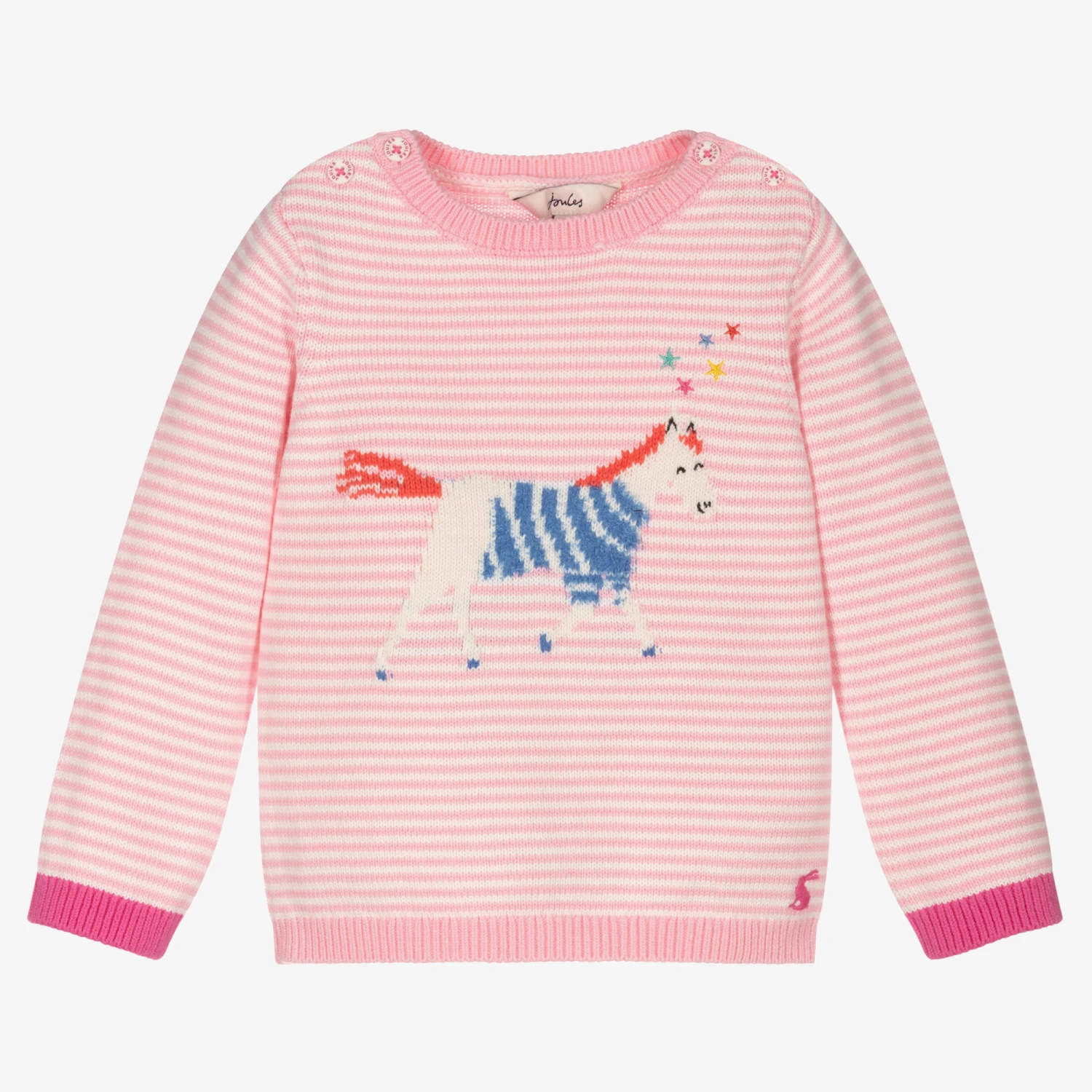 Pink and white striped jumper for girls by Joules, knitted in soft cotton. It has a gorgeous horse design on the front with embroidered stars and the signature hare logo near the hem. There are branded button fastenings on the shoulders.