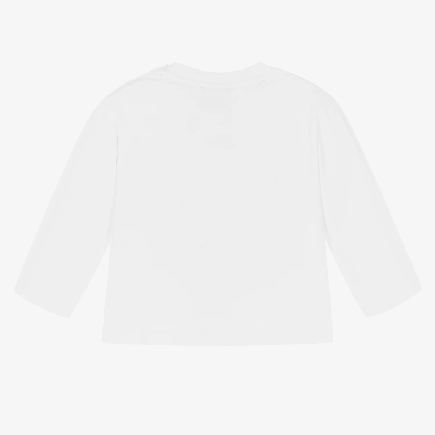 Exclusive to Childrensalon, a white cotton top for baby boys by Joyday, with ‘Super Hero’ and a colourful World printed on the front. Easy to wear, it has popper fastenings on one shoulder and is made in comfortable jersey.
