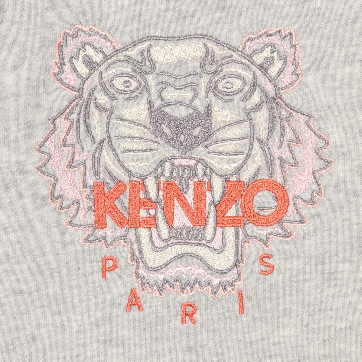 Grey marl cotton sweatshirt for little girls by KENZO KIDS, made with soft and stretchy jersey. The designer’s signature Tiger motif is embroidered on the front in ivory and pink. It has popper fastenings on the shoulder, a crew neck and ribbed trims.
