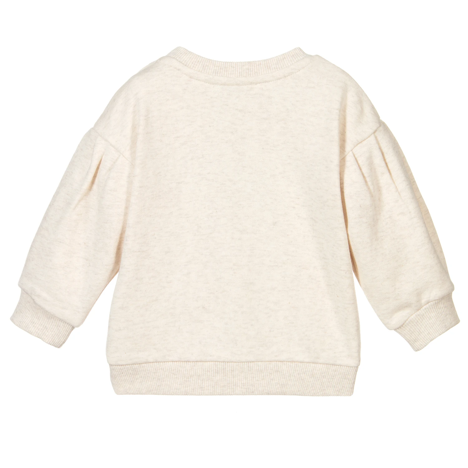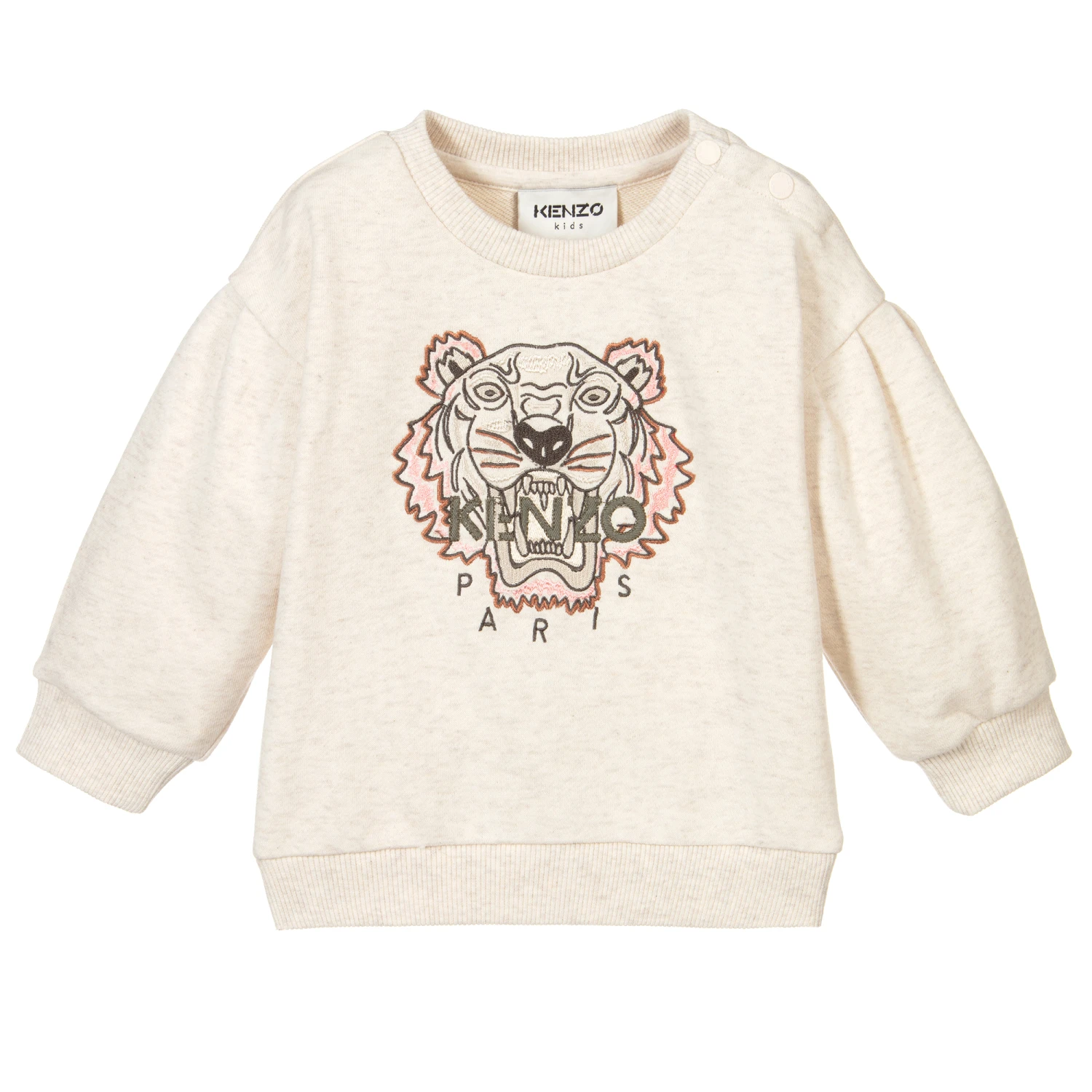 Baby girls ivory marl sweatshirt by KENZO KIDS. It is made in soft, mid-weight cotton blend jersey in a boxy fit, with dropped shoulders, puffed sleeves and popper fastening. The front is embroidered with the brand’s iconic Tiger logo in shades of pink, beige and khaki green.