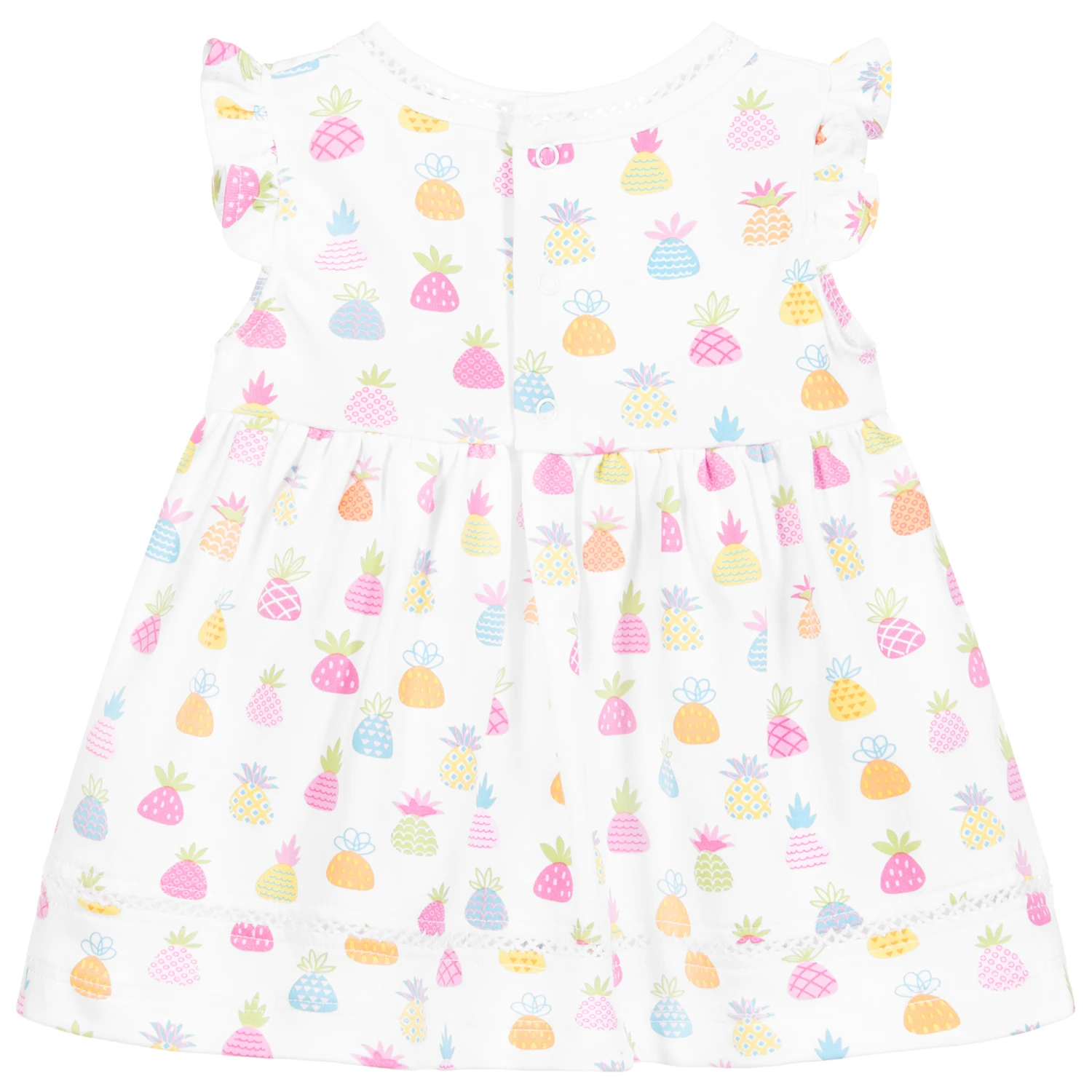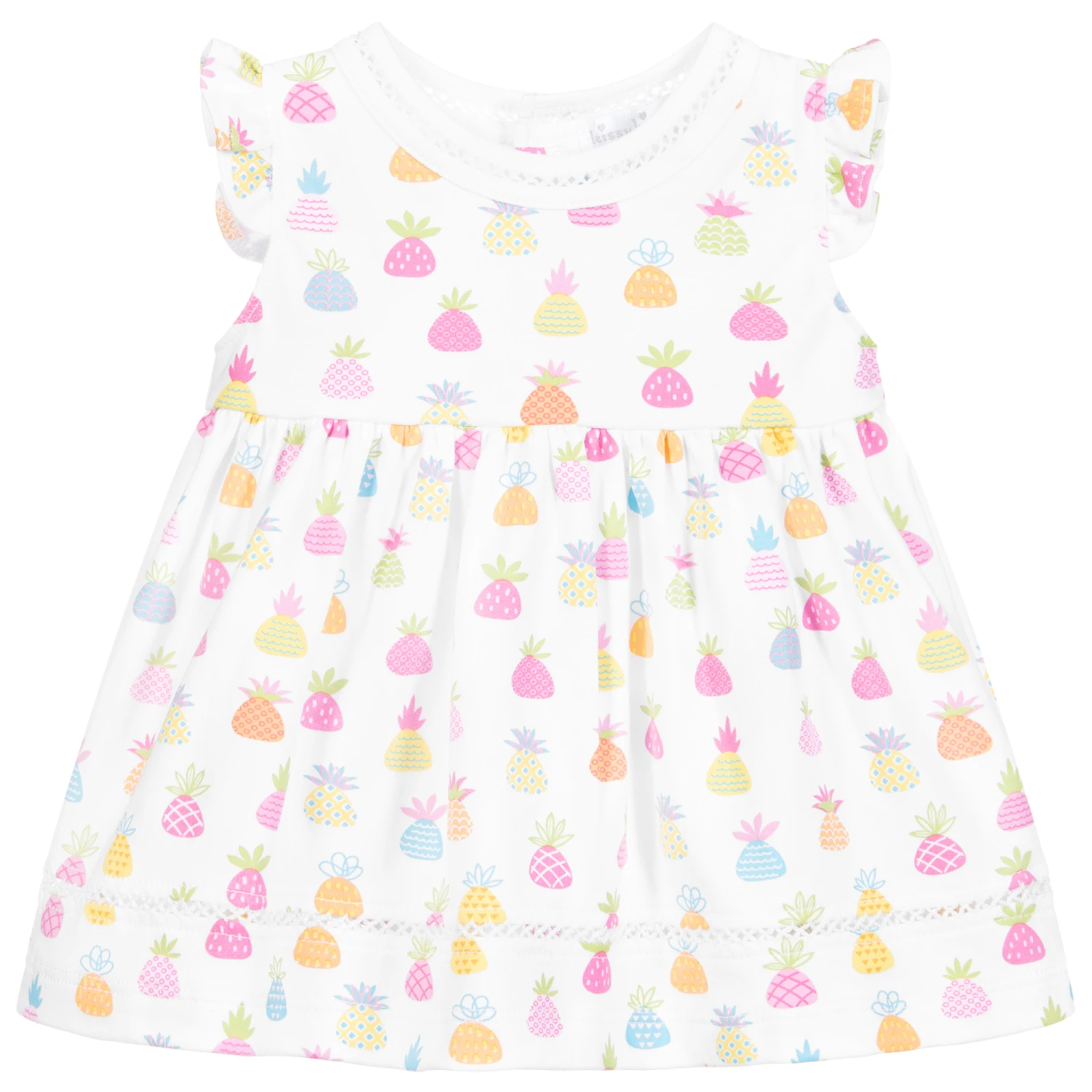 White dress and bloomers set for baby girls by Kissy Kissy, made in super soft and stretchy Pima cotton jersey, with a colourful pineapple print.