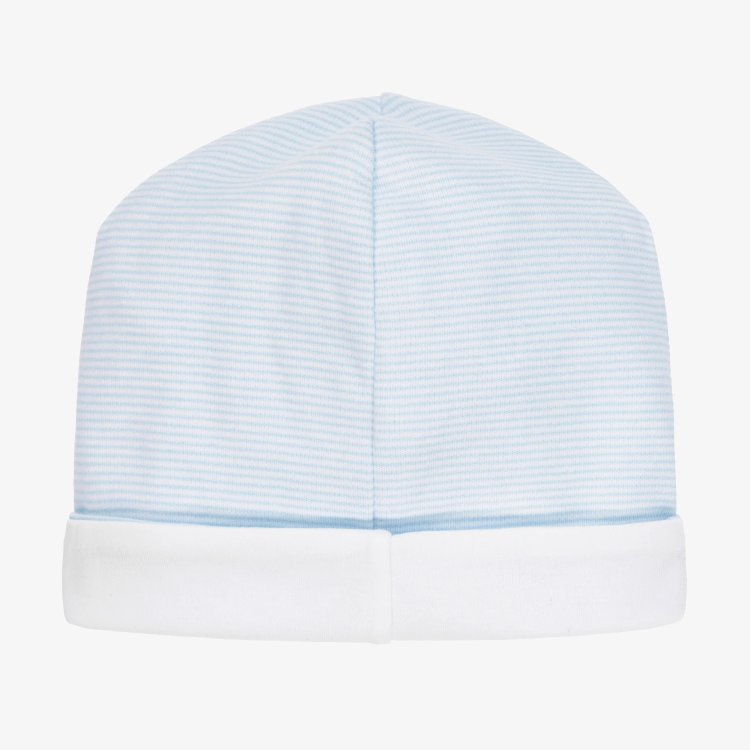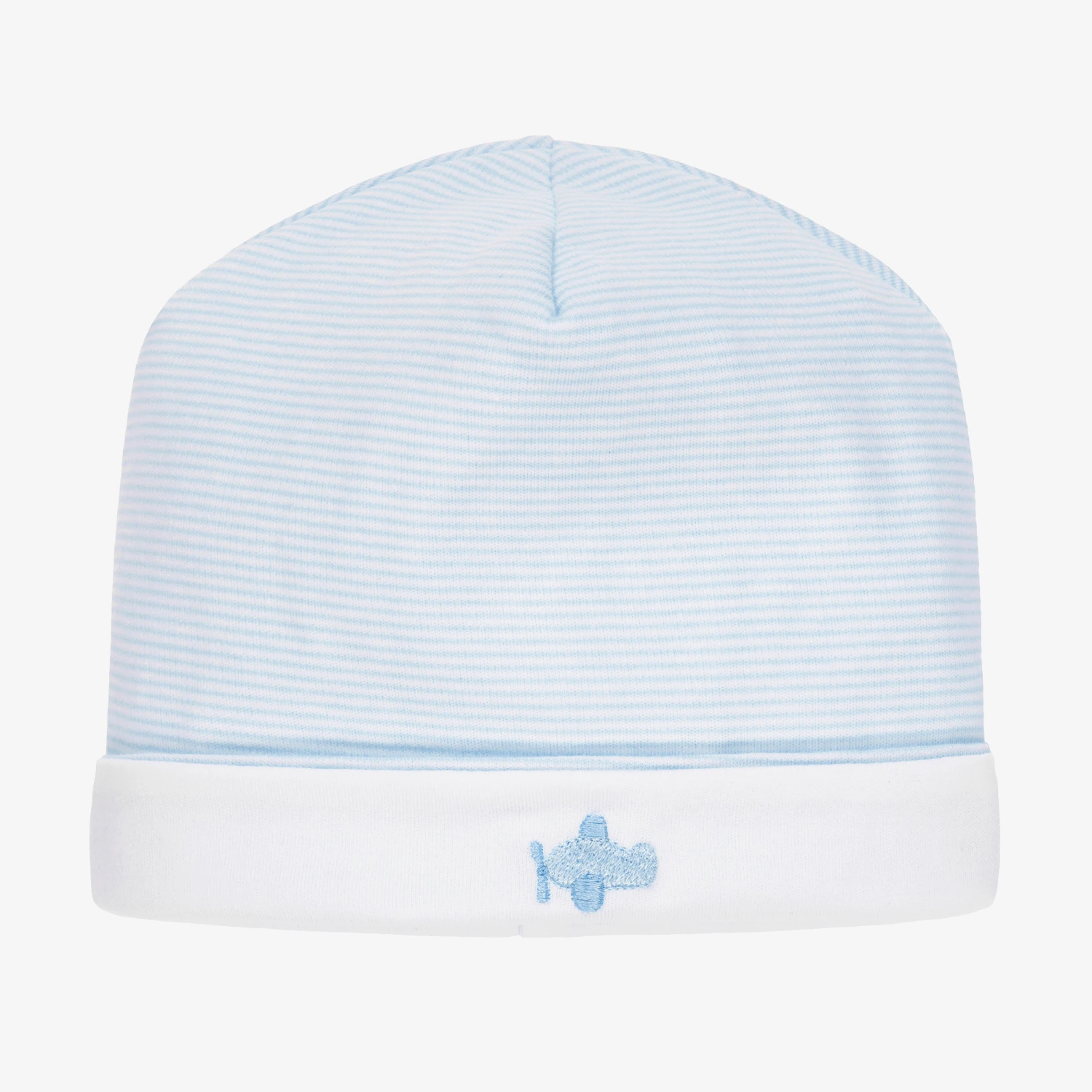 Baby boys blue and white striped hat from Kissy Kissy, made in a double layer of the softest Pima cotton jersey. It has an embroidered blue plane on the white turned-up brim.