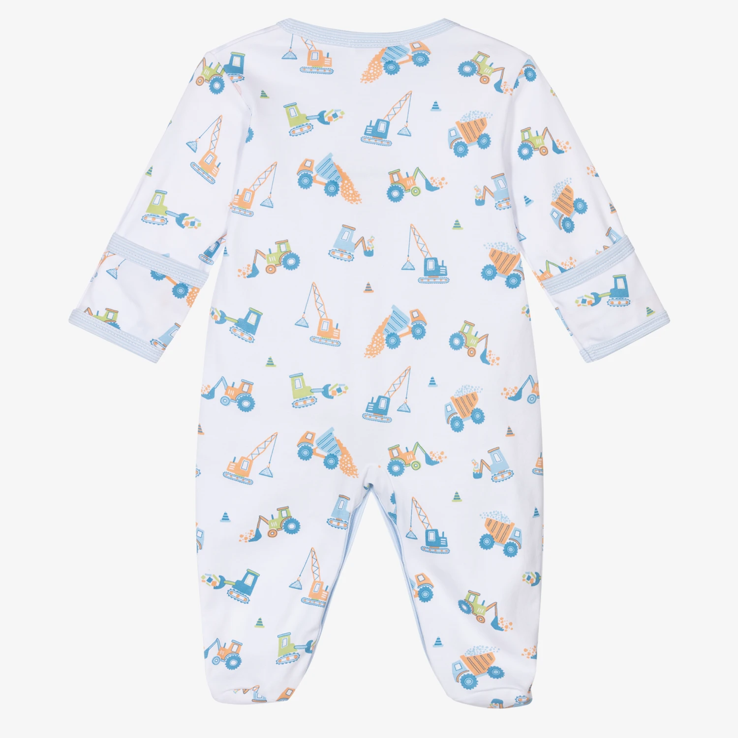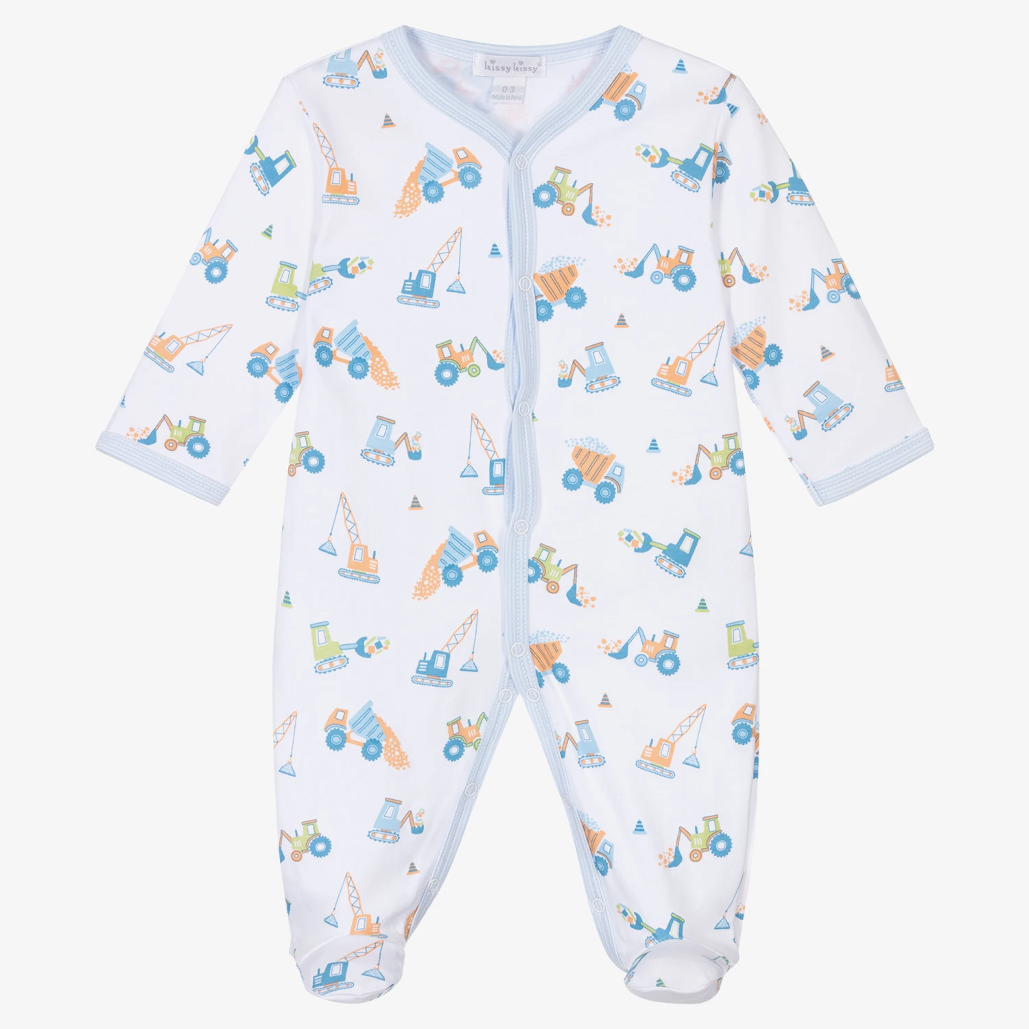 A white babygrow for boys from Kissy Kissy, made in super soft Pima cotton jersey. Fastening easily with poppers, it has a cute and colourful construction vehicle print, adding a playful touch to an everyday babygrow.