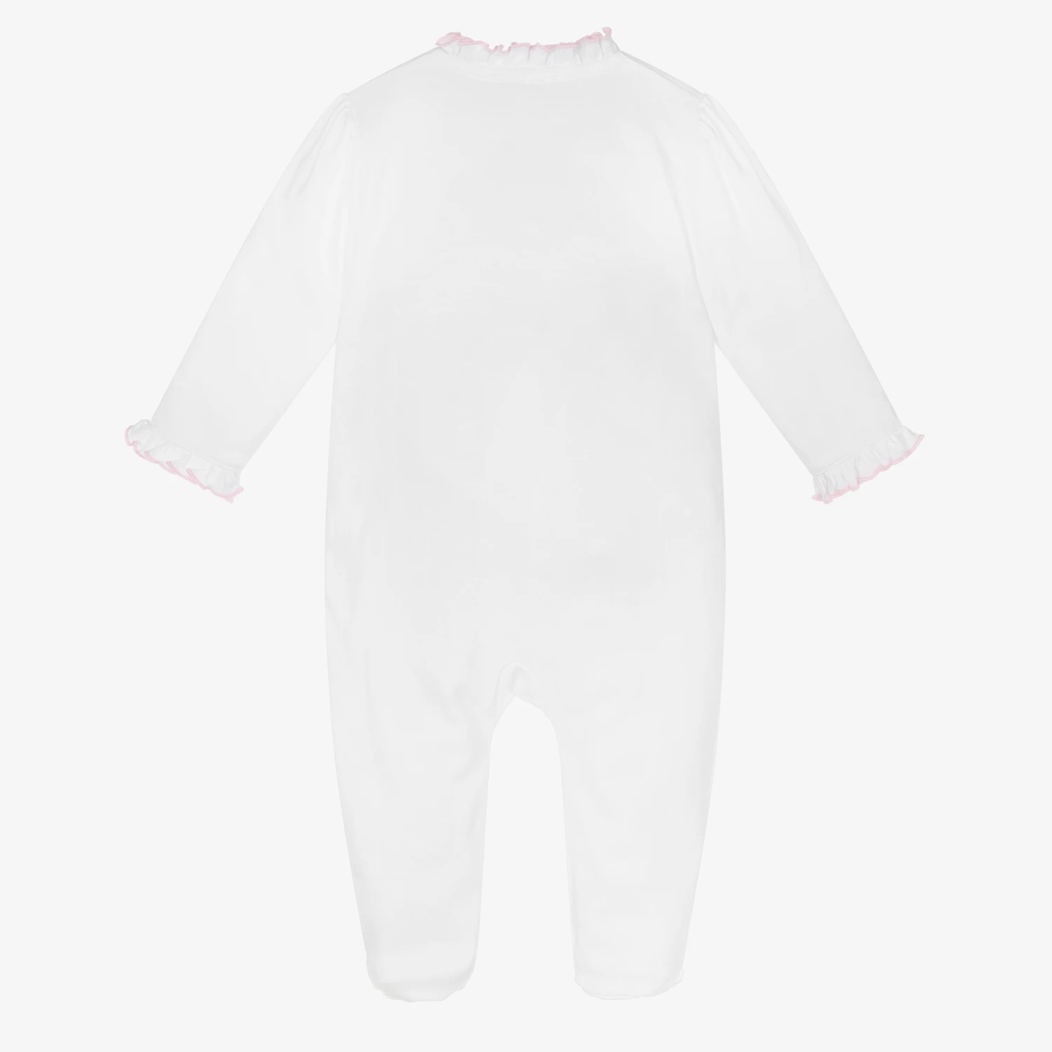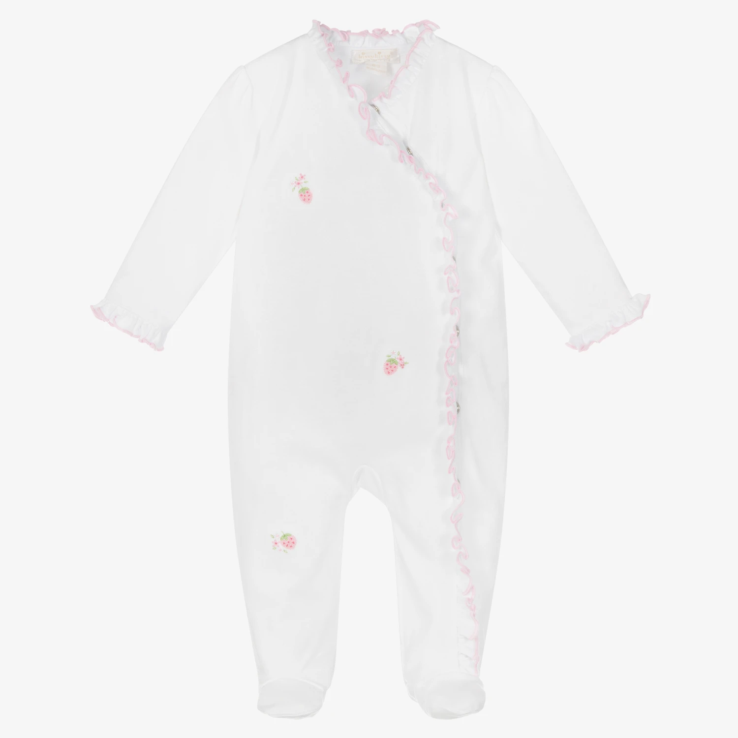 Lovely white babygrow for girls by Kissy Kissy, made in luxuriously soft Pima cotton jersey. Hand-embroidered with adorable strawberries, this cute one-piece has ruffle-trimmed poppers on the front and matching fluted sleeves. It fastens with hidden poppers on the front for ease when dressing.