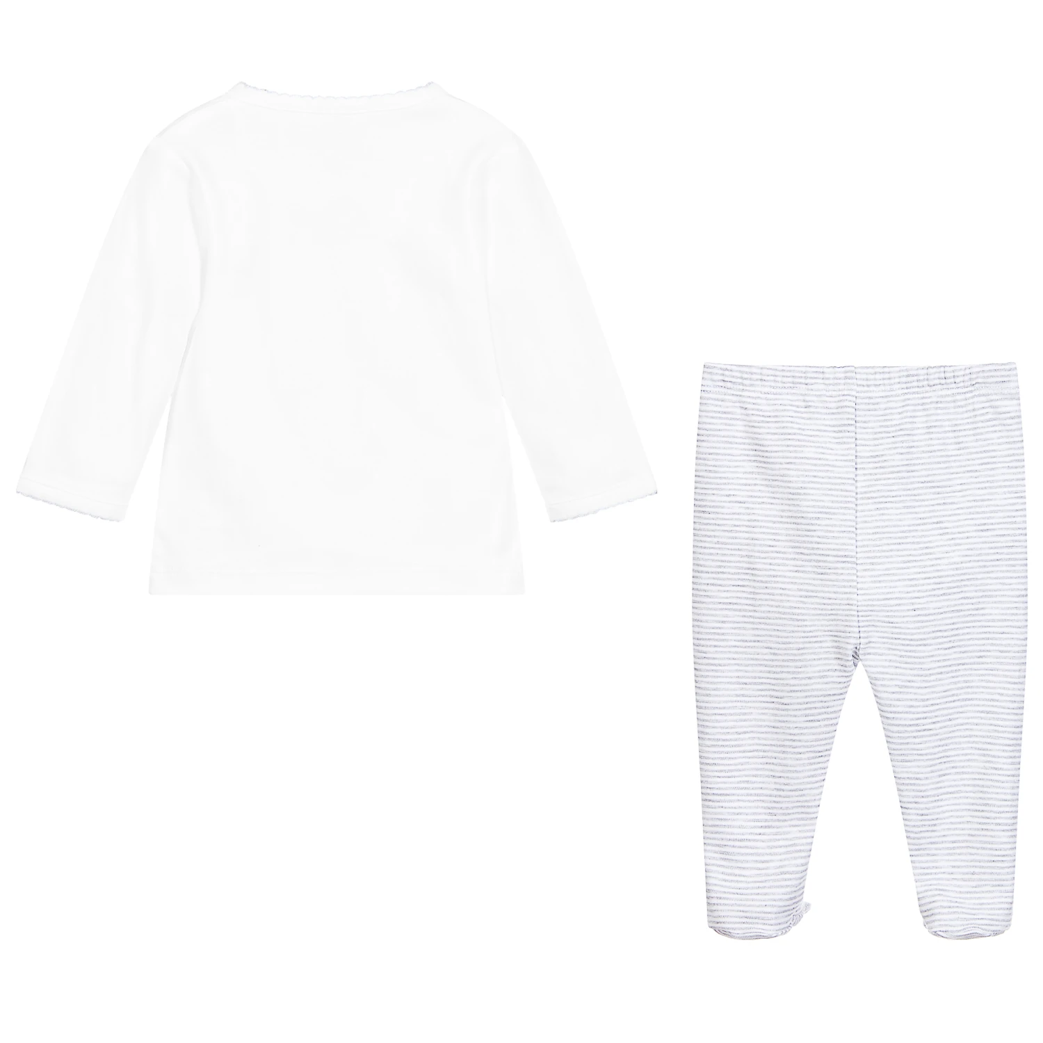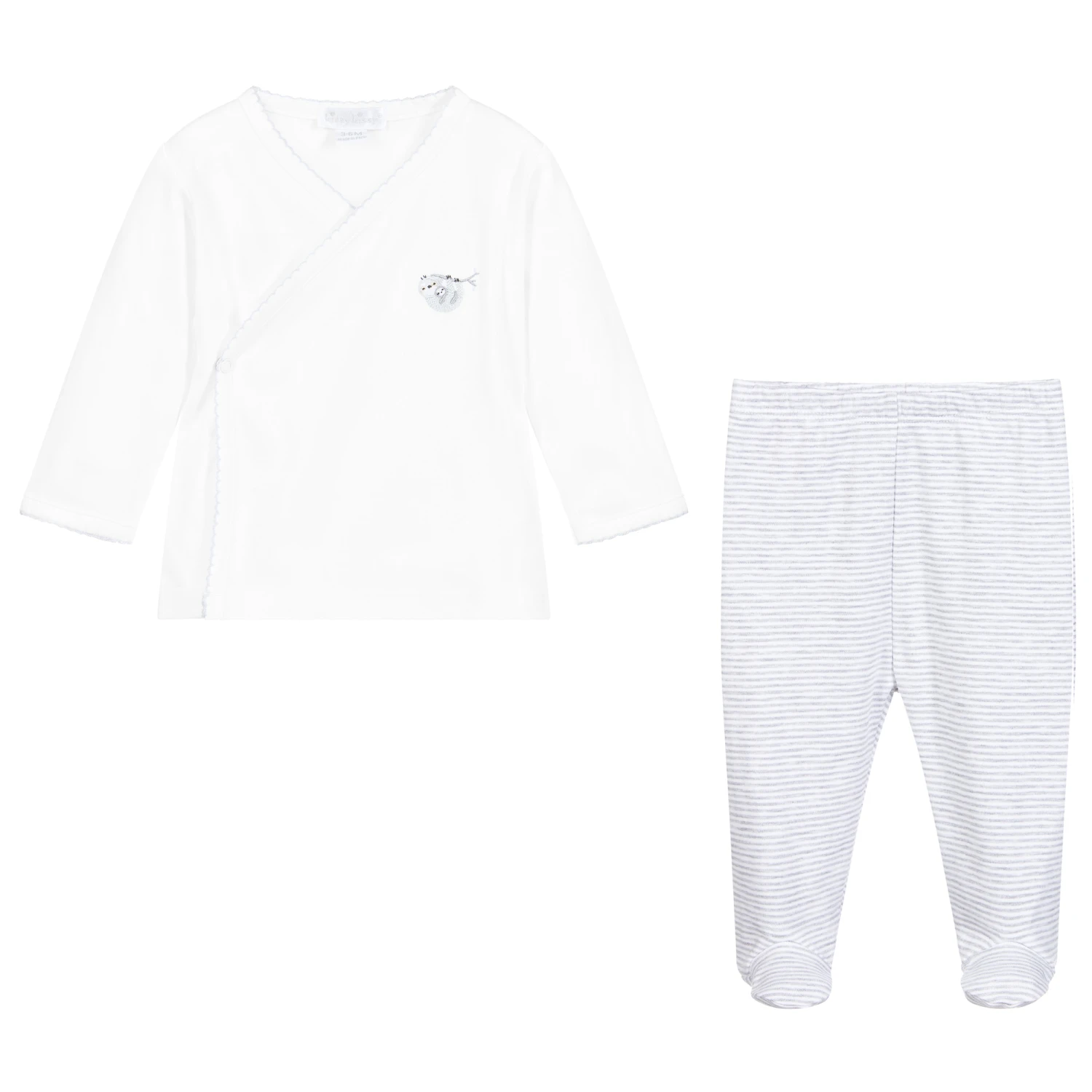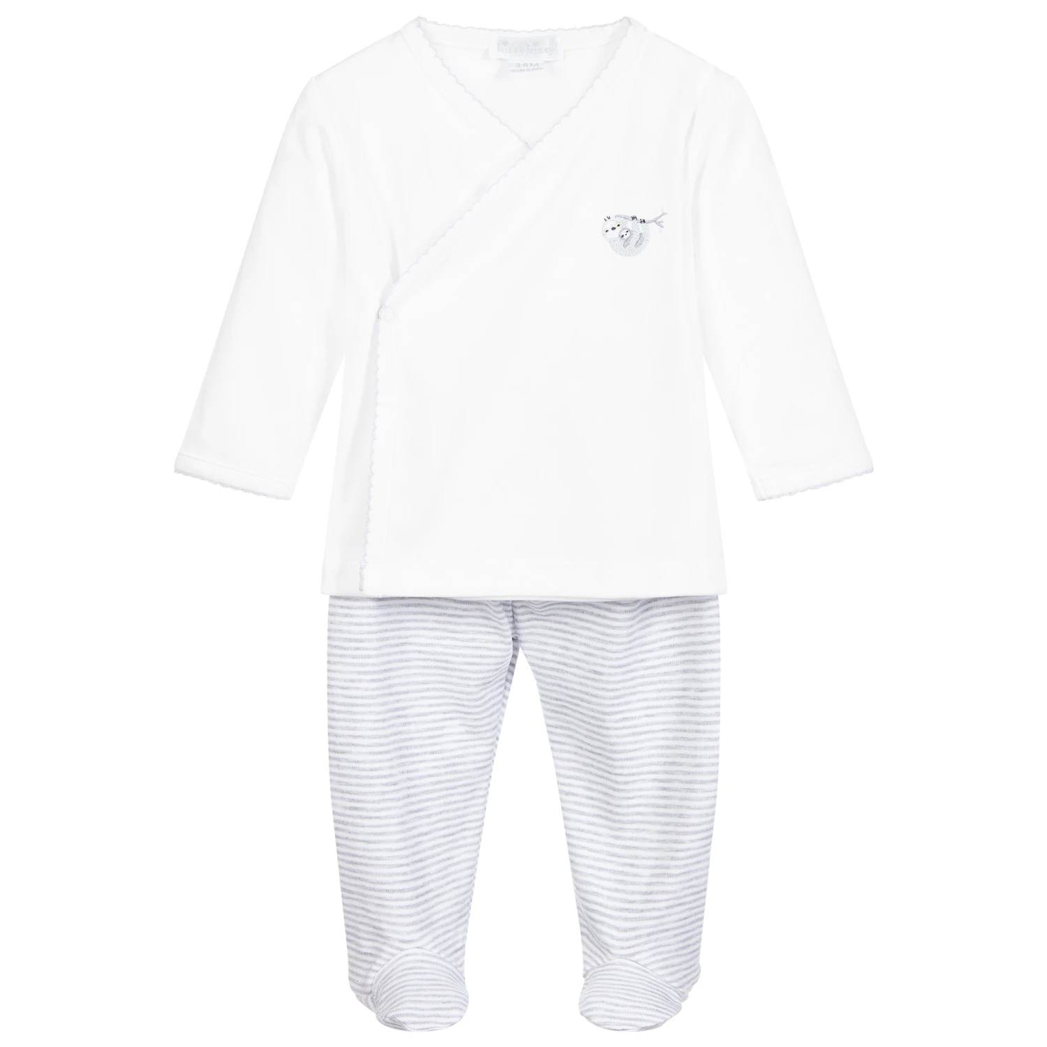 A two piece babygrow by Kissy Kissy, in white with grey stripes and cute sloth embroidery. Made in super soft Pima cotton, the wrap top has grey embroidered trim and the bottoms have covered feet to keep precious toes warm and comfortable.
