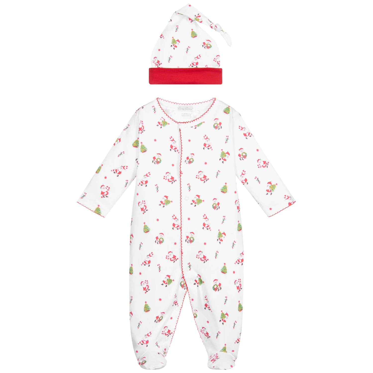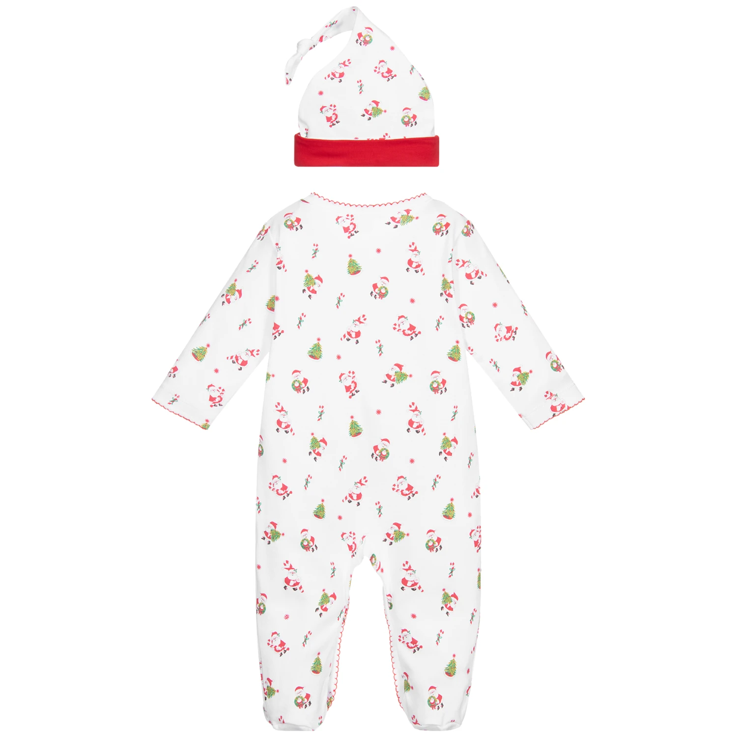 White babygrow and hat set for girls and boys by Kissy Kissy, made in super soft Pima cotton jersey, with a cute Santa Claus print and red trims.