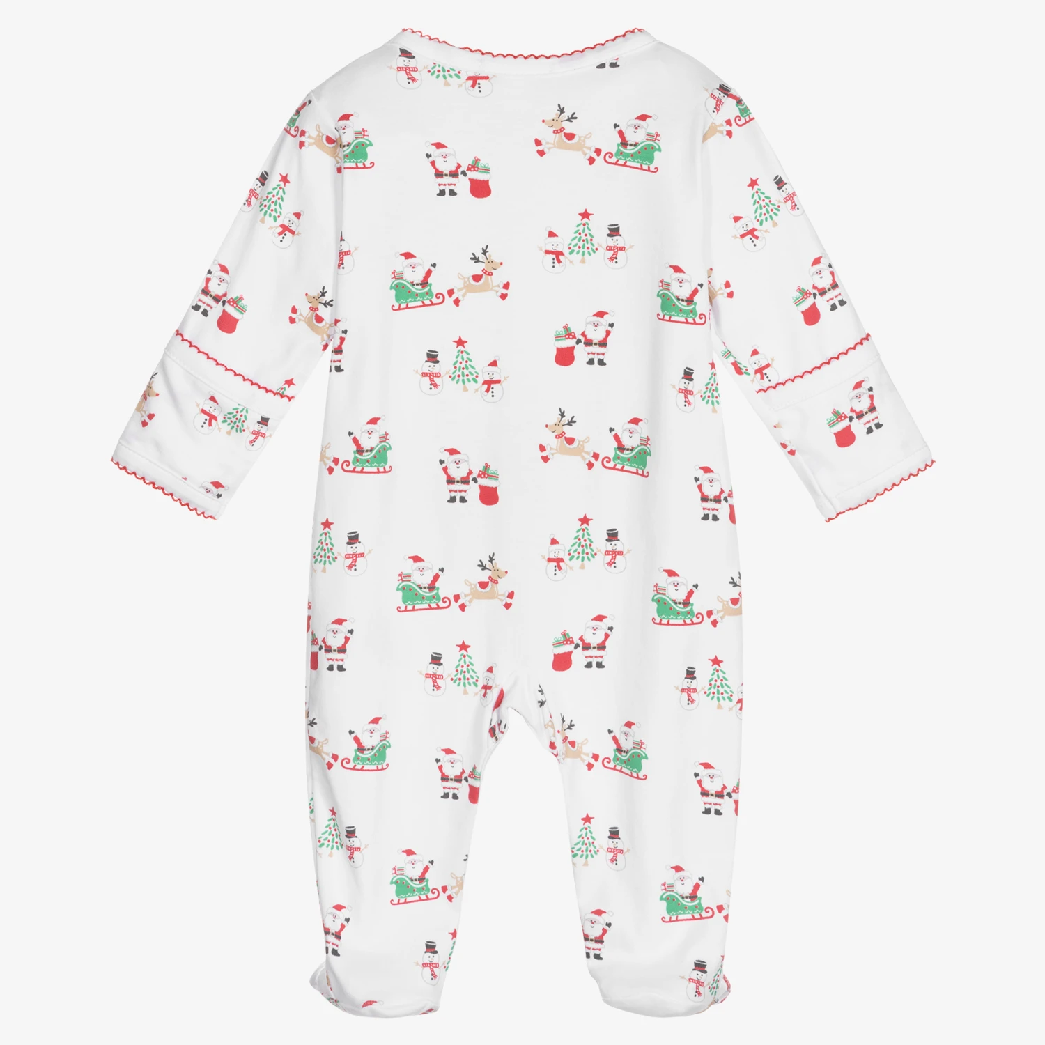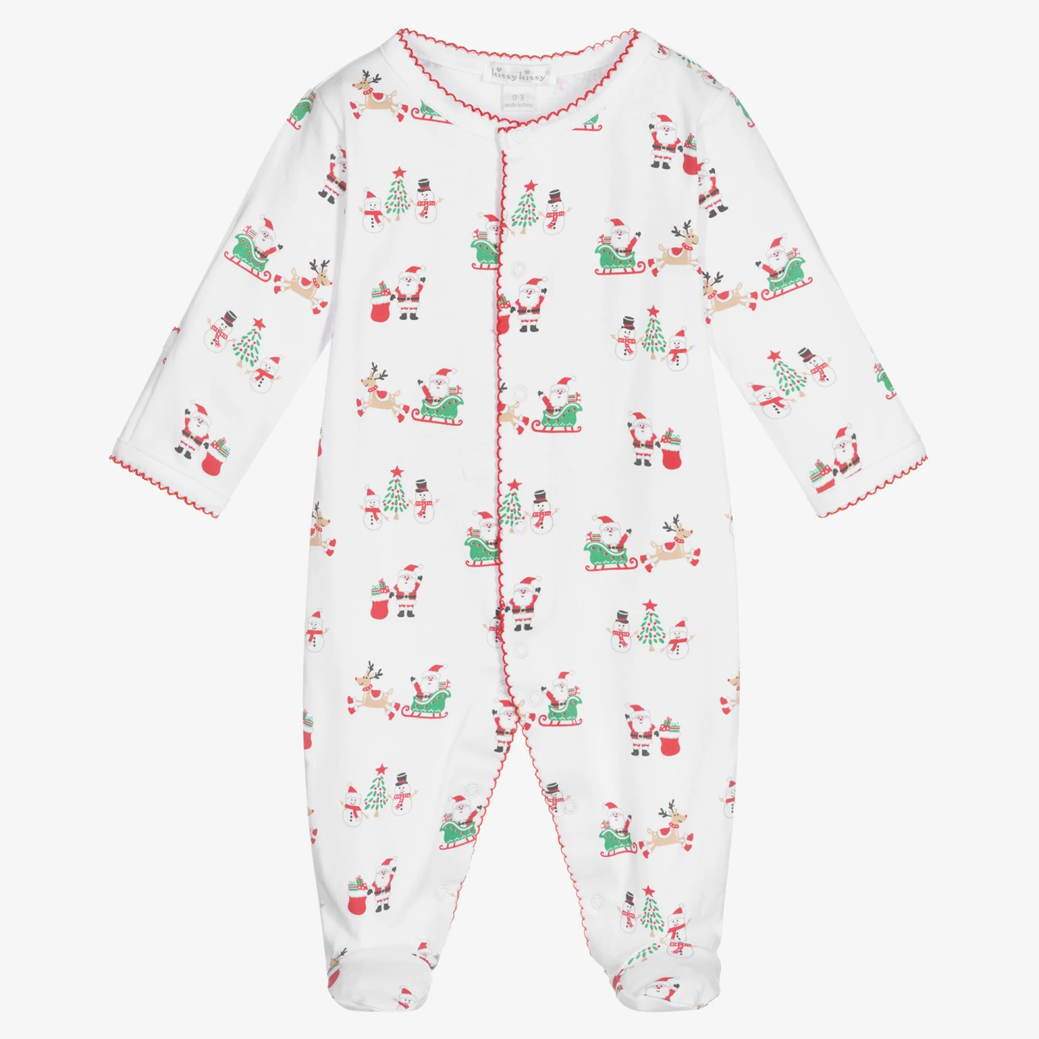 Sweet white babygrow for boys and girls, by Kissy Kissy. Made in luxuriously soft Pima cotton jersey, it has an adorable red and green snowmen and Santa Claus design all-over, and red embroidered picot trims.