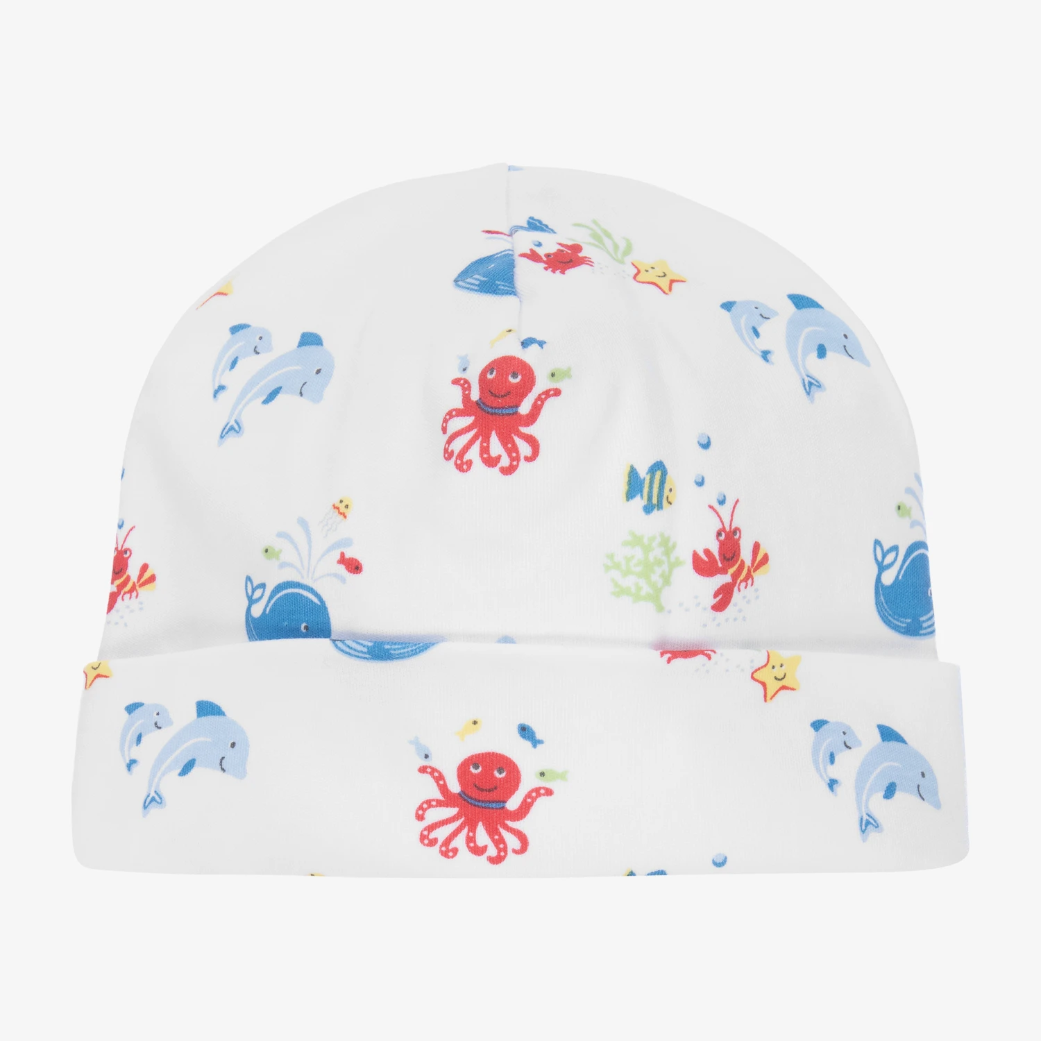 White double layer hat for baby boys by Kissy Kissy, made in super soft and stretchy Pima cotton jersey. It has a colourful sealife print and a turned up brim.