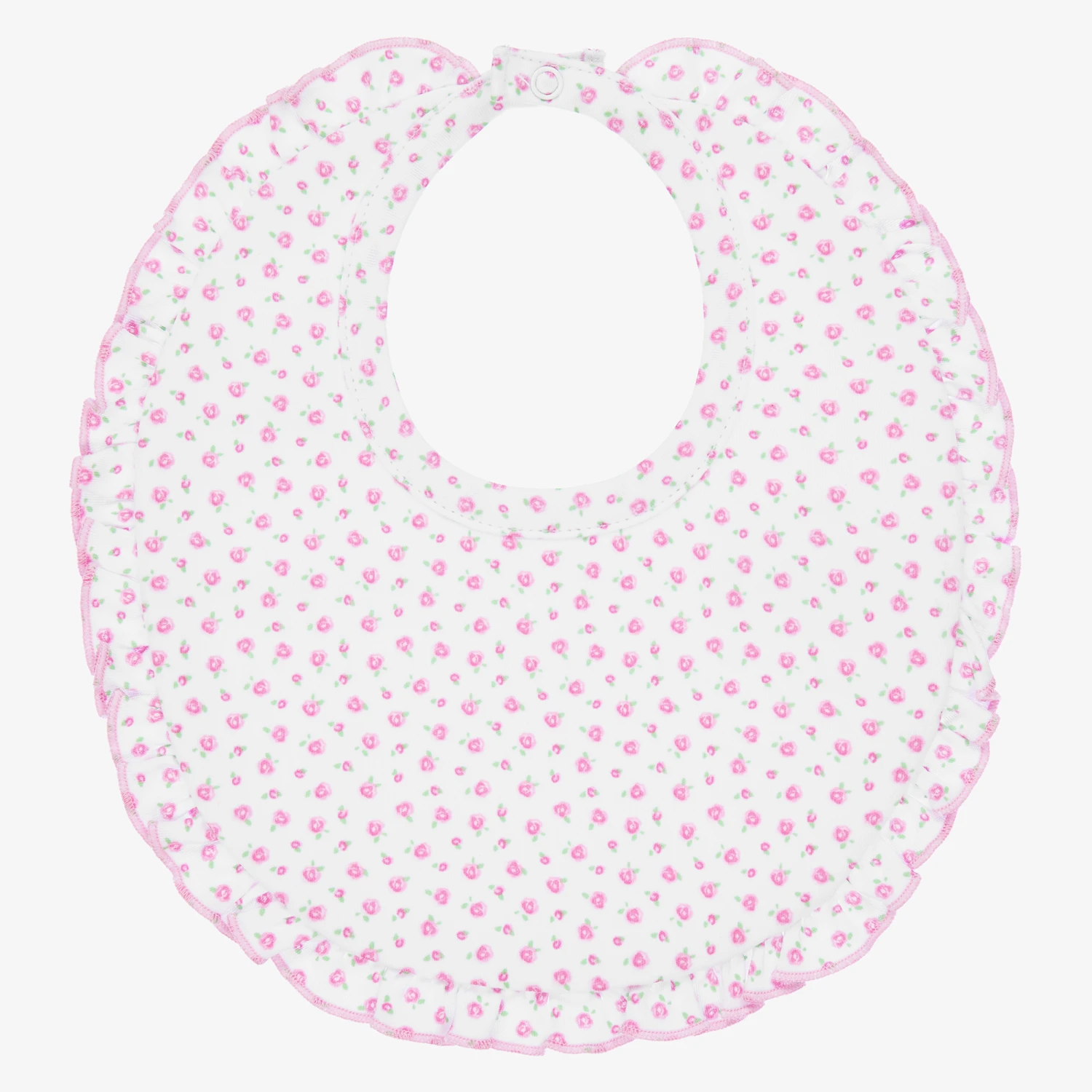 Cute white bib for baby girls by Kissy Kissy, made in luxuriously soft Pima cotton jersey. Patterned with a pink rosebuds design all-over, it has a sweet pink ruffle trim, and a popper fastening on the back.