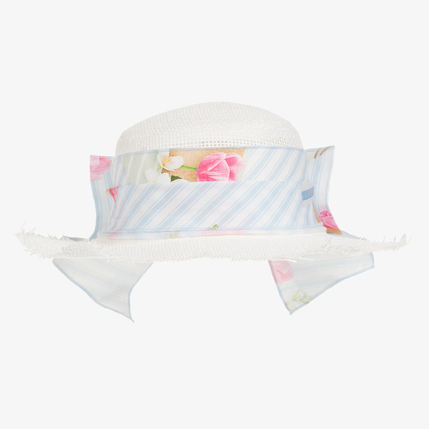 Pretty ivory straw hat for baby girls by Lapin House, with a blue striped sash and bow, patterned with pink tulips. Great for sunny days, the brim has raw edges and shades the face.