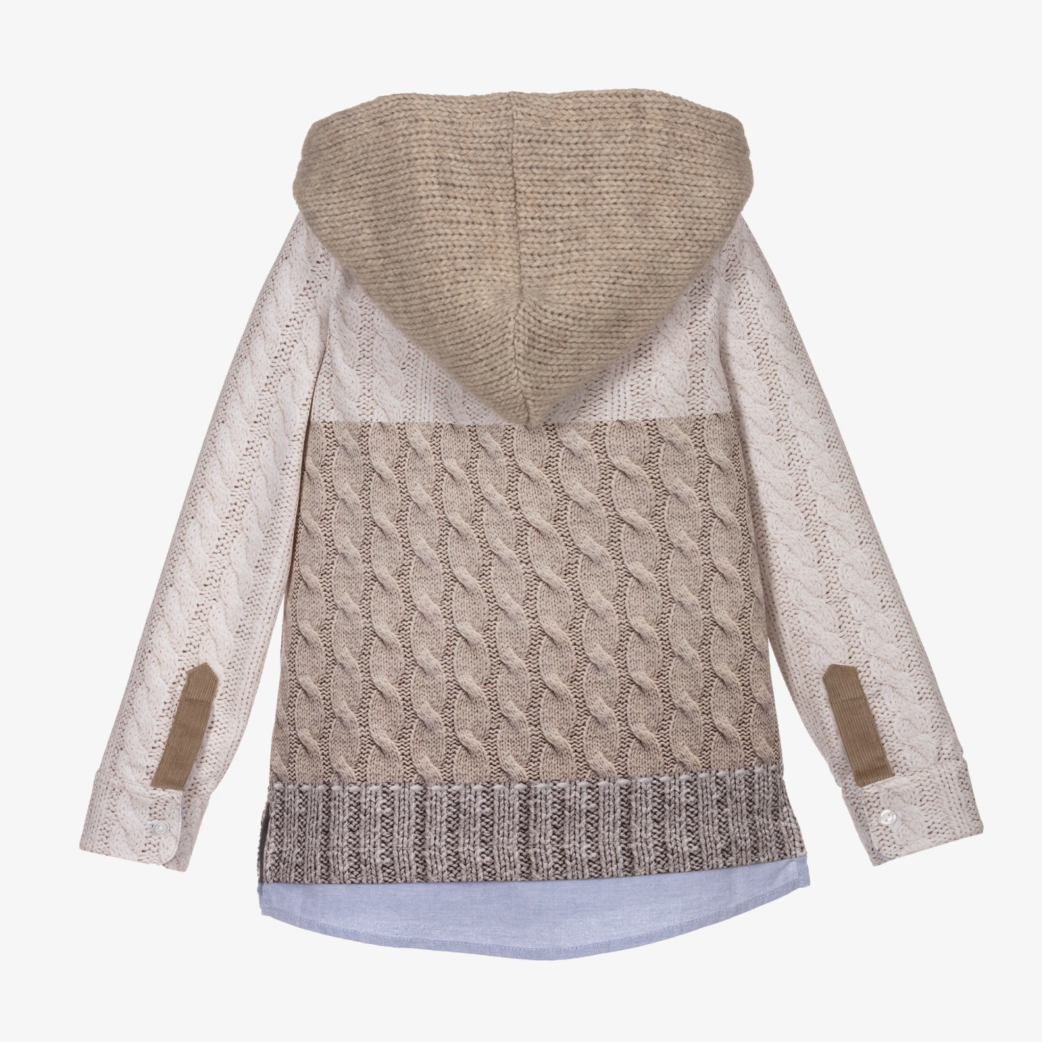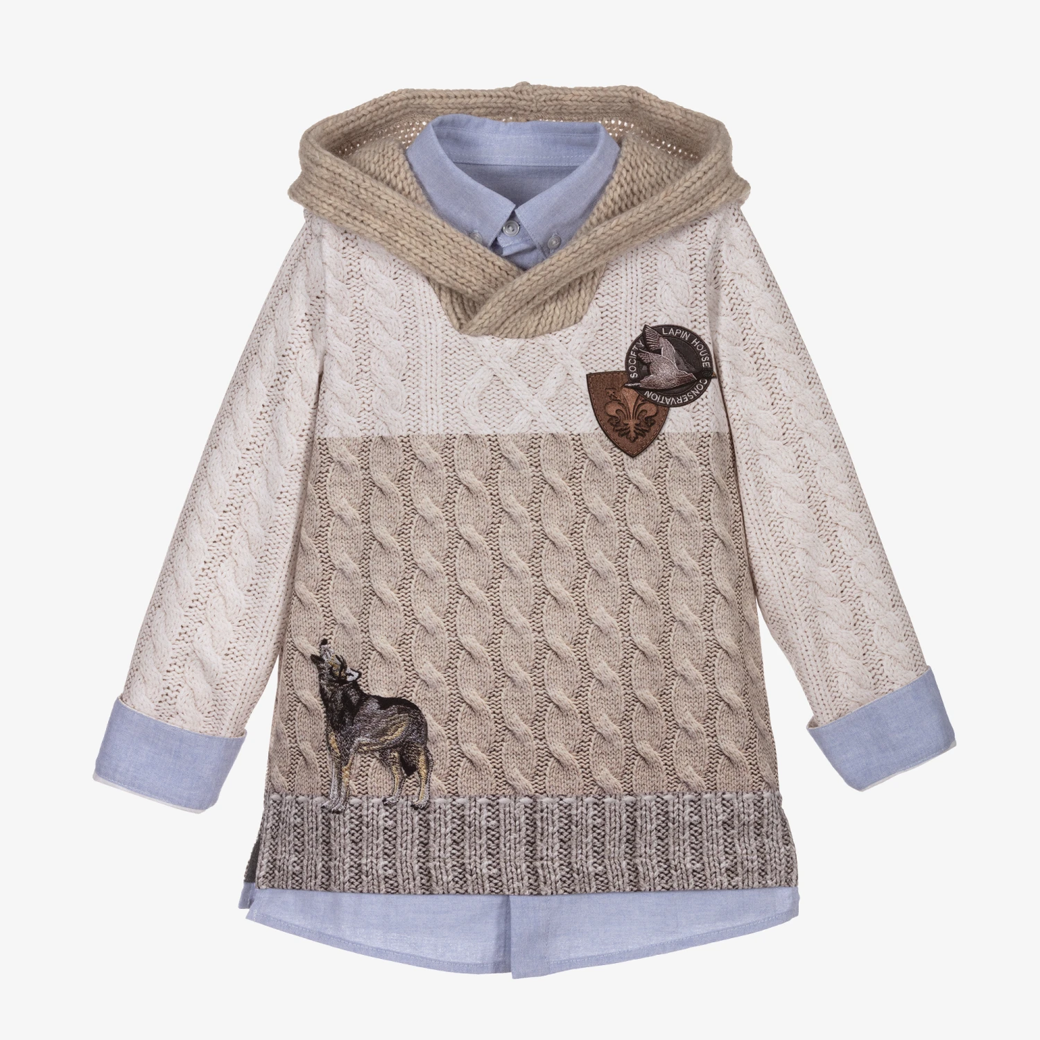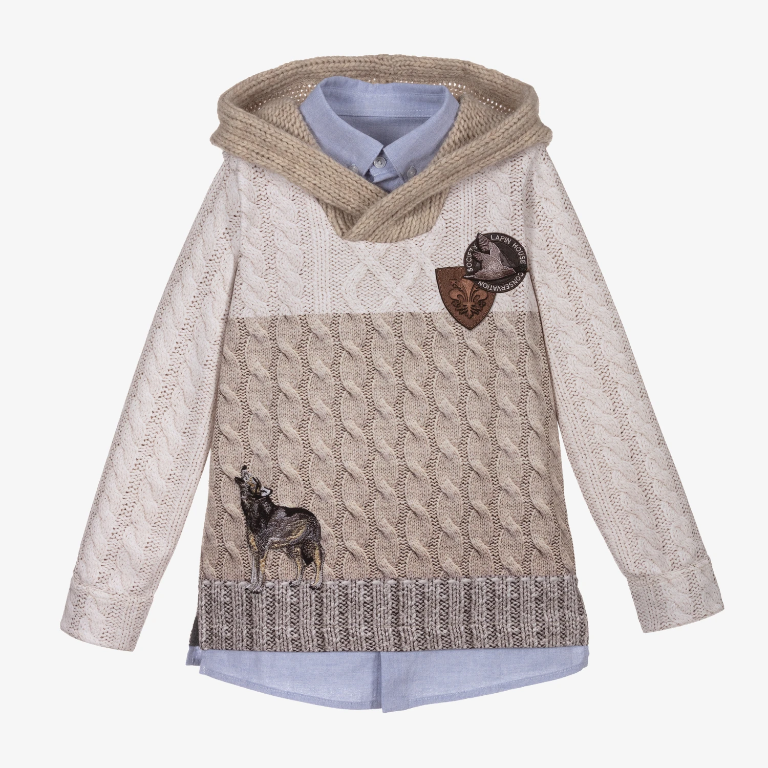 Little boys beige sweatshirt with a knitted hood by Lapin House. The body is made in stretchy cotton jersey and has a cable knit print. There are fitted ‘shirt’ style collar, cuffs and hem and the inside has a soft, brushed fleece feel.