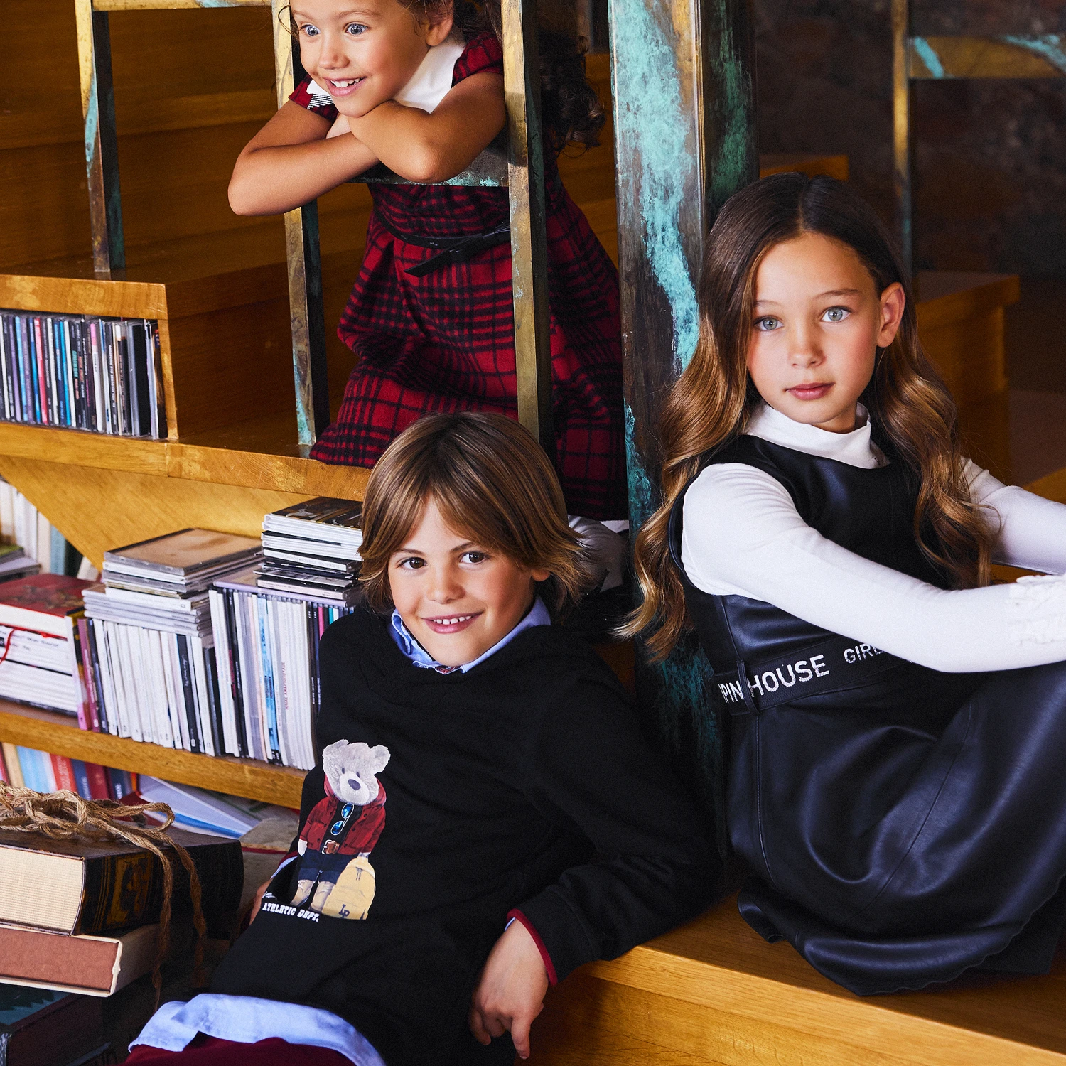 Black hooded sweatshirt for boys by Lapin House, with the appearance of a two piece. Made in comfortable cotton jersey with a fleecy inside, there is a college teddy bear printed on the front. It has an Oxford cotton, button-fastening shirt insert around the neck in pale blue, with matching trims on the cuffs and hemline.